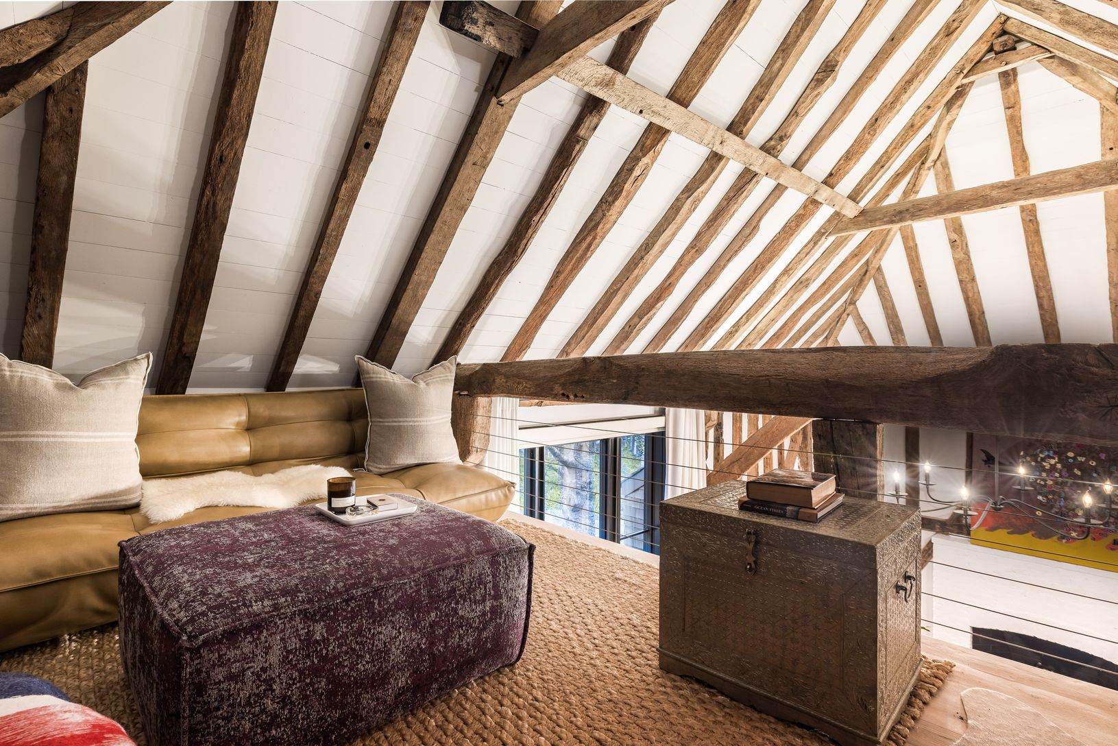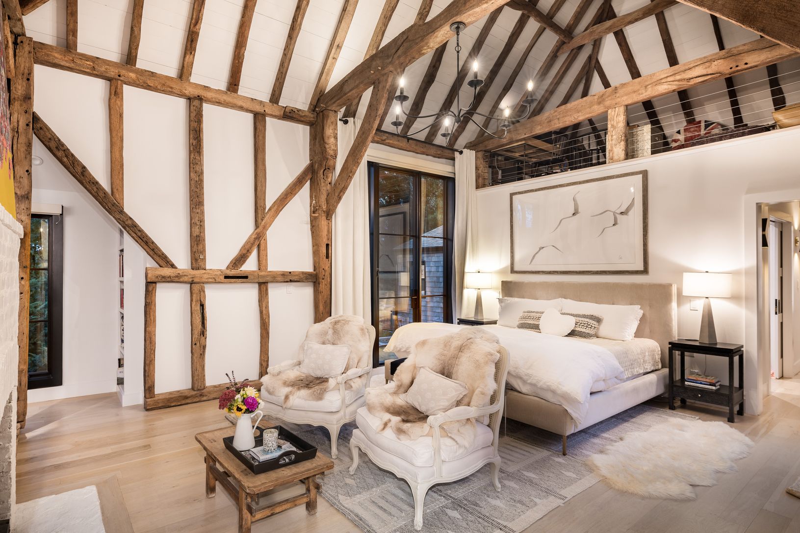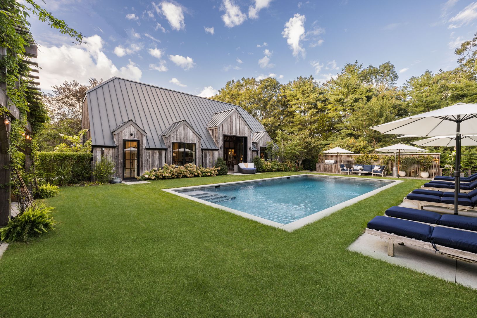 This exquisite Hamptons estate boasts a remarkable history, comprised of two 17th-century English barns meticulously imported and artfully reconstructed in the early 1980s, and extensively renovated in 2020. As you step into this opulent home, an awe-inspiring entrance awaits, captivating your senses with soaring steel casement windows that seamlessly harmonize with 12-foot retractable steel doors, effectively transforming a section of your ho