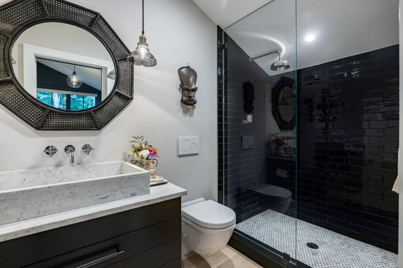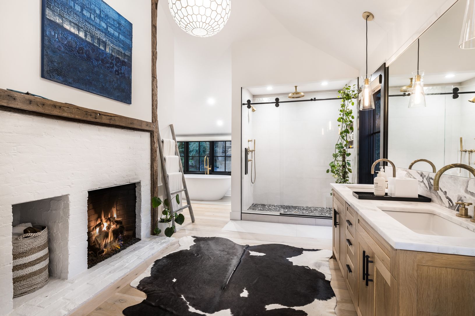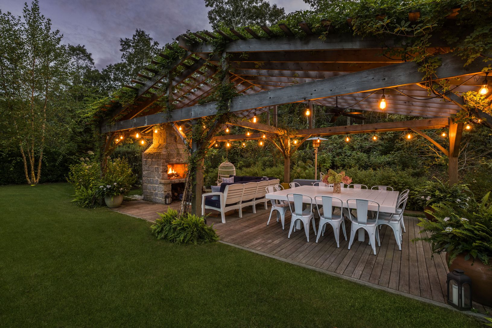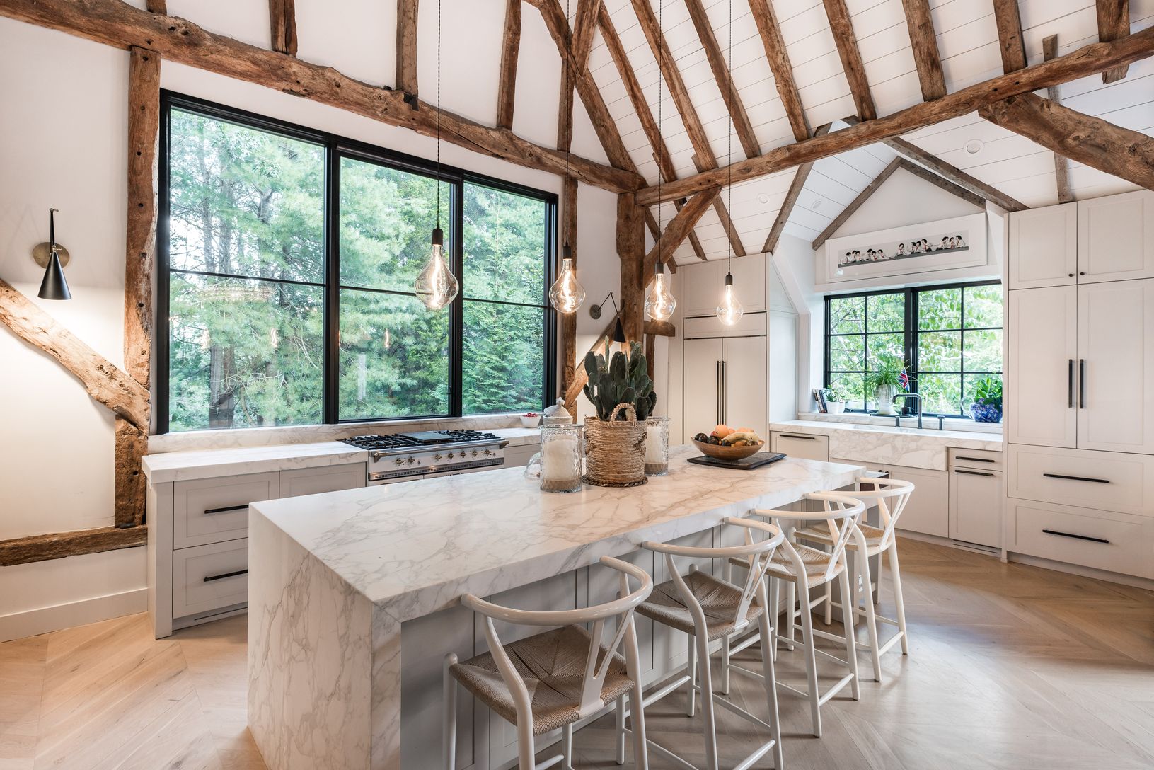 This exquisite Hamptons estate boasts a remarkable history, comprised of two 17th-century English barns meticulously imported and artfully reconstructed in the early 1980s, and extensively renovated in 2020. As you step into this opulent home, an awe-inspiring entrance awaits, captivating your senses with soaring steel casement windows that seamlessly harmonize with 12-foot retractable steel doors, effectively transforming a section of your ho