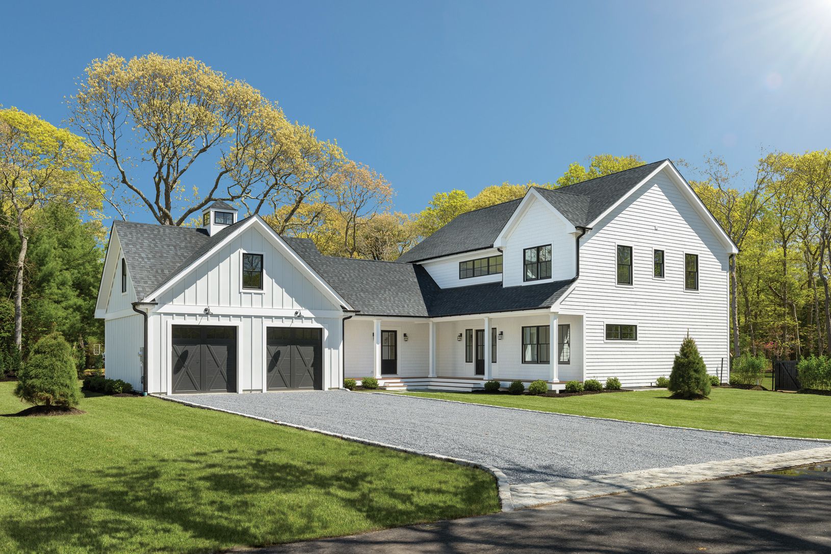 Light-filled new construction transitional home on .41+/- acre in the Village of Westhampton Beach presents a sophisticated contemporary barn-style exterior, with cedar-shingled walls and a cupola atop the garage. Inside are 2,500+/- sq. ft. of bright living space with 21st century amenities, four bedrooms and four baths. Enter from the covered front porch to a two-story entry hall leading to the great room with gas fireplace and glass doors t