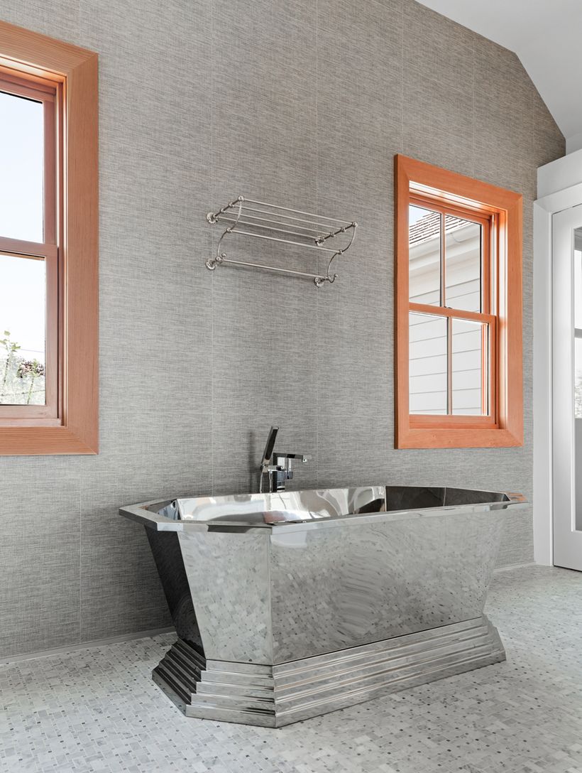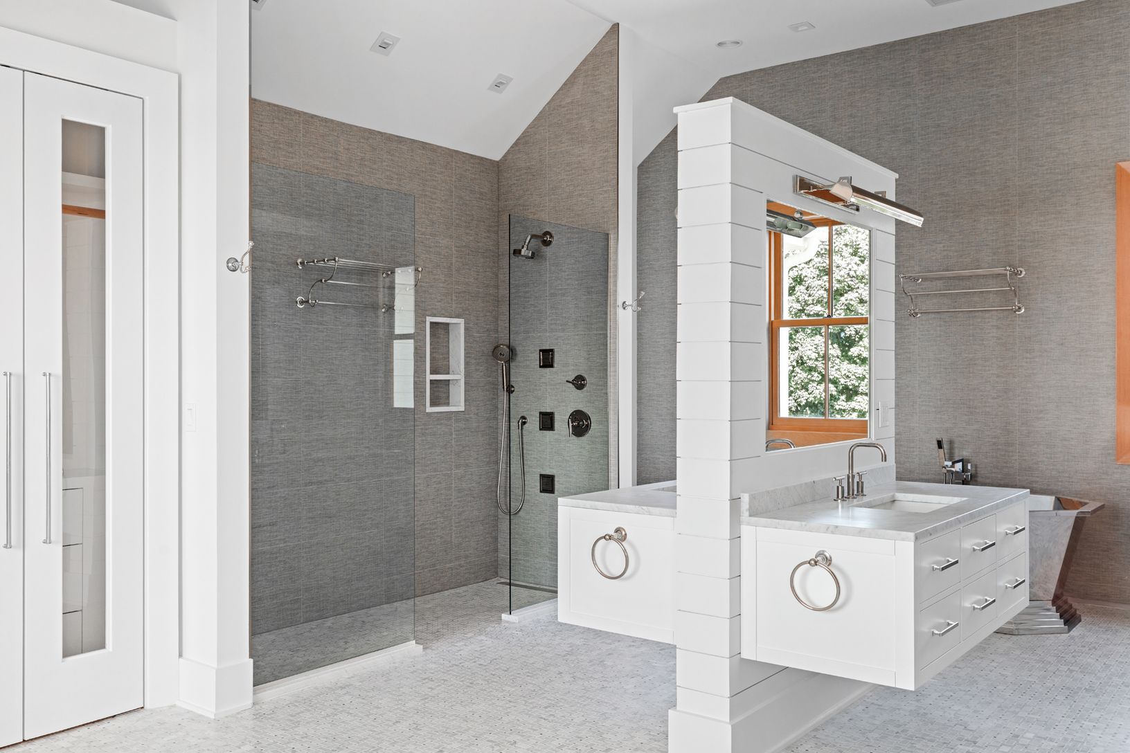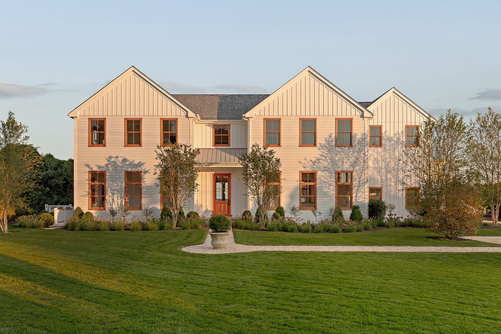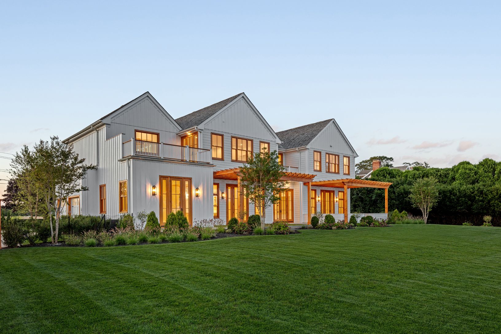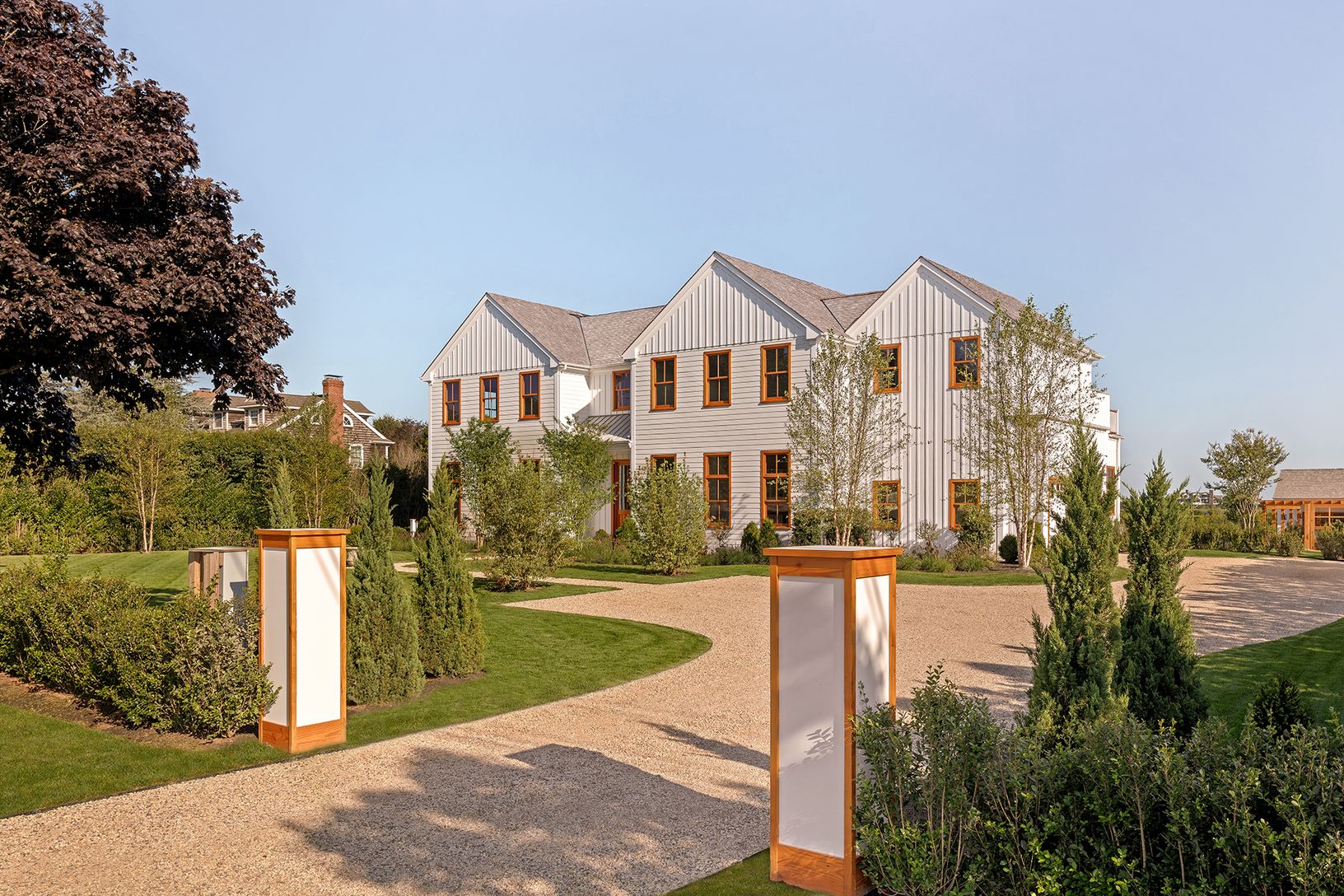 Landscape design by W. Dean Gomolka complements the home's classic coastal architecture and finely tailored interiors. White board-and-batten siding, custom