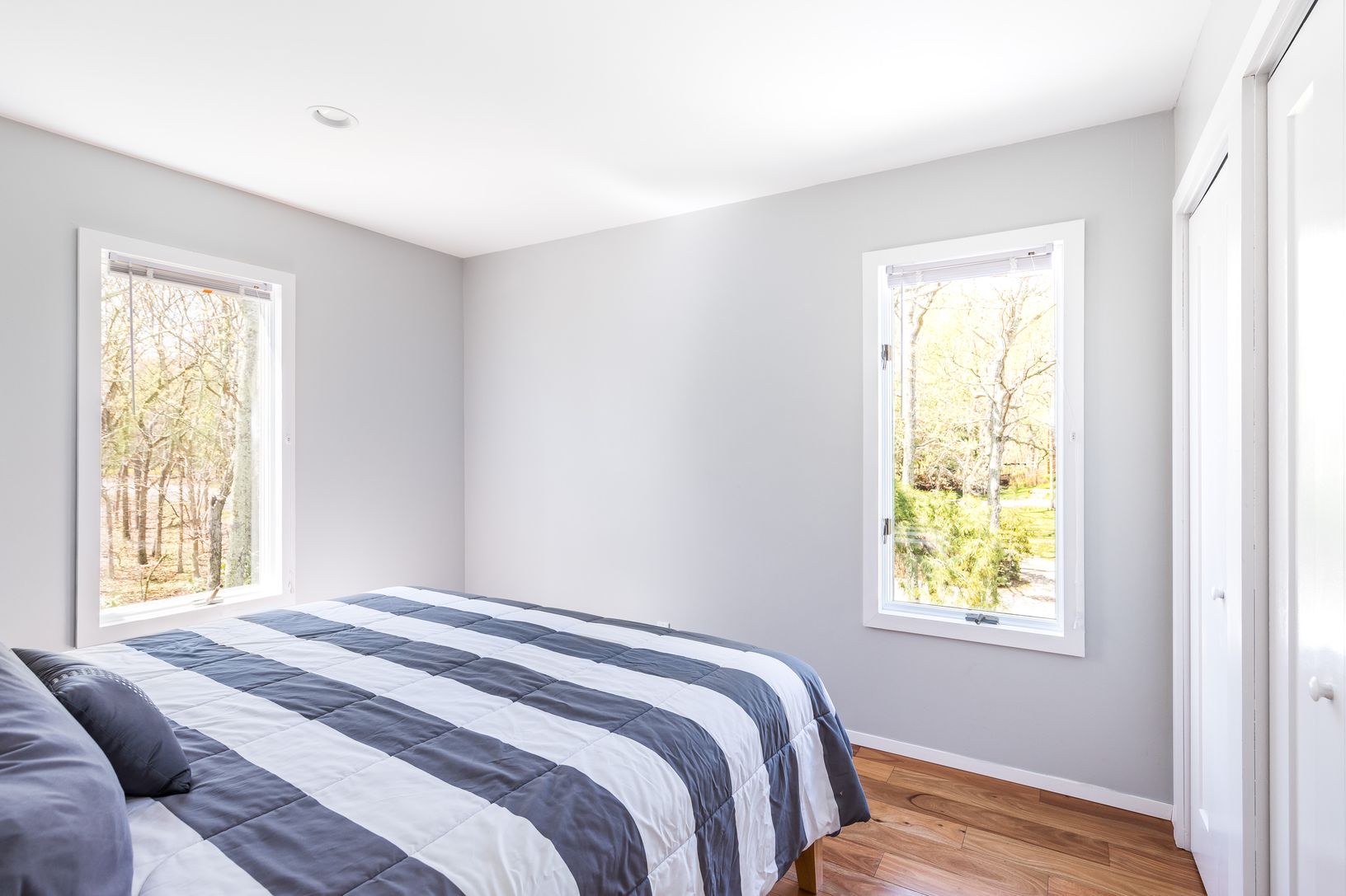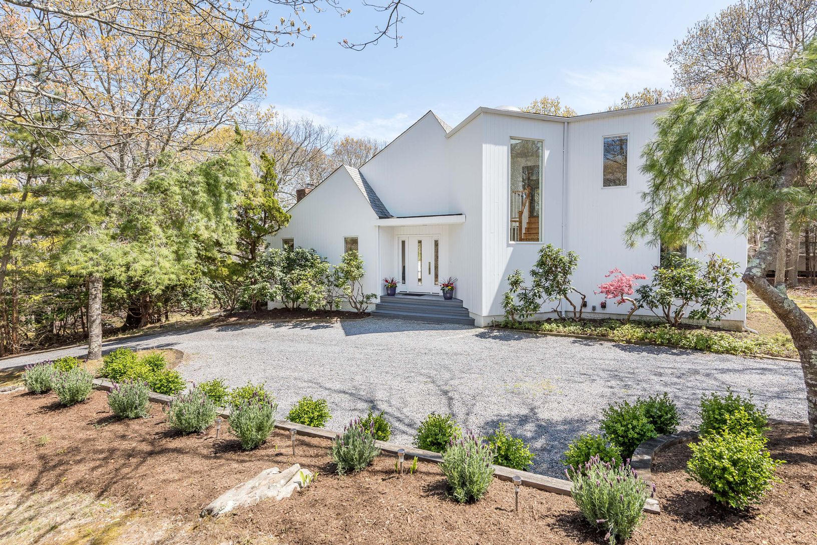 Fully renovated and ready for an immediate move in, this contemporary style four bedroom, three bath home with bonus room is located at the end of a desirable private cul-de-sac just three miles to East Hampton village. This light-filled home features a double height entry foyer with custom staircase and overhead oculus skylight. The open layout welcomes you into the living area, with its high ceilings and mother of pearl gas fireplace overloo