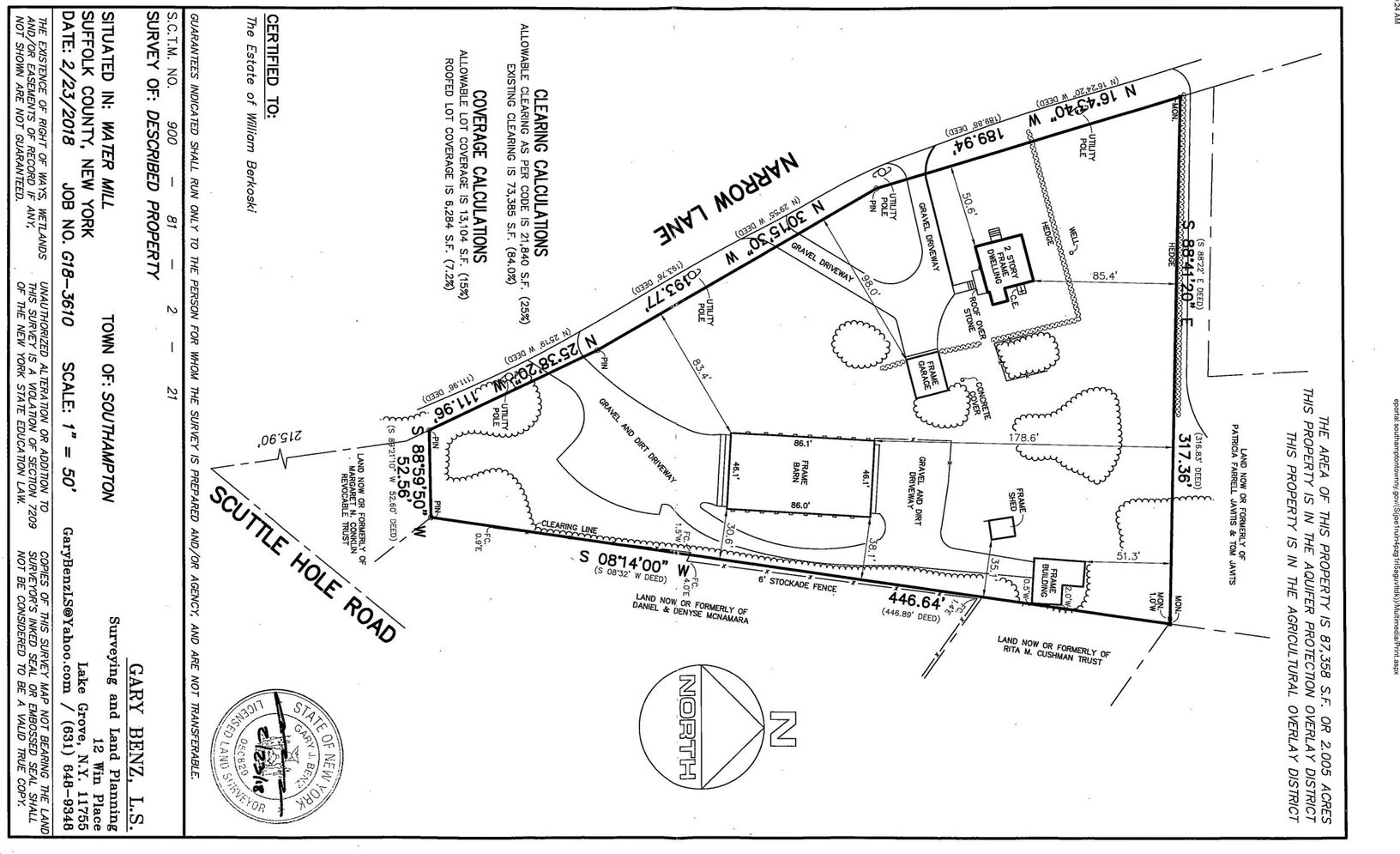 Nestled in the heart of Water Mill Farm and Horse Country, this distinctive two-acre property offers nearly unlimited potential. Currently featuring a small home, a spacious storage barn, a detached single-car garage, a shed, and an accessory structure, the property presents an opportunity for transformation. With ample space available, the property can accommodate a significant new home, a pool, a pool house, and possibly a tennis court. All