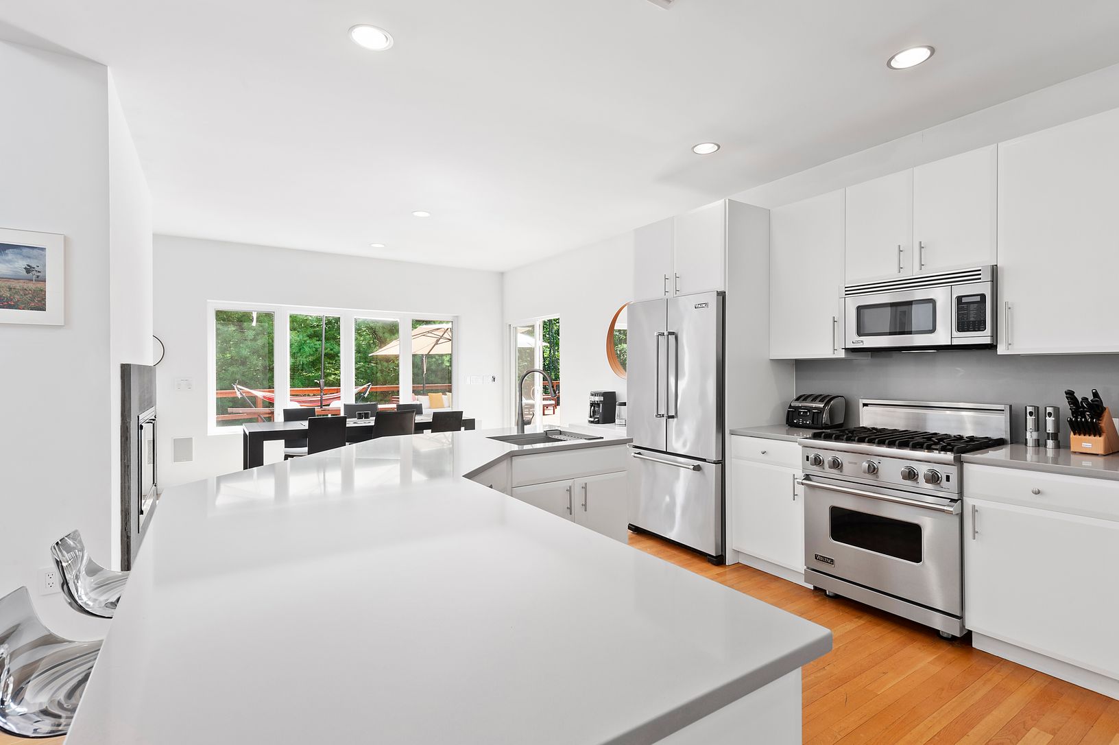 This beautiful contemporary home is nestled on 4 acres, and comes equipped with 4 bedrooms, 3 full bathrooms, and an open kitchen plan that leads into the living and dining area with natural sunlight throughout. The double-sided wood burning fireplace is shared by the dining and living area, and there is a separate media room to spend time with company. The fully-equipped and newly renovated kitchen comes with a large island for eat in dining,