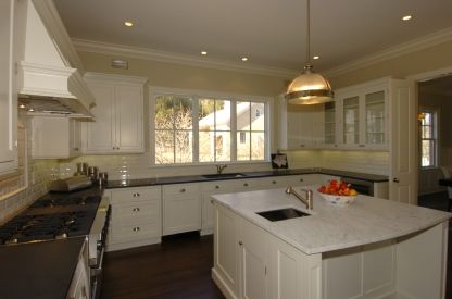 This custom new construction was sited to protect a 125 year old Maple tree in its backyard. Built by a very high end builder, this home offers custom woodwork, cabinets and built-ins throughout. Just inside the front door you are greeted by a grand entry foyer and dramatic staircase, which lead into the living room with double height ceilings, a fireplace with beautiful mantle. The kitchen features professional appliances, Carrera marble coun