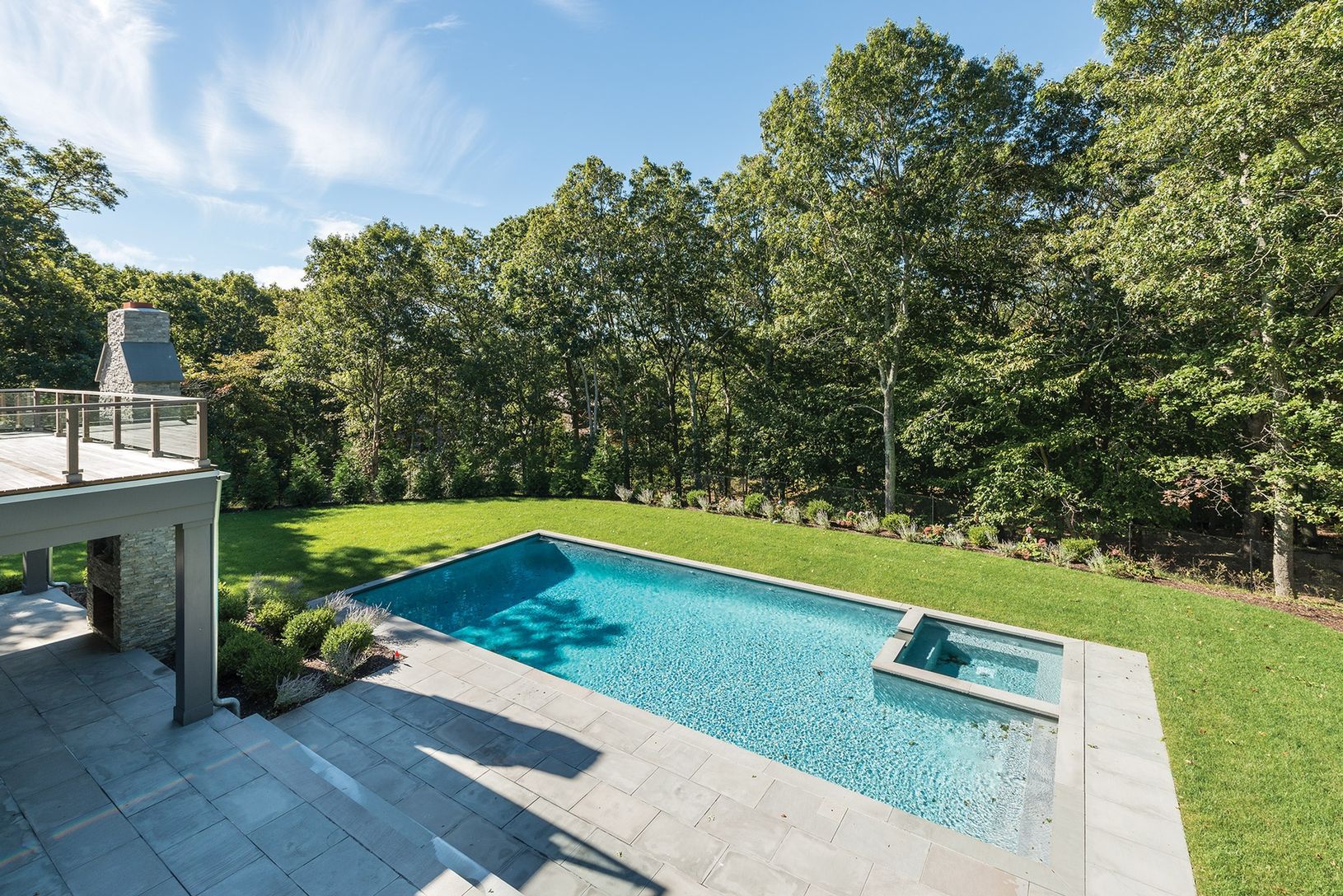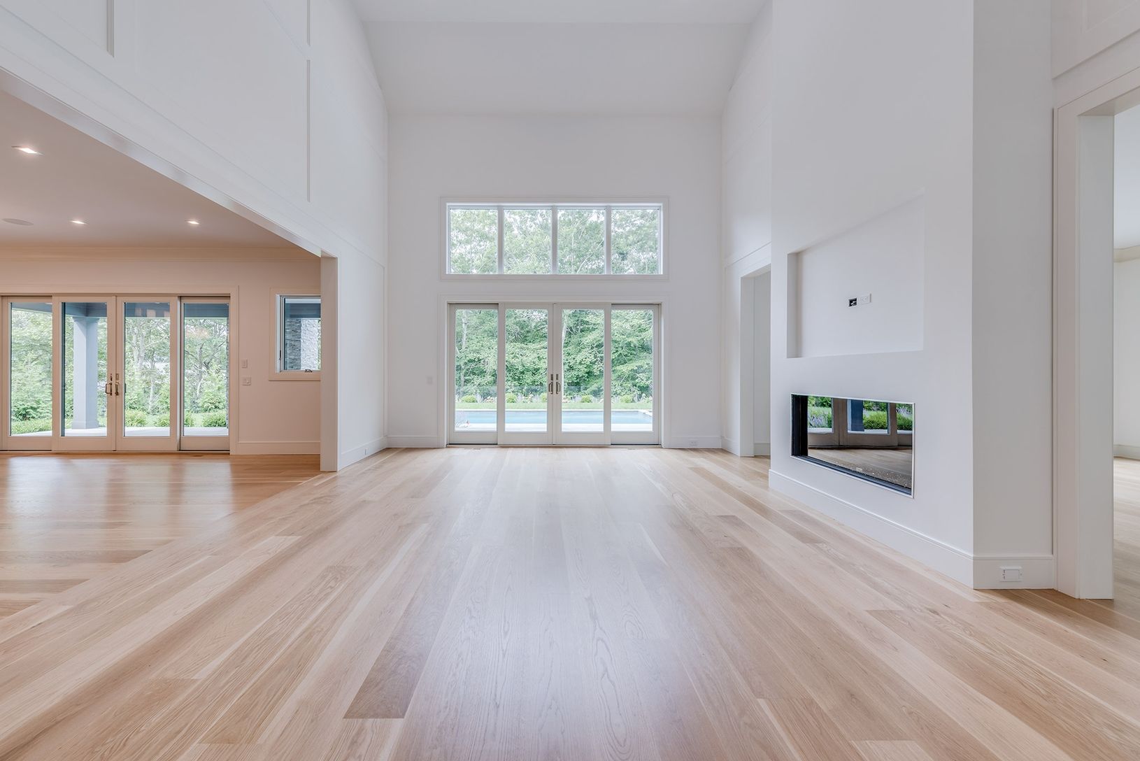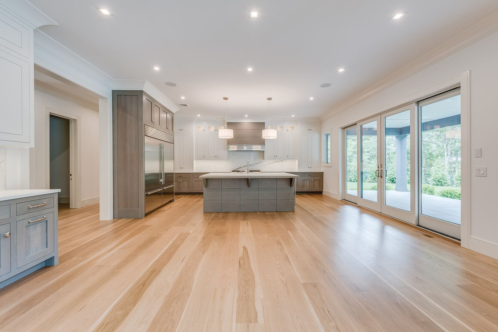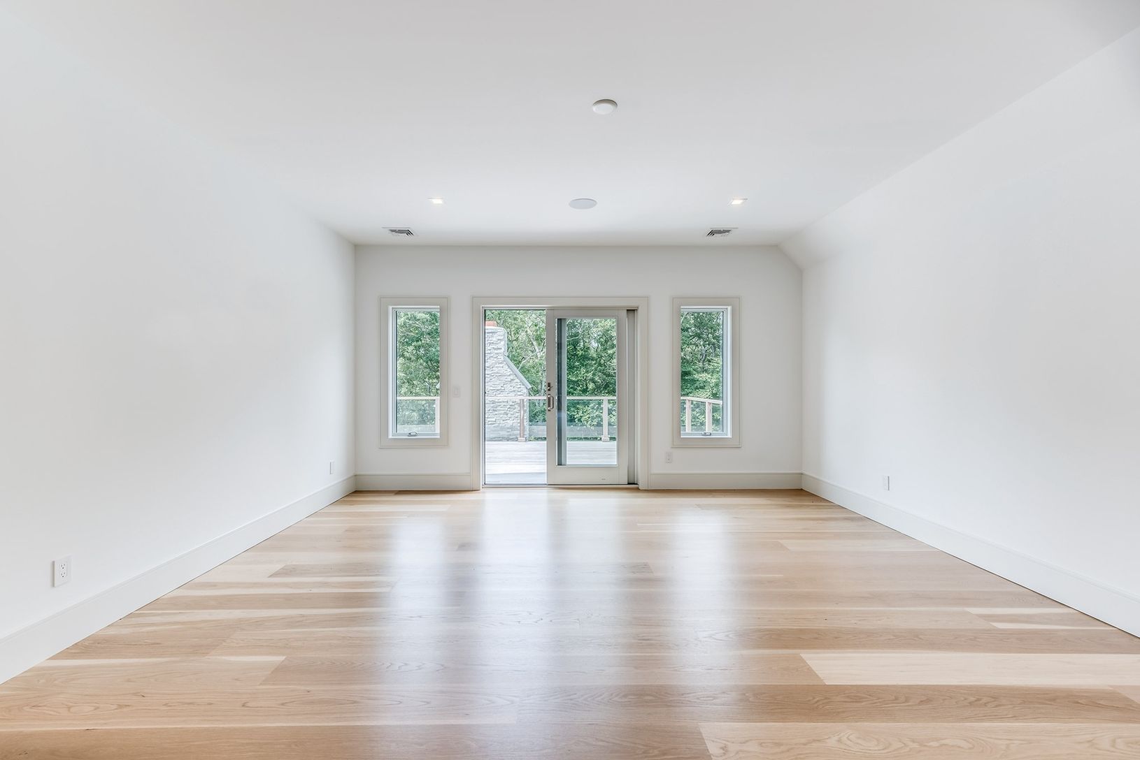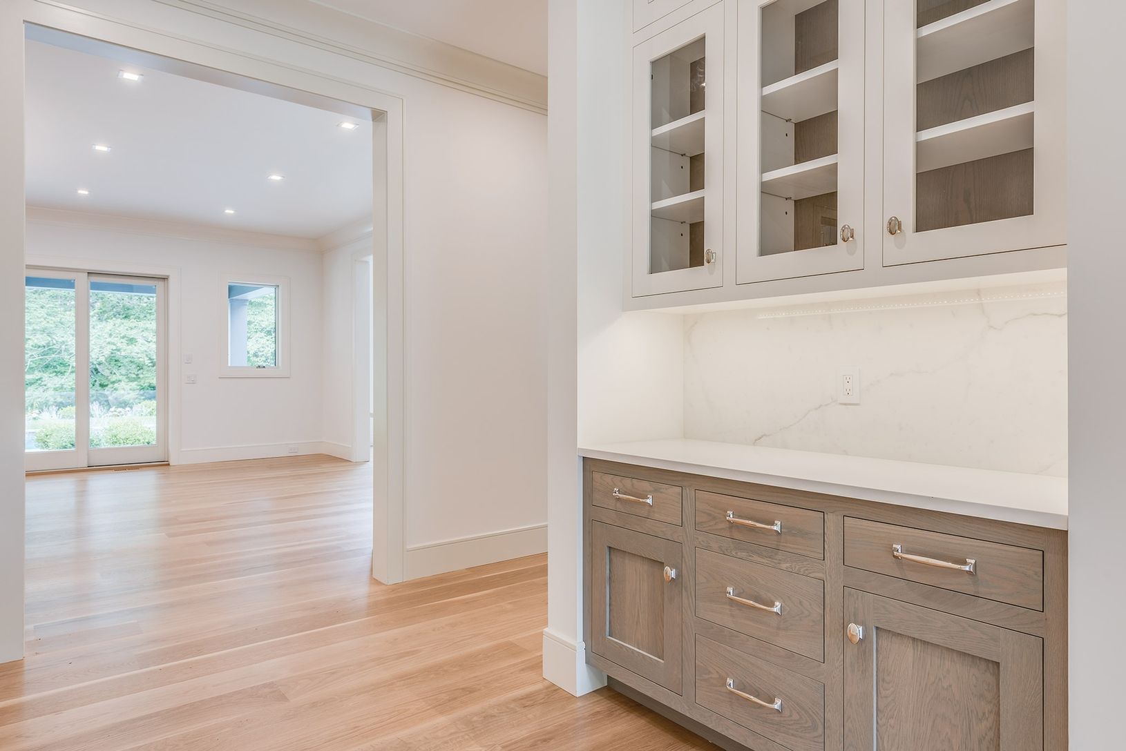 New construction 9,250+/- sq. ft. gabled traditional with modern farmhouse style on 1.8+/- acres in a bucolic setting offers both privacy and convenience. Enter the two story foyer with paneled walls and staircase with glass banister to light-filled, open living areas featuring walls of glass doors opening to a spacious bluestone patio and loggia with outdoor fireplace, media and speakers. The double height living room with soaring ceiling and