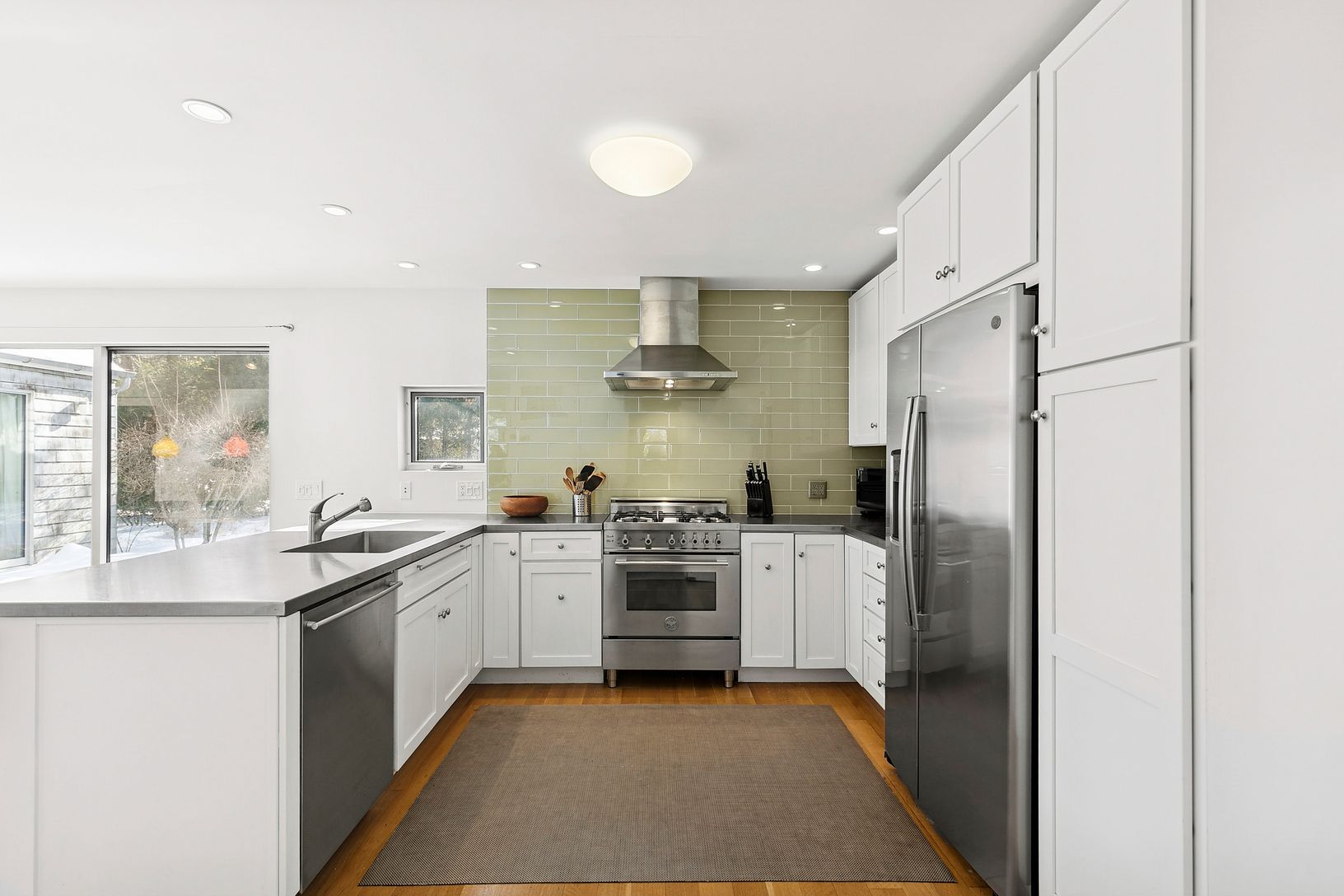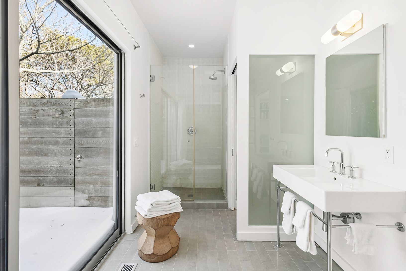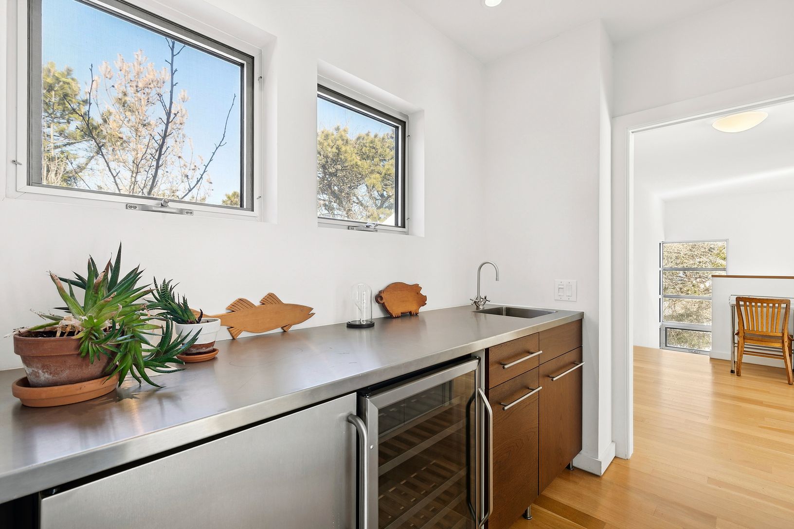 The two story home on .25 acres has been thoughtfully renovated with an open-concept kitchen, dining, and living area framed by floor-to-ceiling sliding glass doors that draw in so