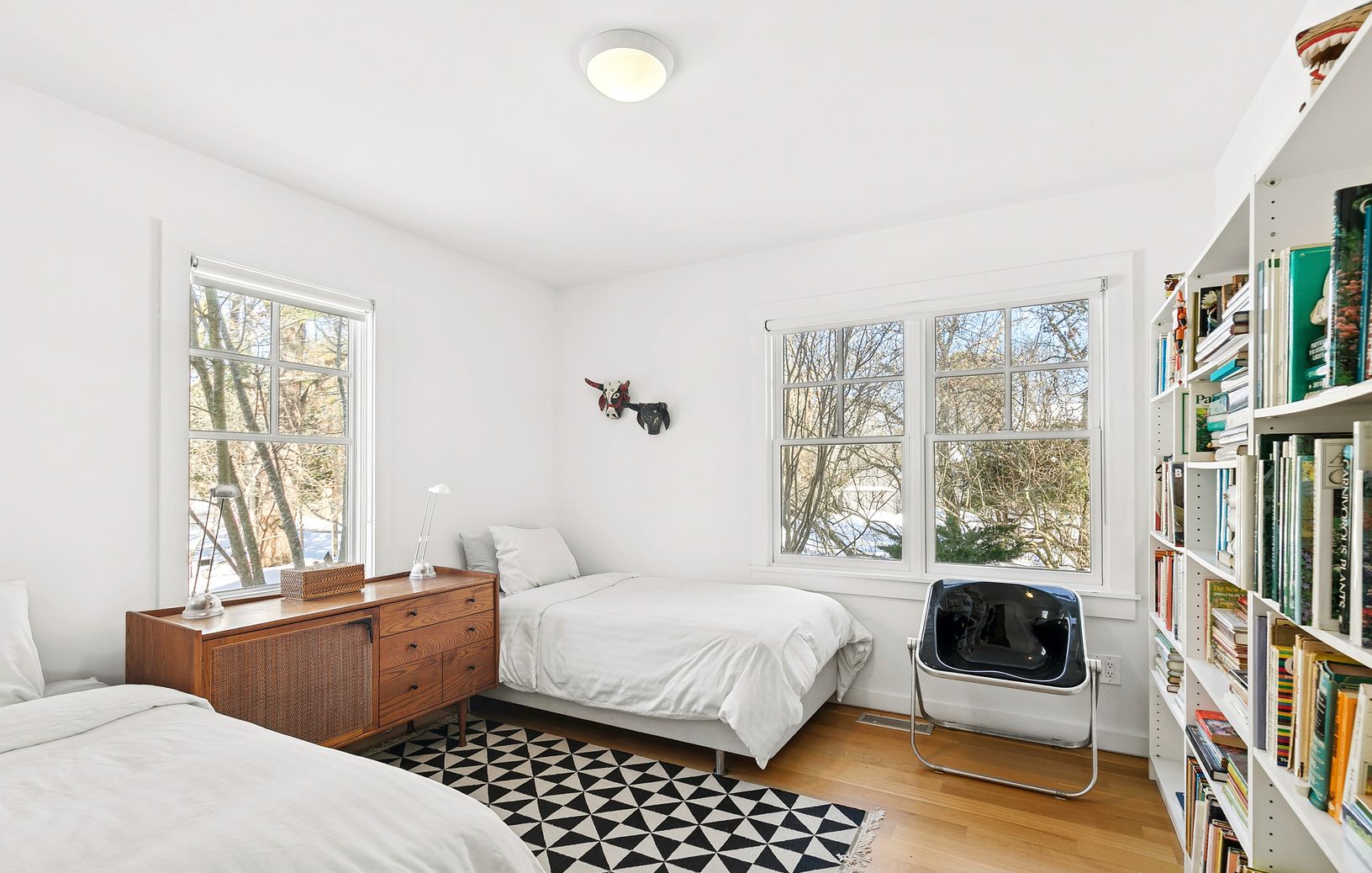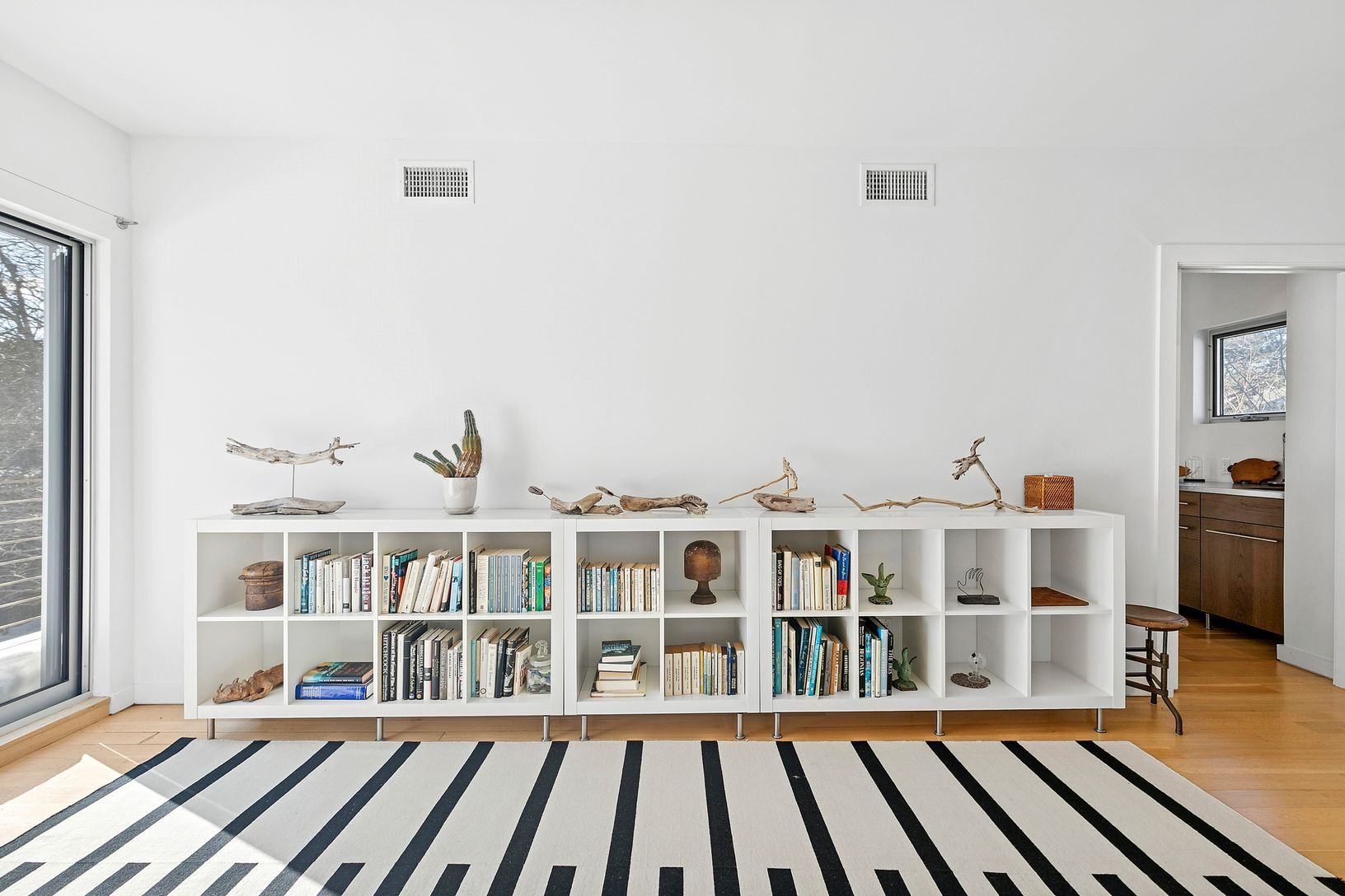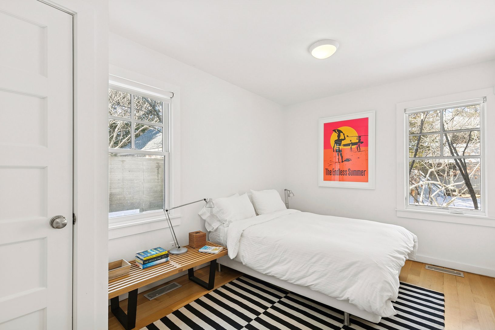 The two story home on .25 acres has been thoughtfully renovated with an open-concept kitchen, dining, and living area framed by floor-to-ceiling sliding glass doors that draw in so
