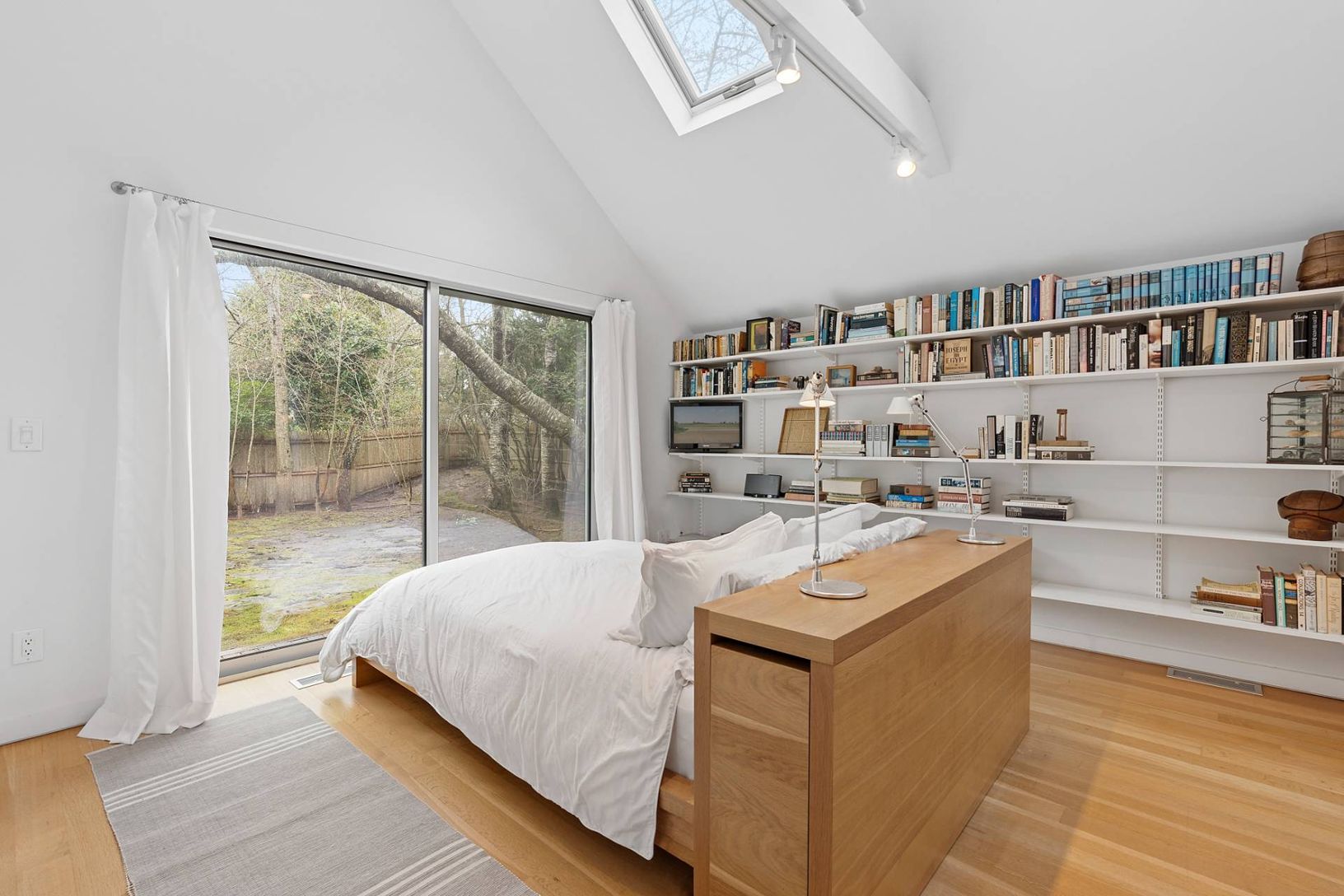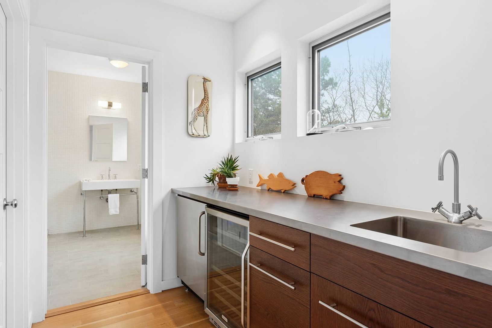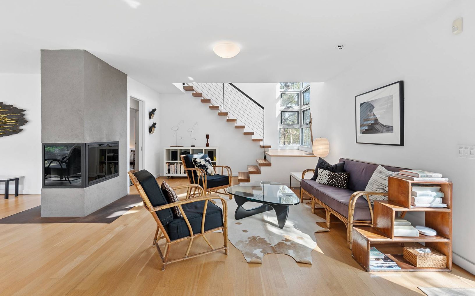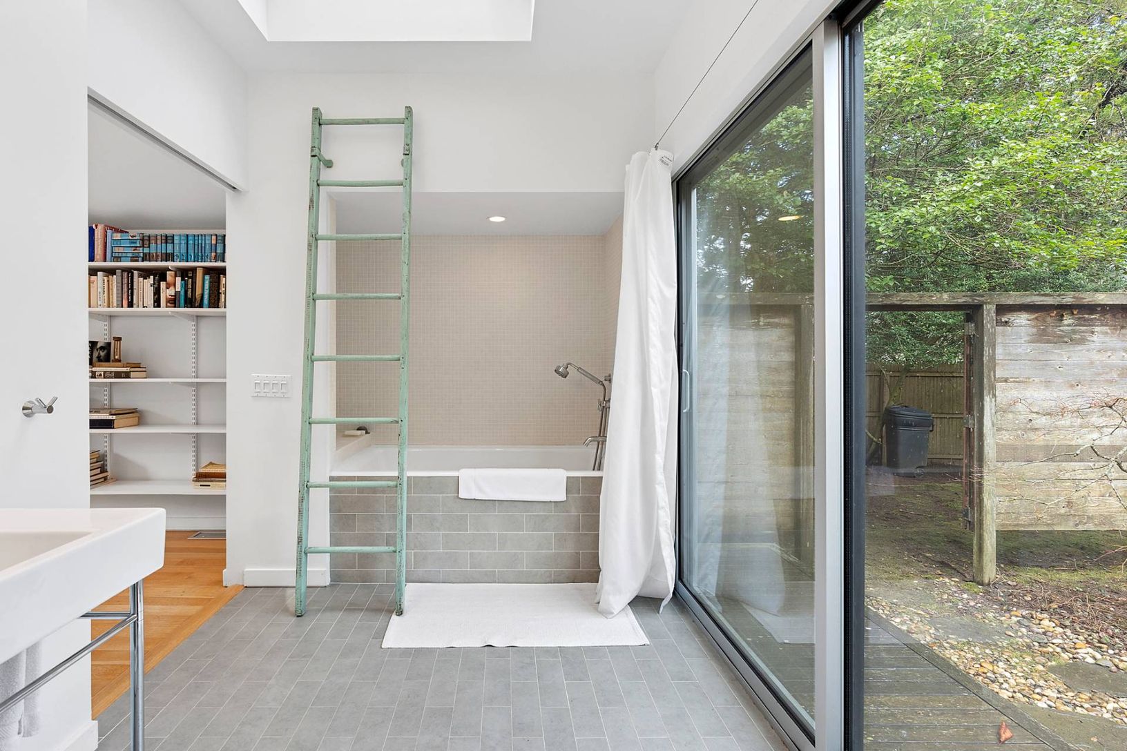The two story home on .25 acres has been thoughtfully renovated with an open-concept kitchen, dining, and living area framed by floor-to-ceiling sliding glass doors that draw in