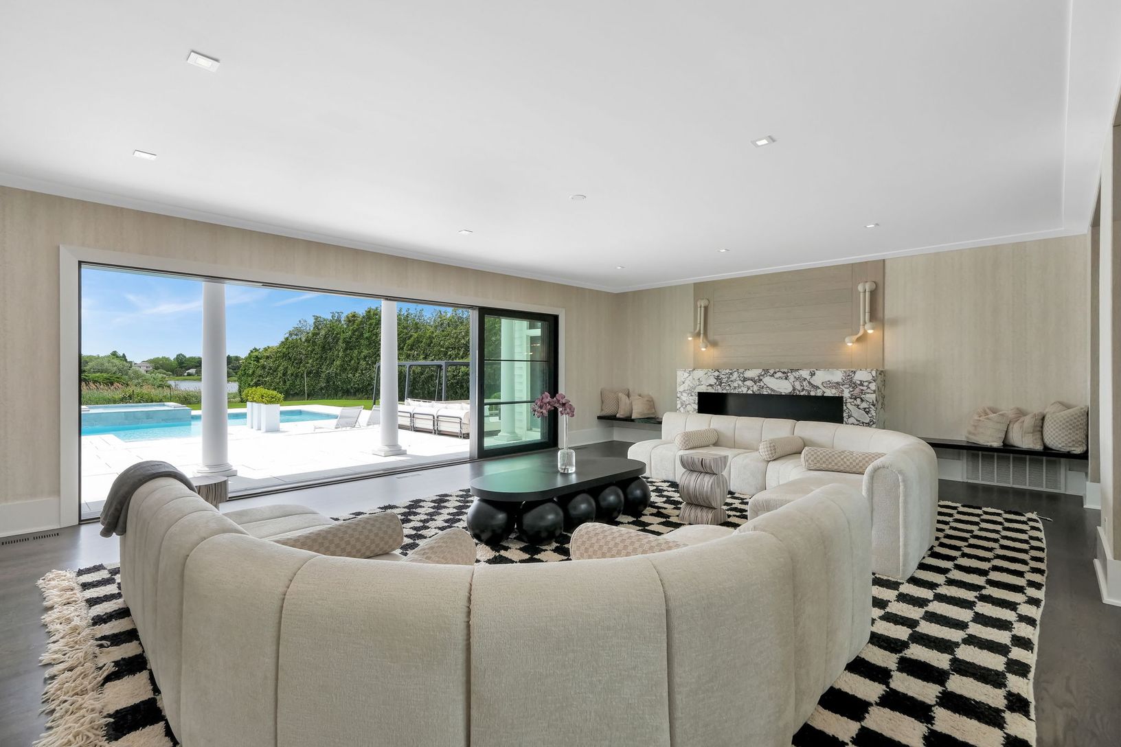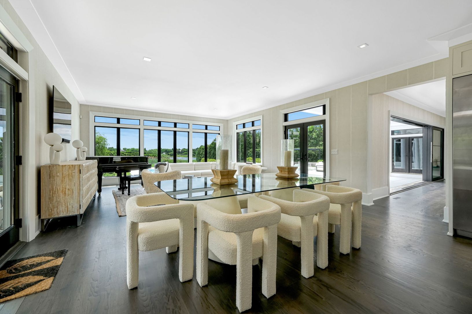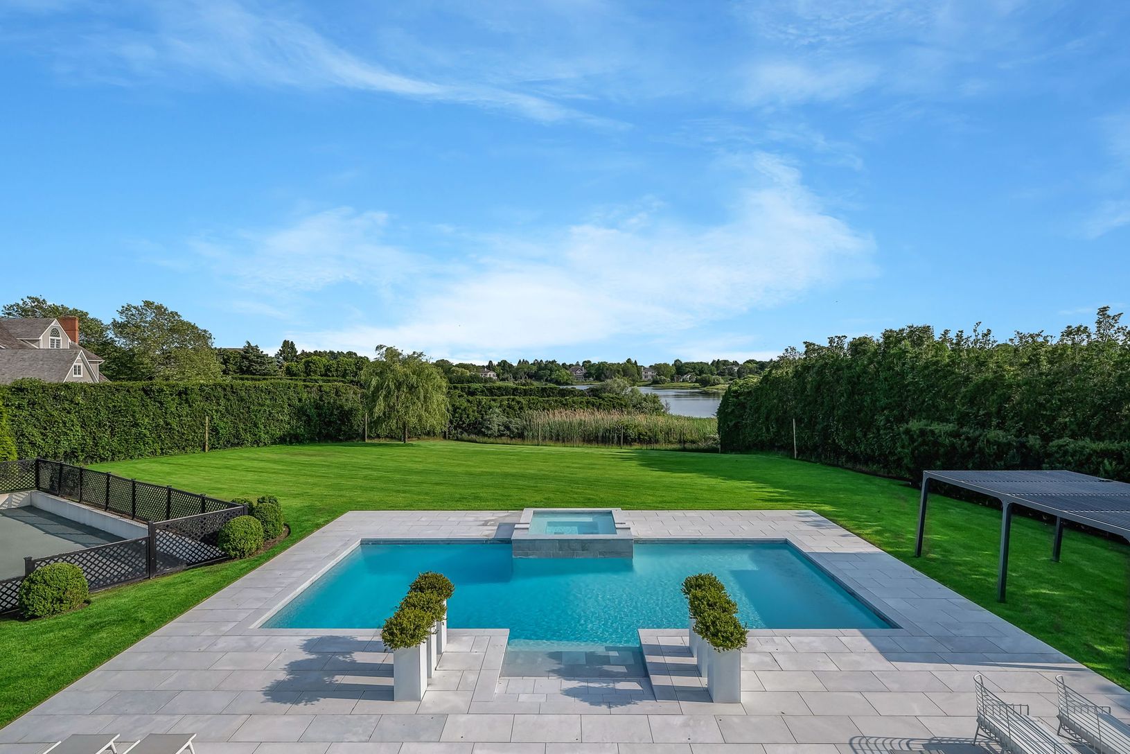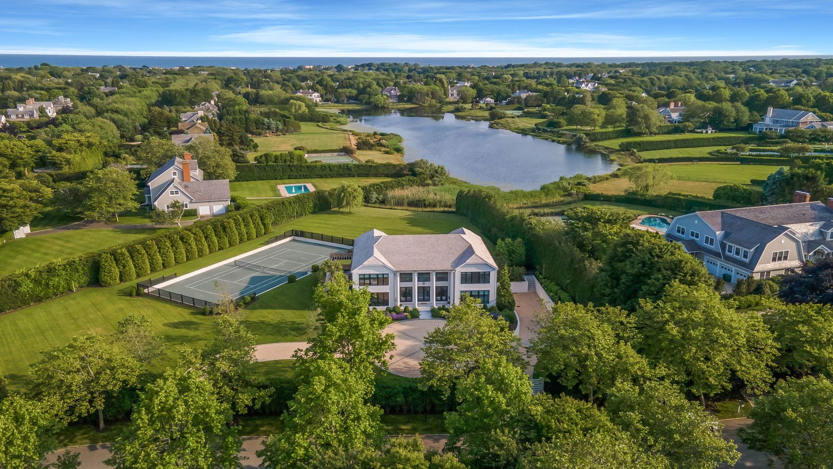 An incredible pond front property is sited inside of a community south of the highway, just minutes from sandy ocean beaches and Village shopping and dining. With pleasing views of the pond from nearly every room, the 7 bedroom, 7.5 bathroom house is ideal for placid relaxation, outdoor fun and formal and informal entertaining. A grand double height entry foyer opens to the spacious living room with gas fireplace. The expansive gourmet eat-in