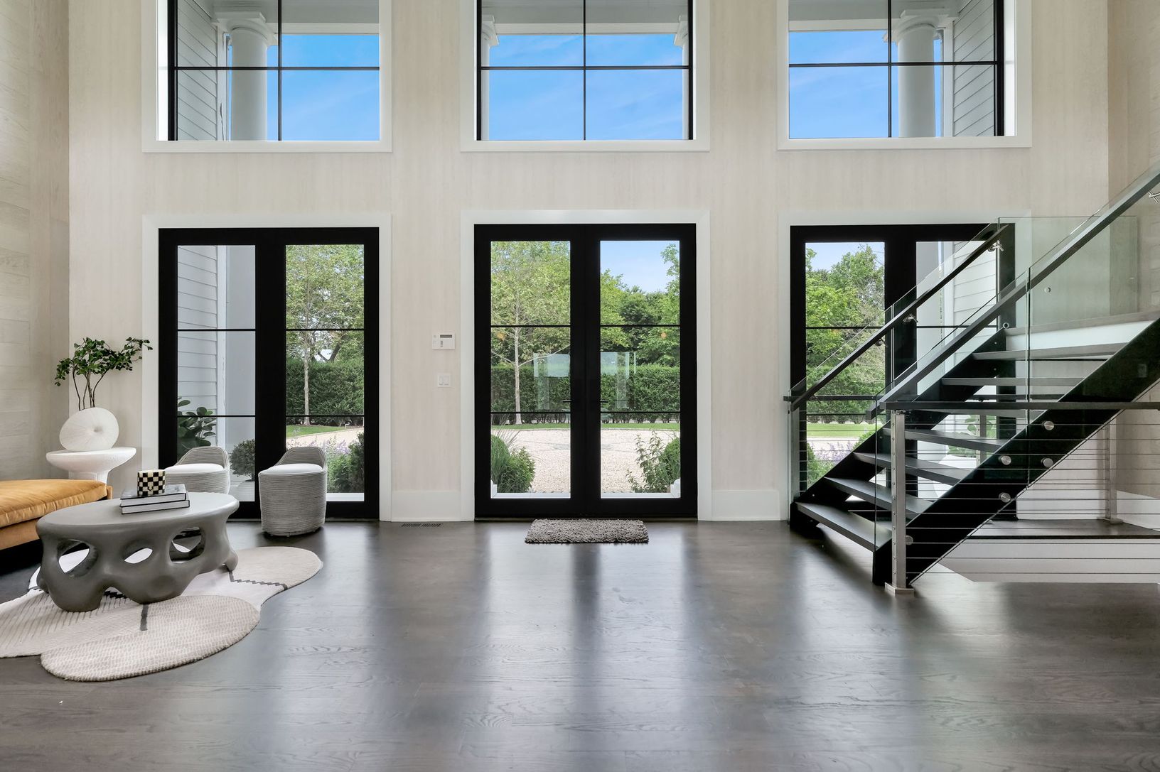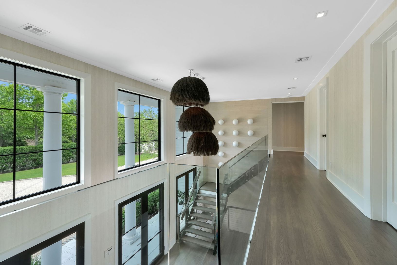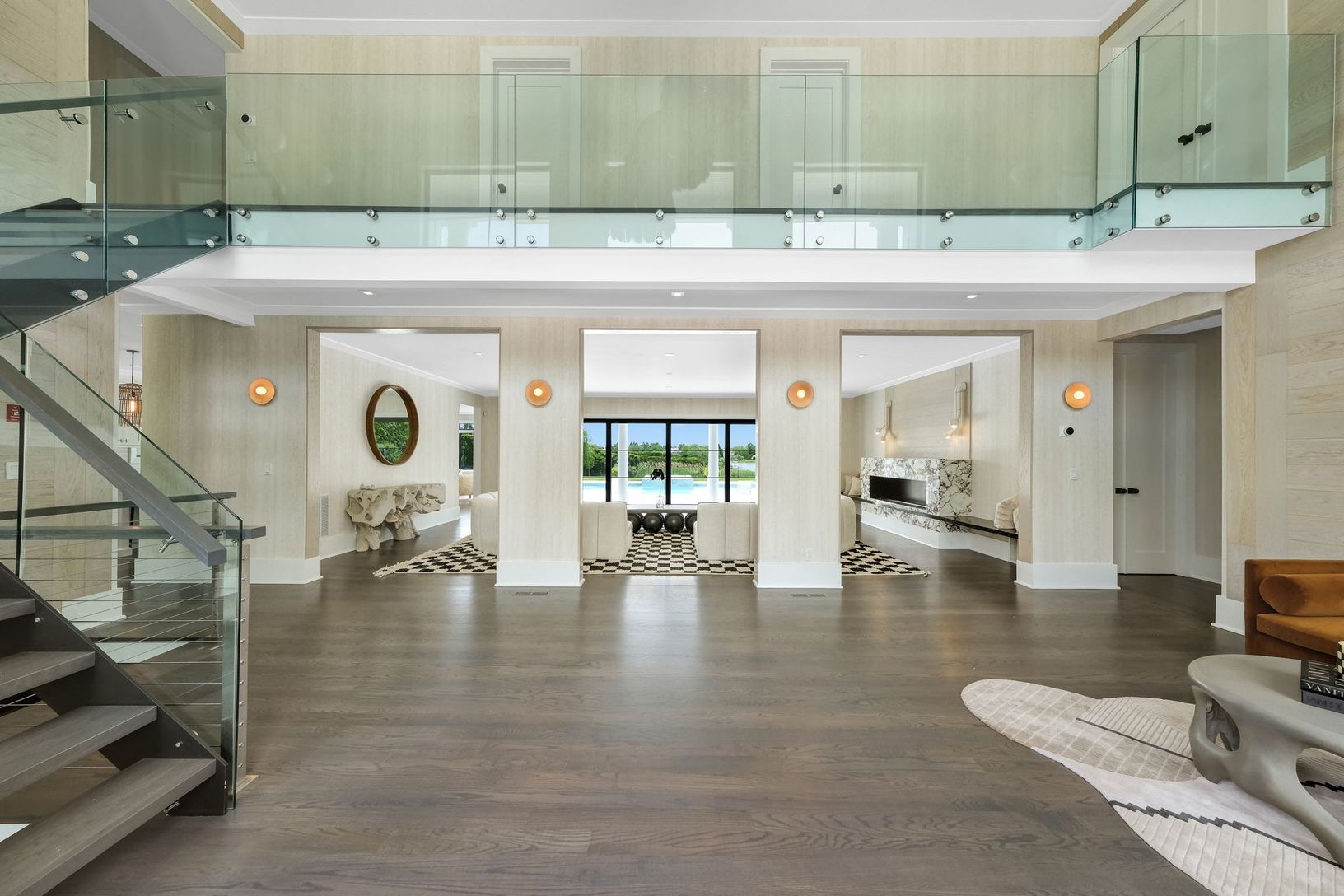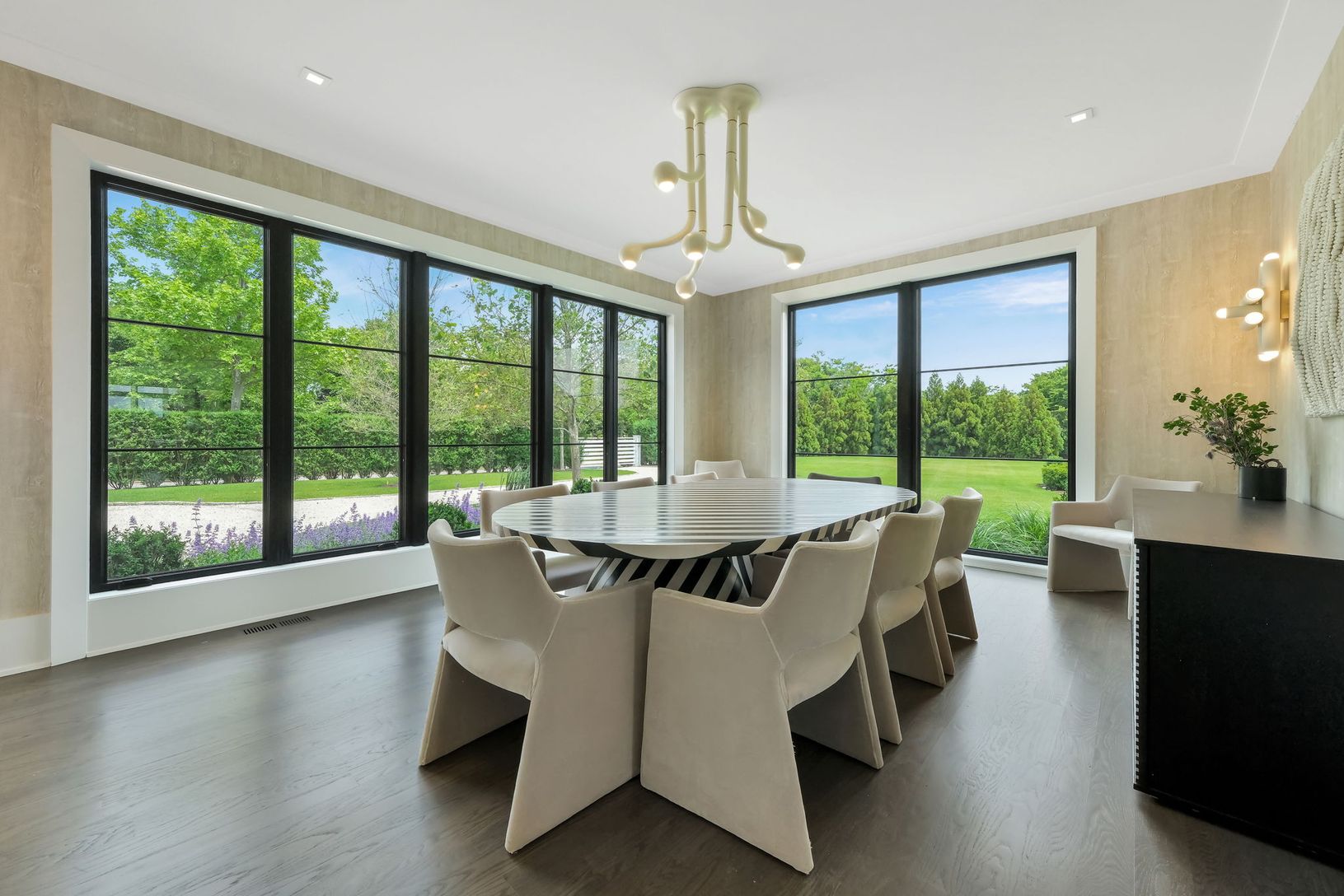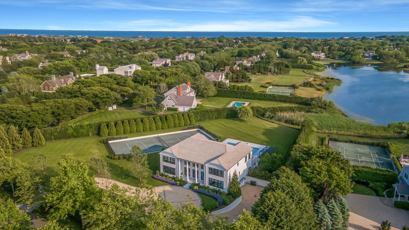 An incredible pond front property is sited inside of a community south of the highway, just minutes from sandy ocean beaches and Village shopping and dining. With pleasing views of the pond from nearly every room, the 7 bedroom, 7.5 bathroom house is ideal for placid relaxation, outdoor fun and formal and informal entertaining. A grand double height entry foyer opens to the spacious living room with gas fireplace. The expansive gourmet eat-in
