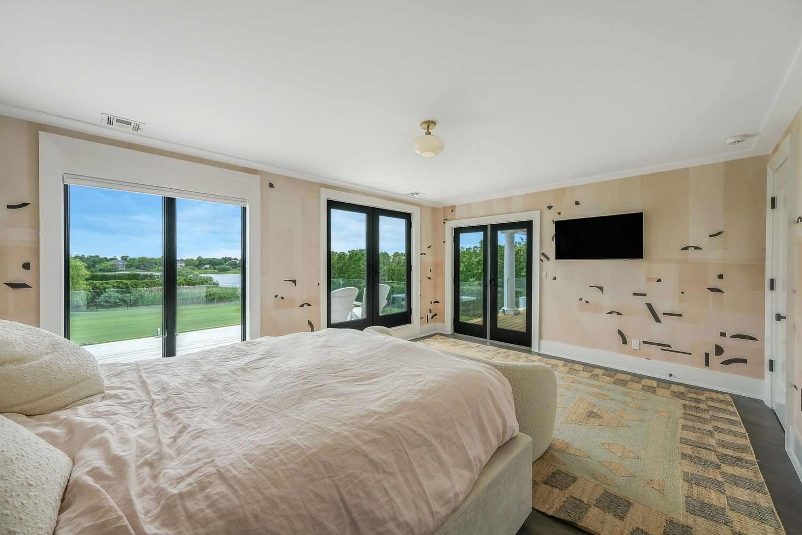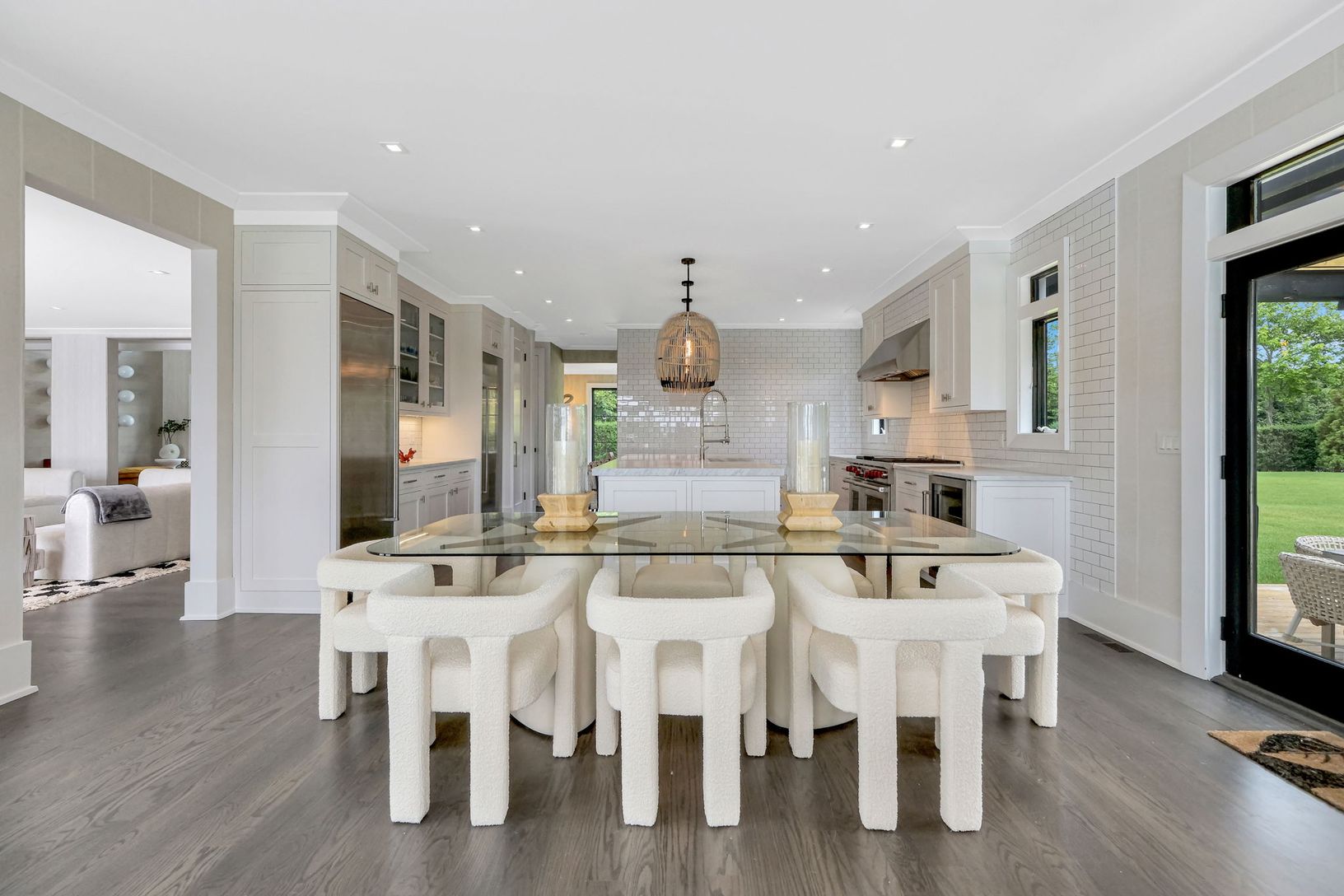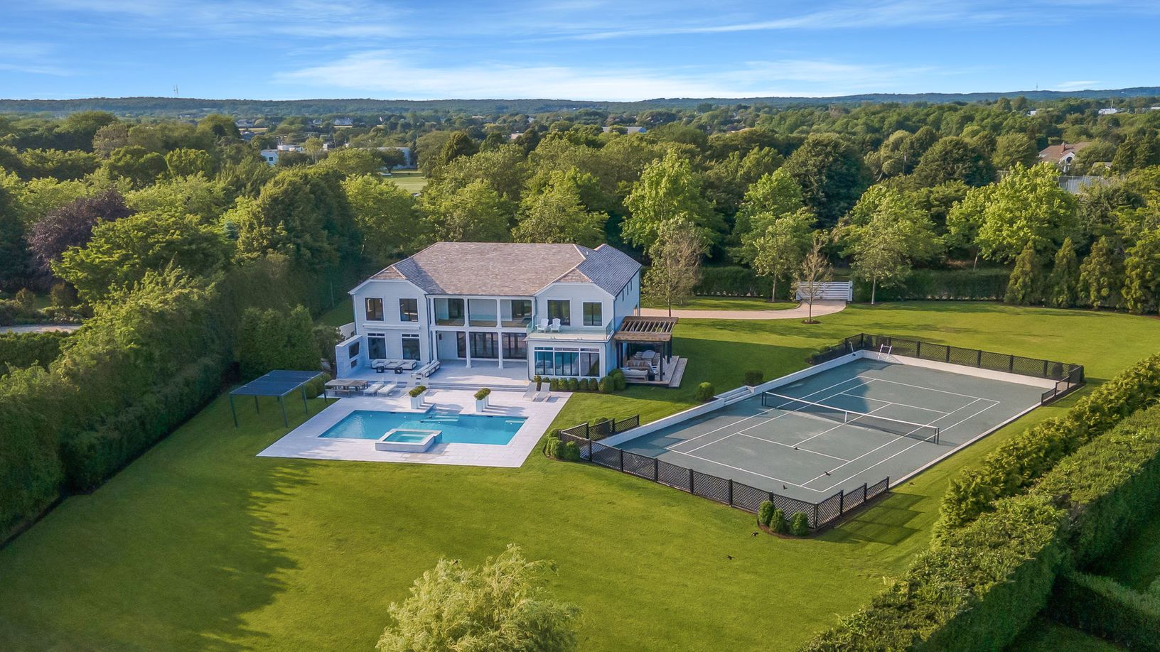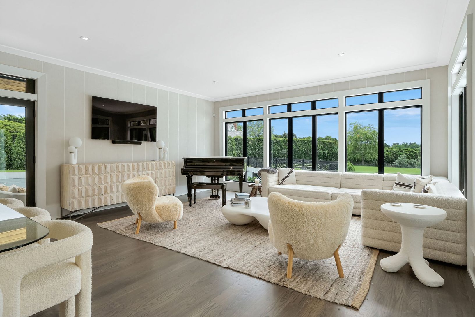 An incredible pond front property is sited inside of a community south of the highway, just minutes from sandy ocean beaches and Village shopping and dining. With pleasing views of the pond from nearly every room, the 7 bedroom, 7.5 bathroom house is ideal for placid relaxation, outdoor fun and formal and informal entertaining. A grand double height entry foyer opens to the spacious living room with gas fireplace. The expansive gourmet eat-in