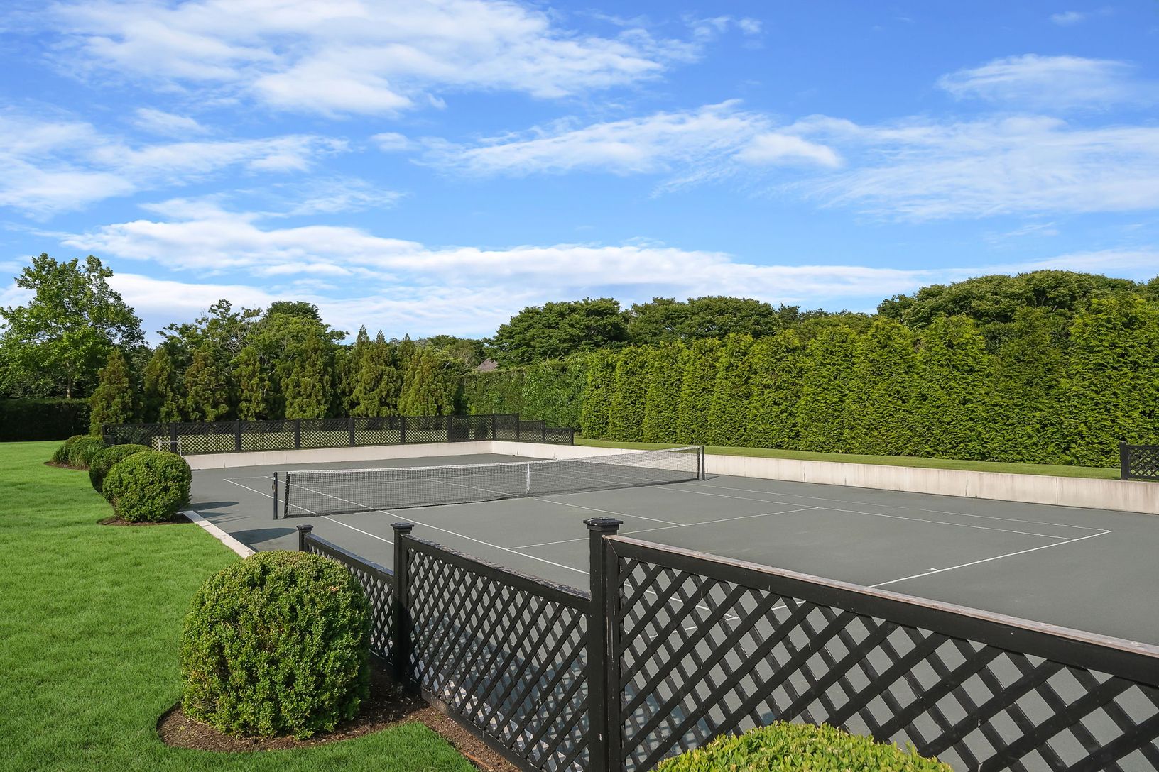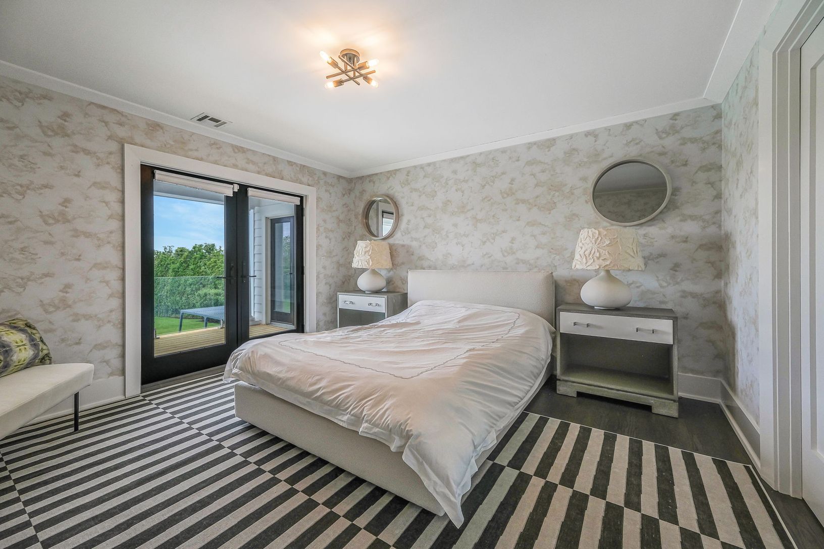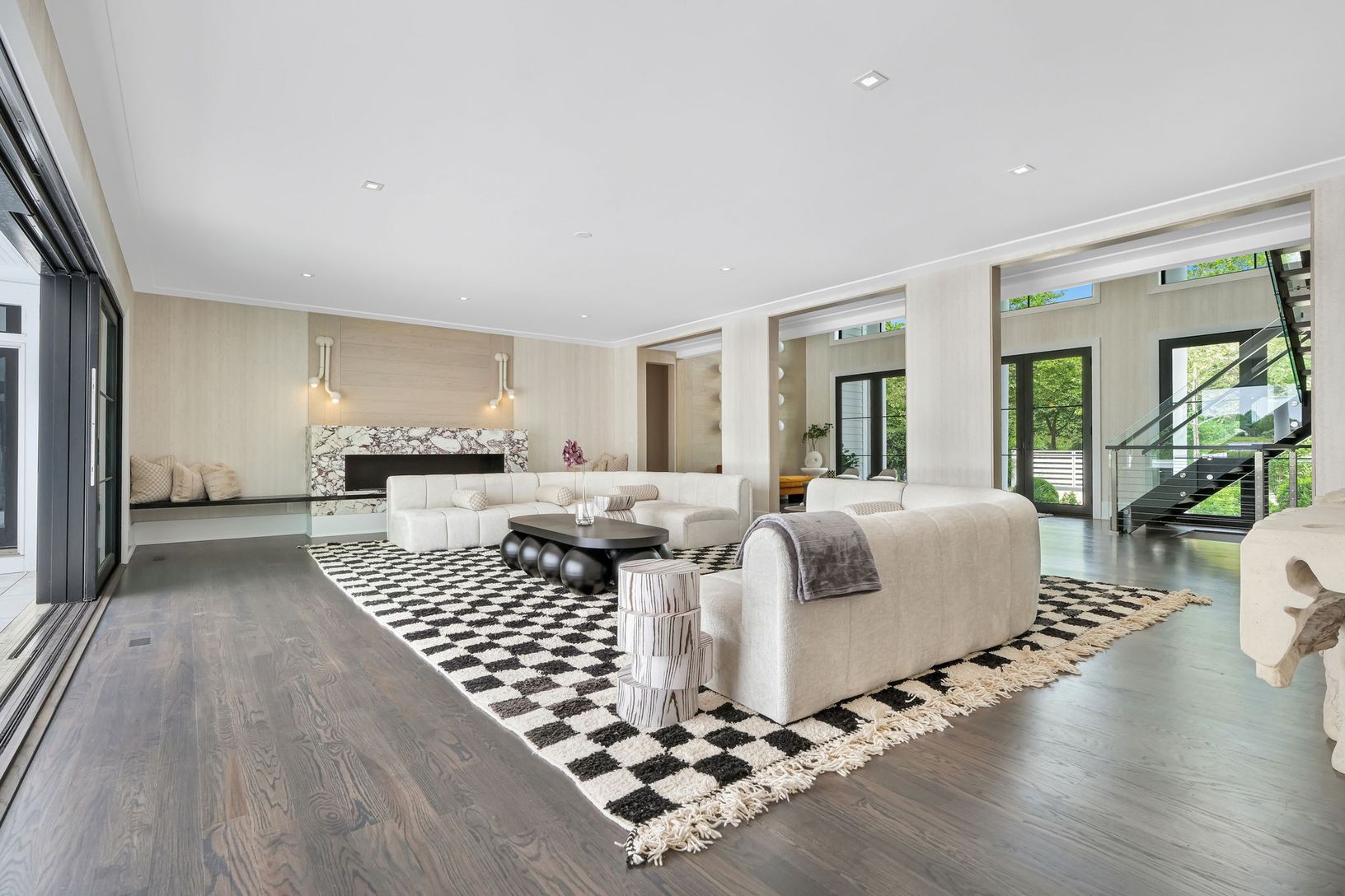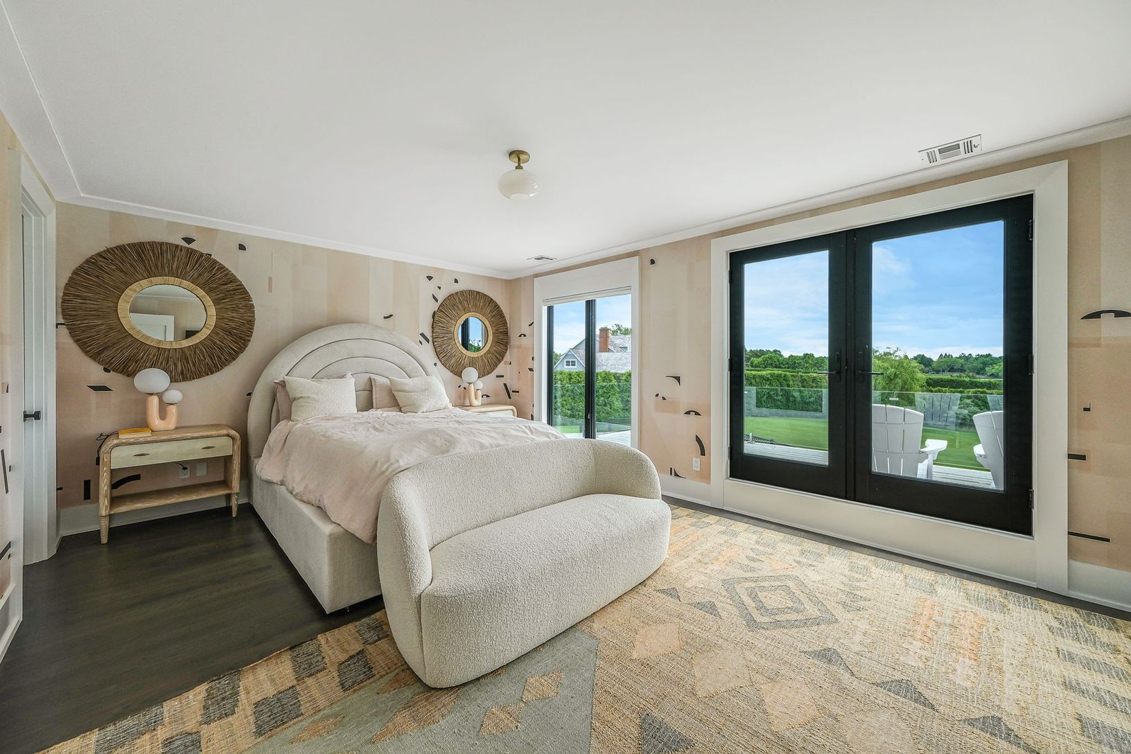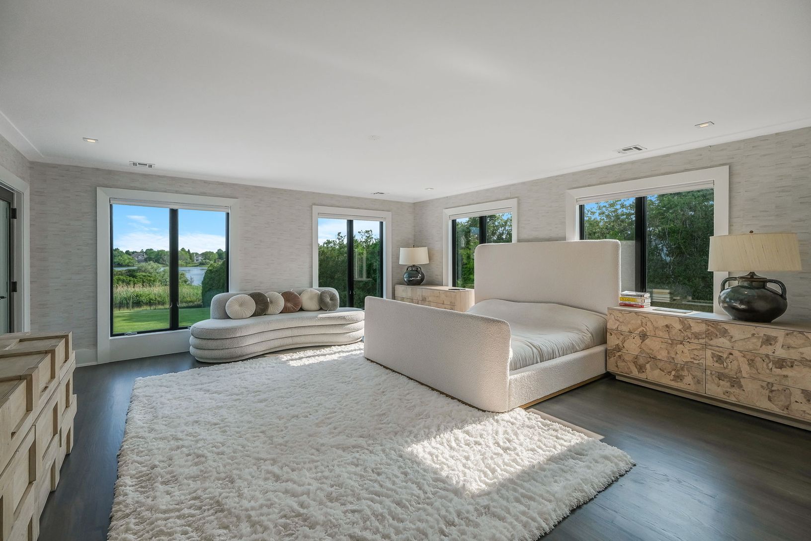 An incredible pond front property is sited inside of a community south of the highway, just minutes from sandy ocean beaches and Village shopping and dining. With pleasing views of the pond from nearly every room, the 7 bedroom, 7.5 bathroom house is ideal for placid relaxation, outdoor fun and formal and informal entertaining. A grand double height entry foyer opens to the spacious living room with gas fireplace. The expansive gourmet eat-in