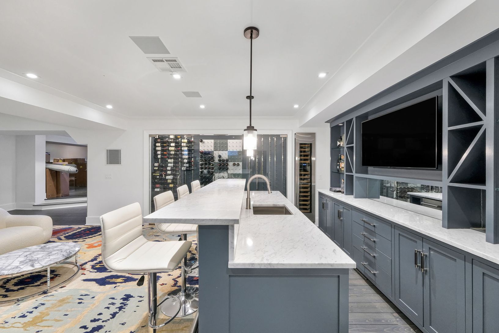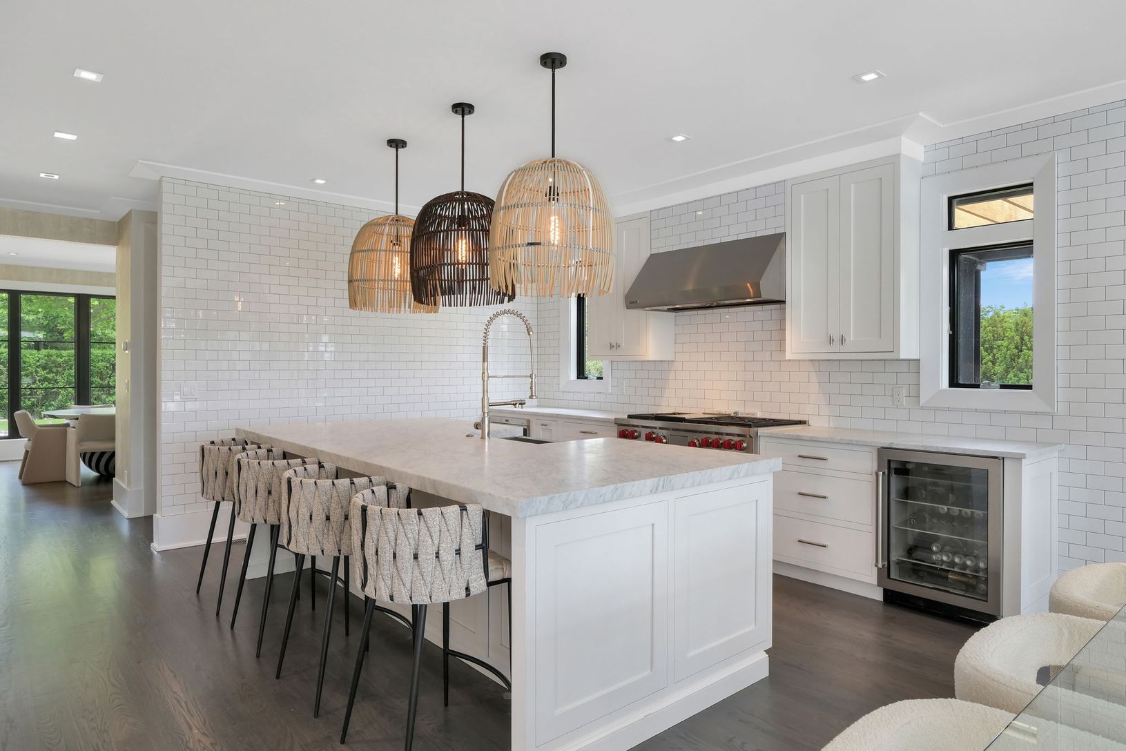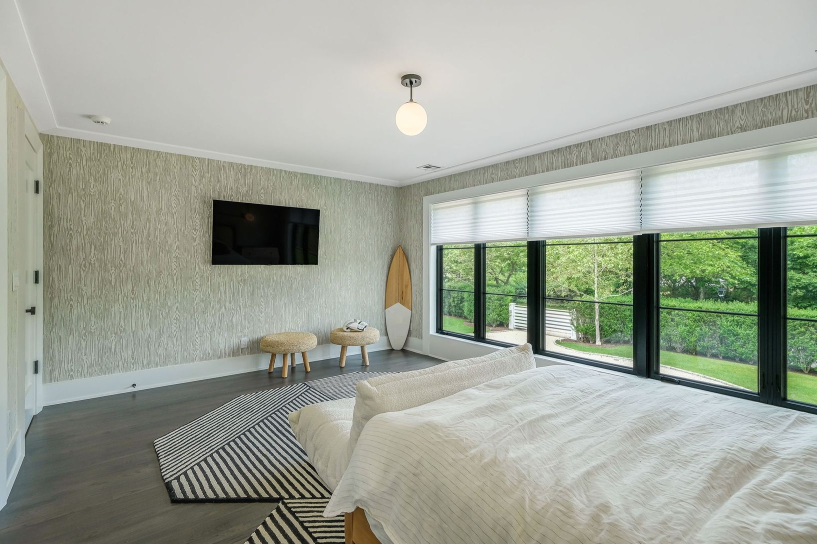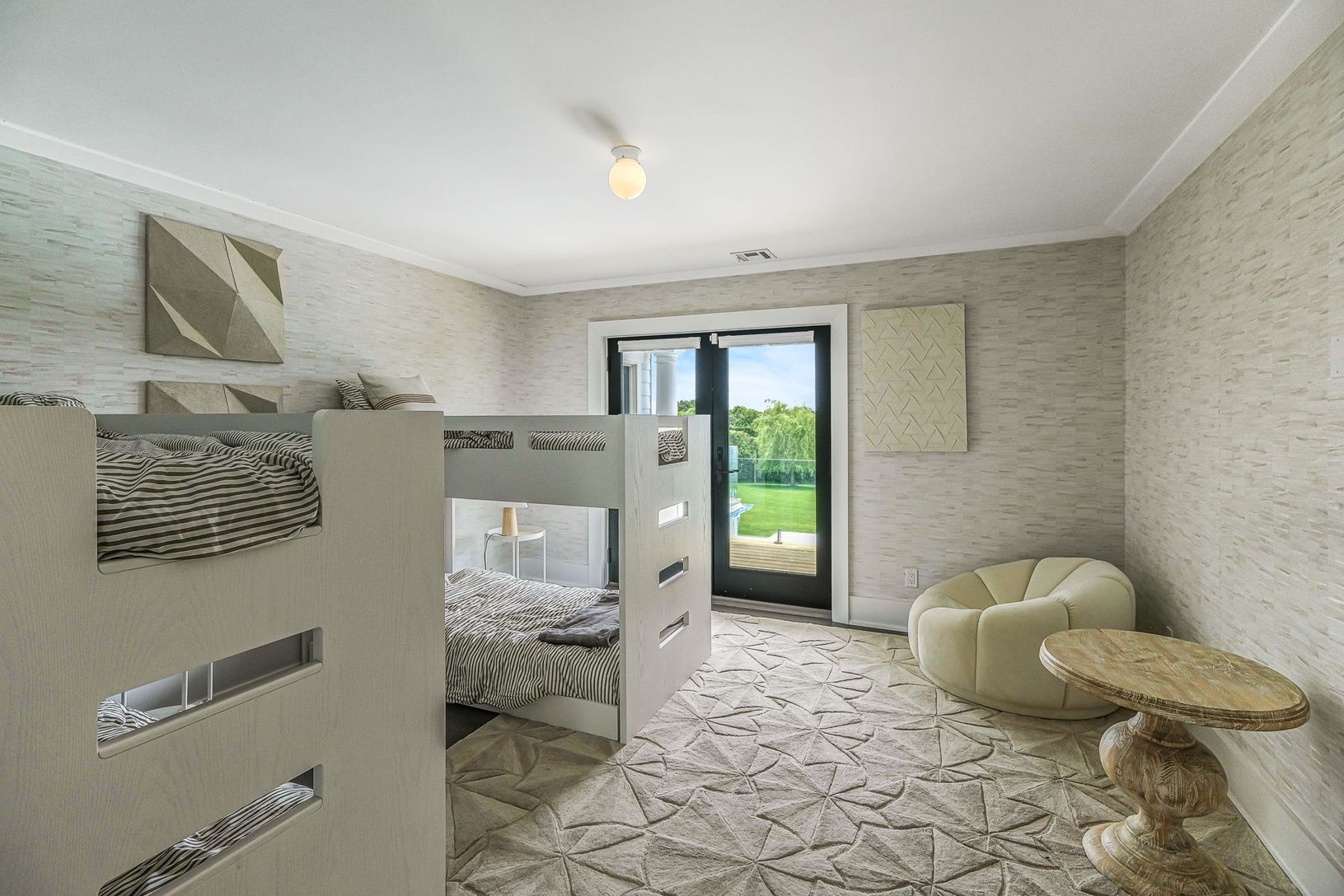 An incredible pond front property is sited inside of a community south of the highway, just minutes from sandy ocean beaches and Village shopping and dining. With pleasing views of the pond from nearly every room, the 7 bedroom, 7.5 bathroom house is ideal for placid relaxation, outdoor fun and formal and informal entertaining. A grand double height entry foyer opens to the spacious living room with gas fireplace. The expansive gourmet eat-in