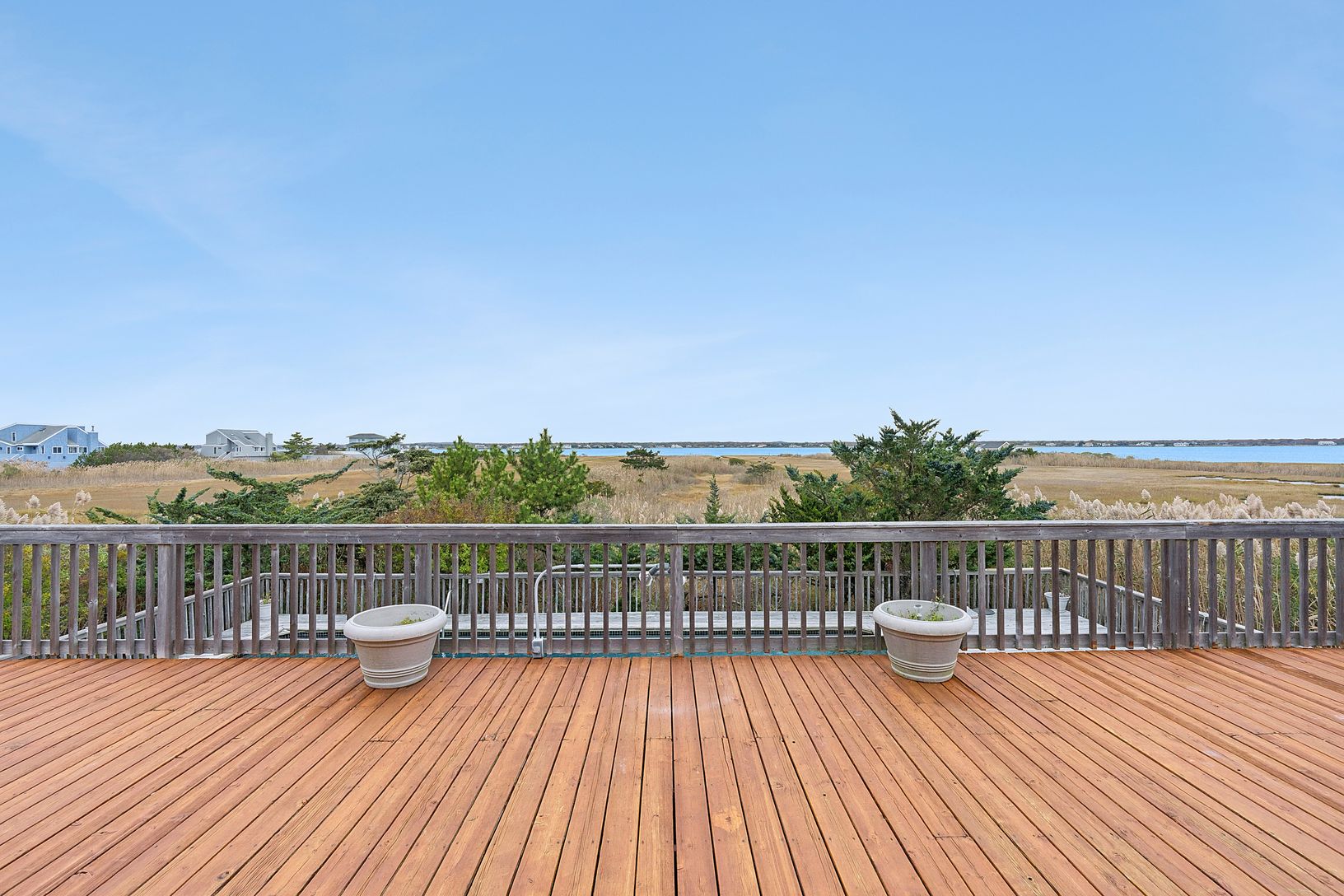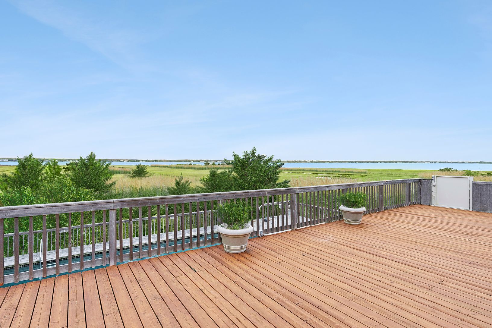 With unobstructed water views over +/-4.2 acres, this Westhampton bayfront beach house is a private oasis of coastal living. Deeded ocean access provides convenience to enjoy Dune Road's white sand beaches. The open floor plan of the house and multiple sliders to the expansive deck perfectly frame the world-class bay views. The great room offers high ceilings and a wood-burning fireplace. The kitchen and dining area open to the deck to offer