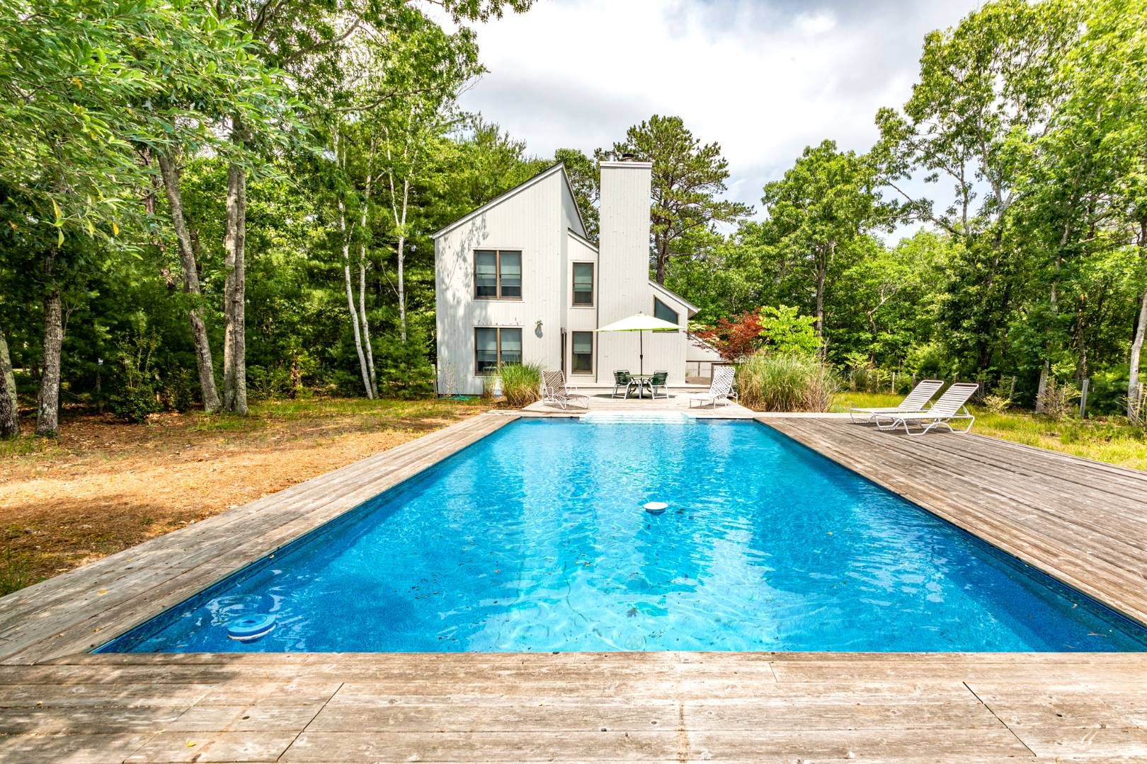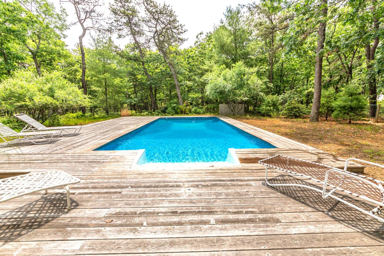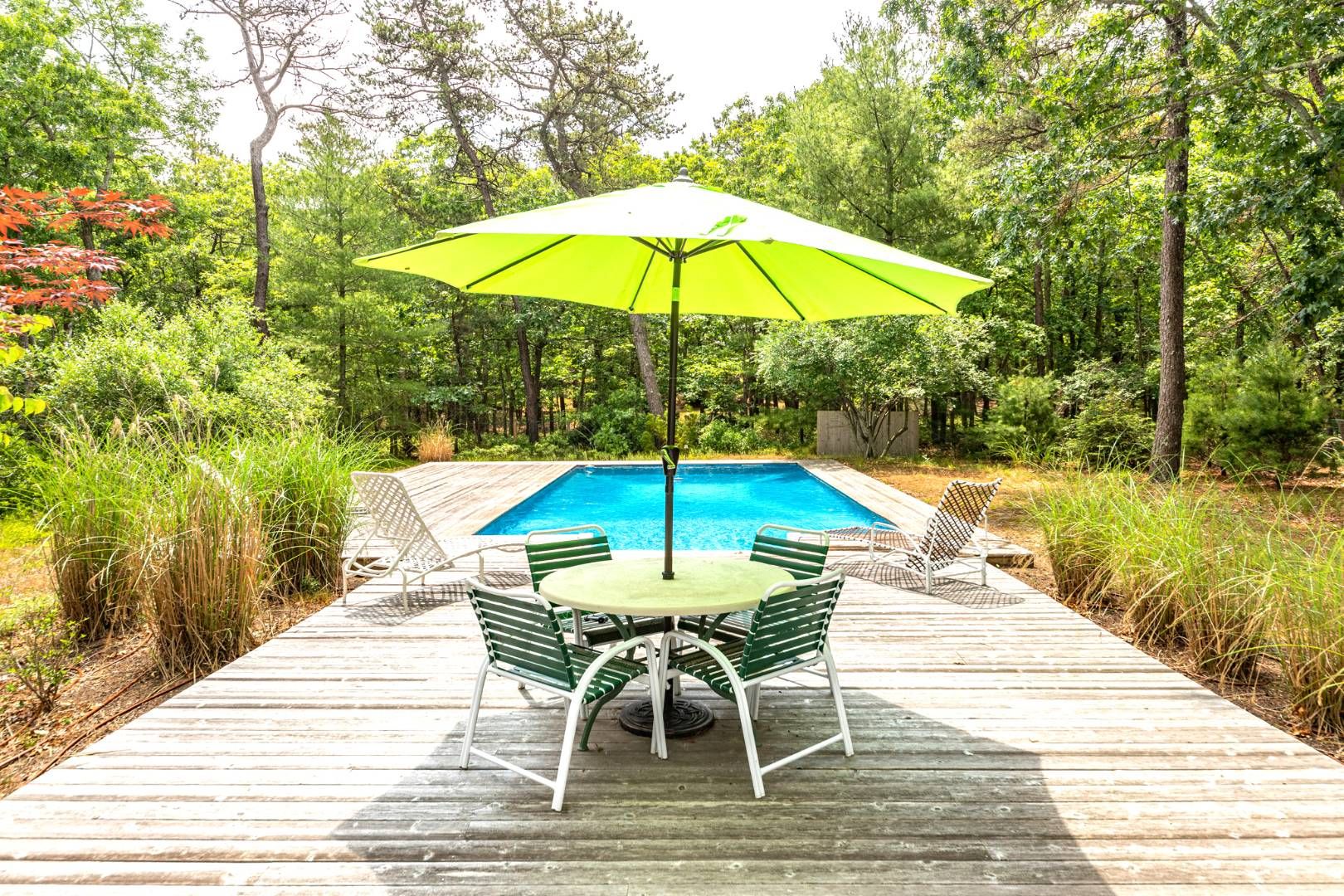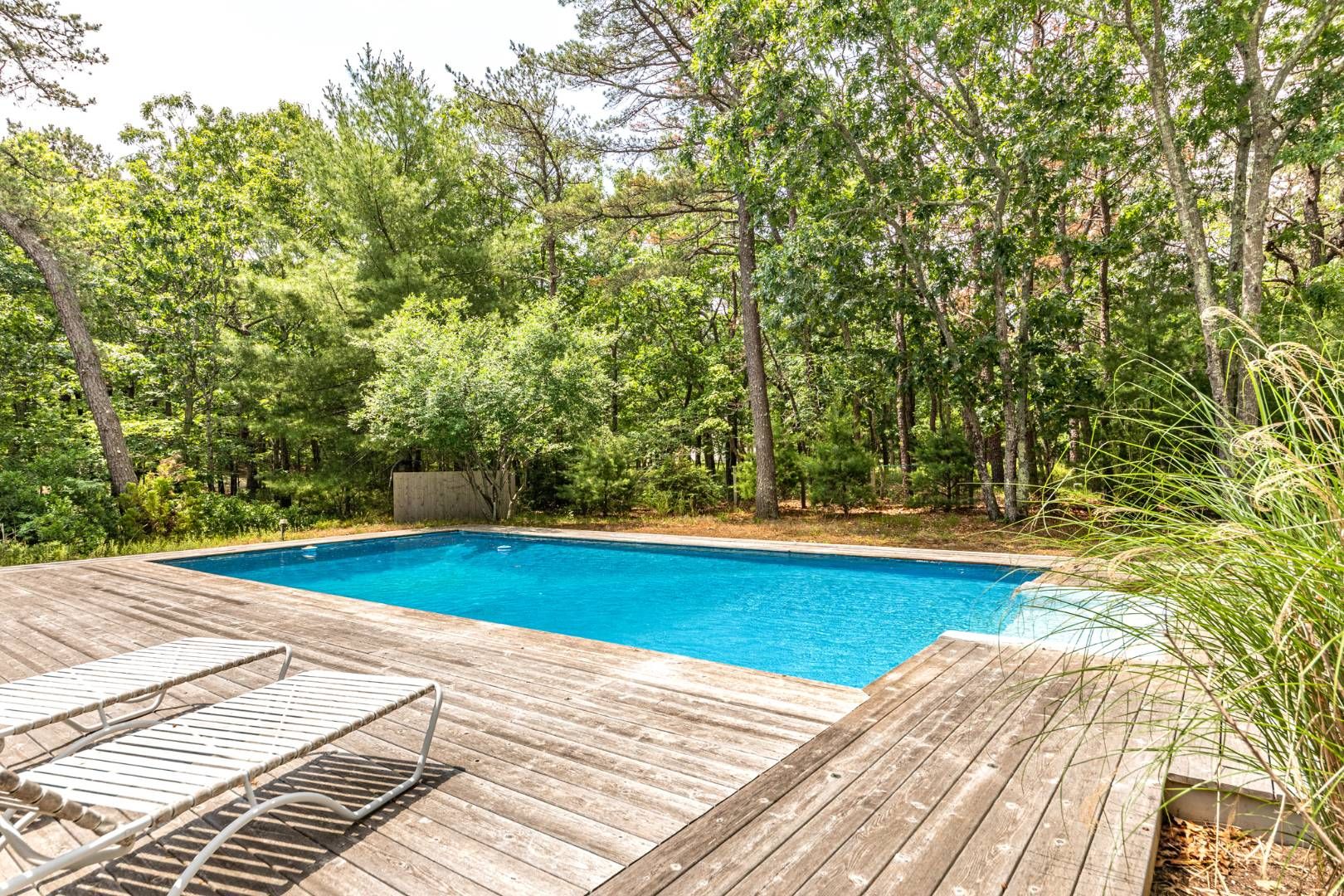 On 1.2 quiet acres in Wainscott, set back from the road, find this bright and immaculate 4 bedroom, 2.5 bath contemporary with a pool and wraparound decking. Open living and dining areas have high ceilings, a fireplace, wood floors and multiple glass doors to the deck and pool area. The eat-in kitchen features a pass-through, granite countertops, subway tile backsplash and porcelain plank flooring. Two bedrooms on the first floor share a full