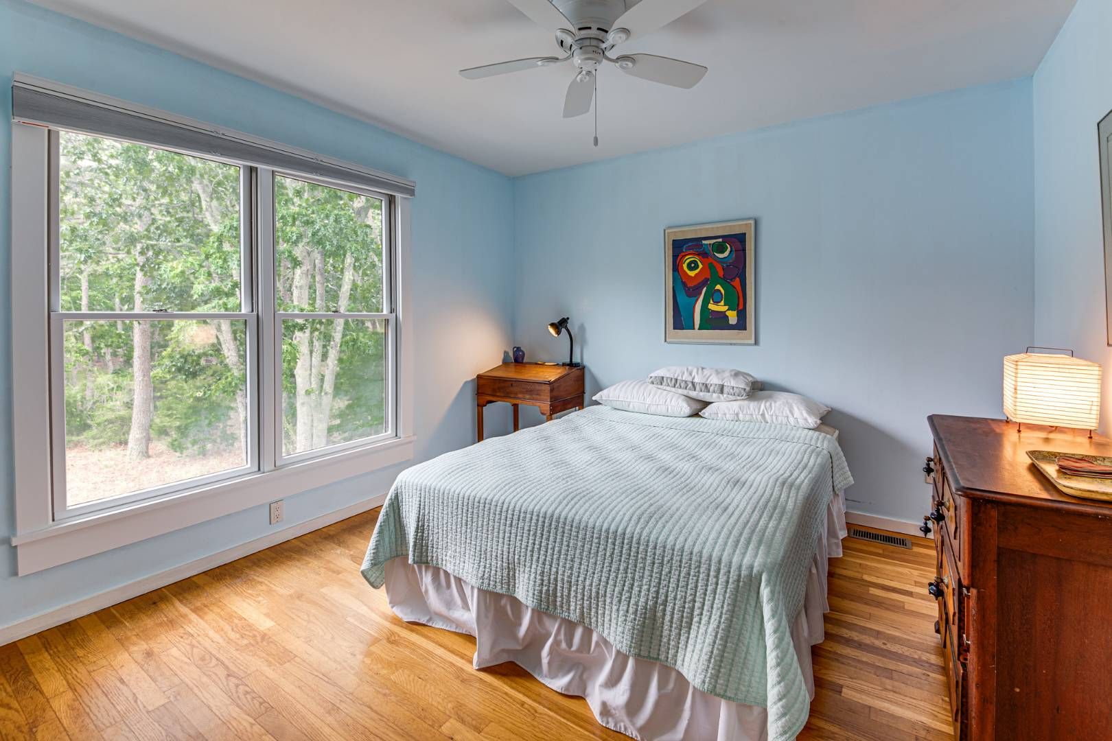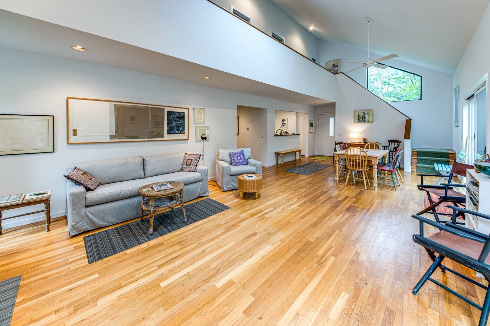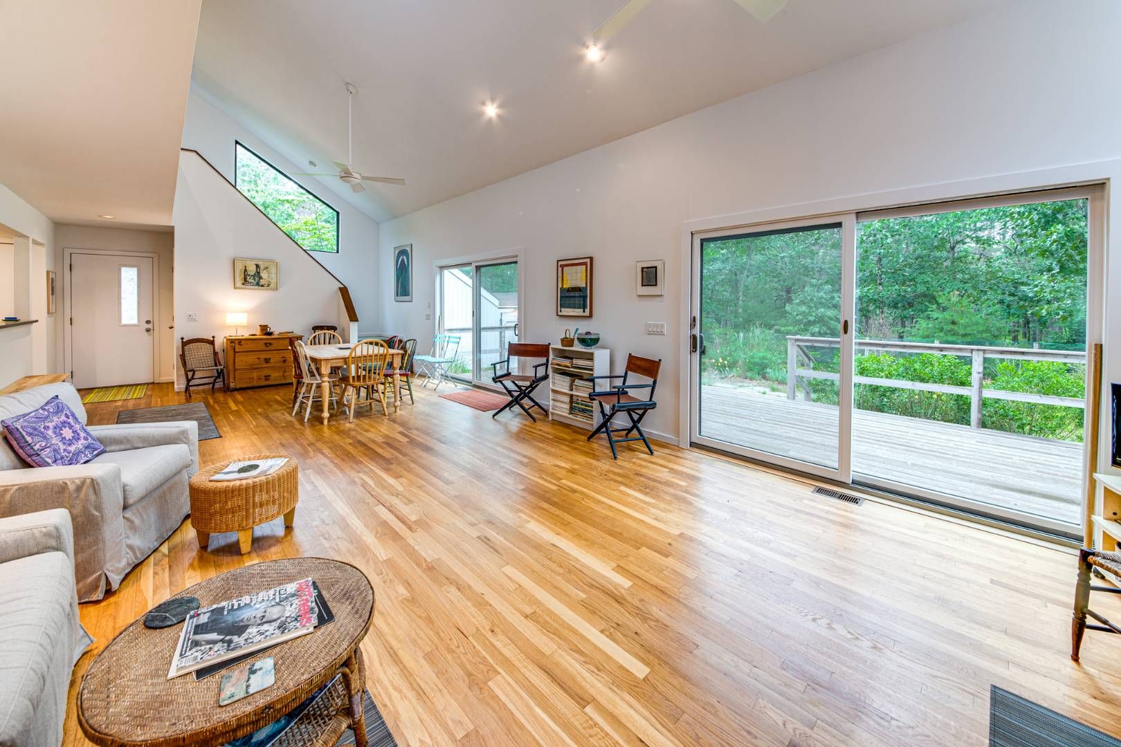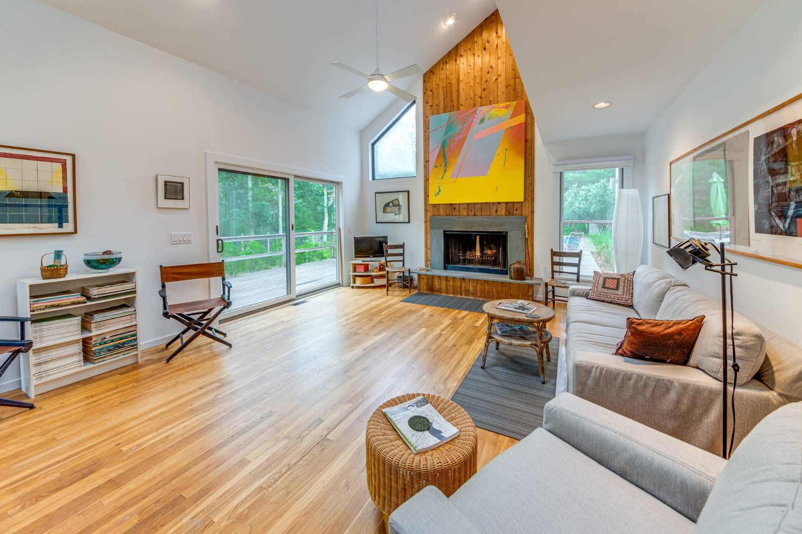 On 1.2 quiet acres in Wainscott, set back from the road, find this bright and immaculate 4 bedroom, 2.5 bath contemporary with a pool and wraparound decking. Open living and dining areas have high ceilings, a fireplace, wood floors and multiple glass doors to the deck and pool area. The eat-in kitchen features a pass-through, granite countertops, subway tile backsplash and porcelain plank flooring. Two bedrooms on the first floor share a full