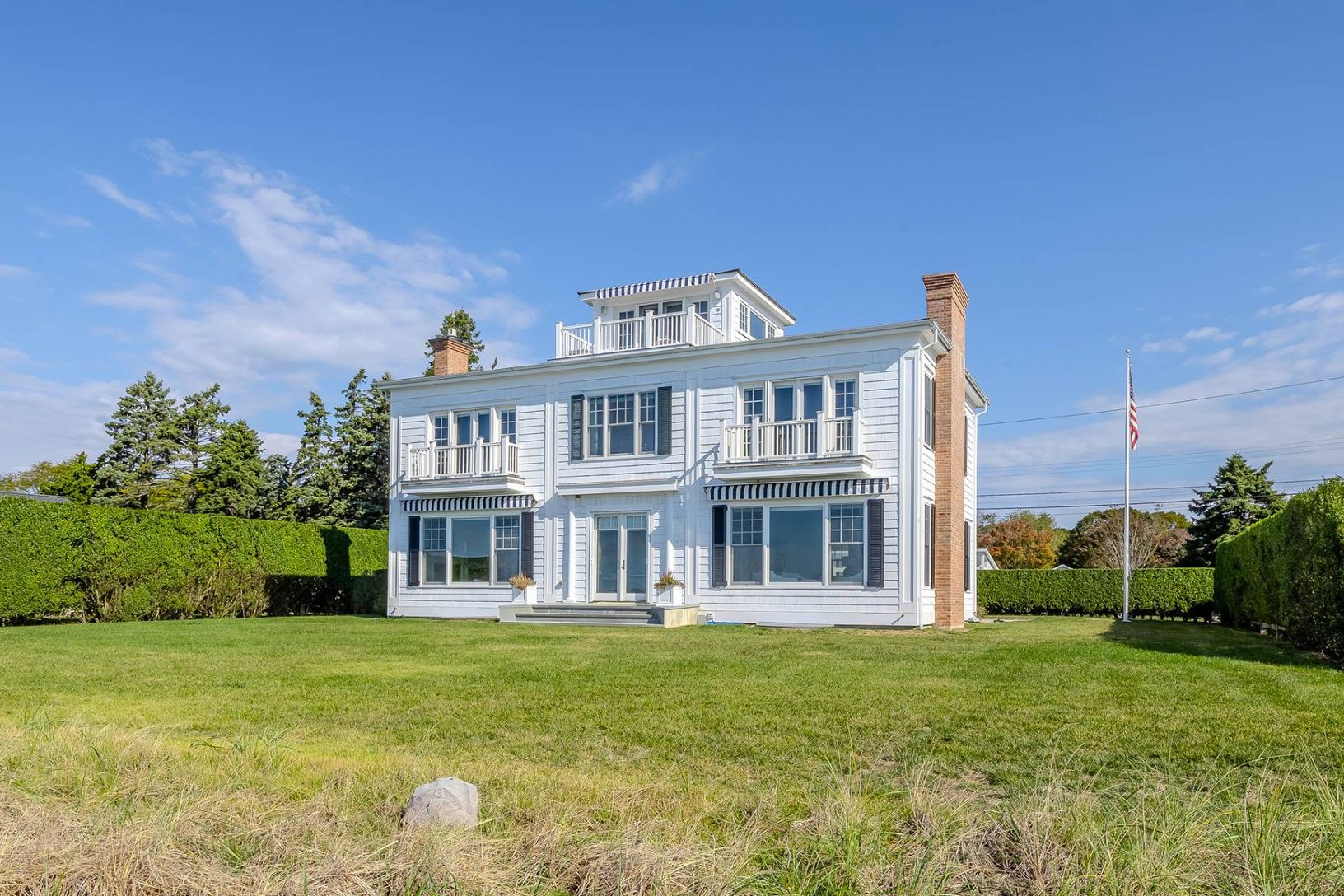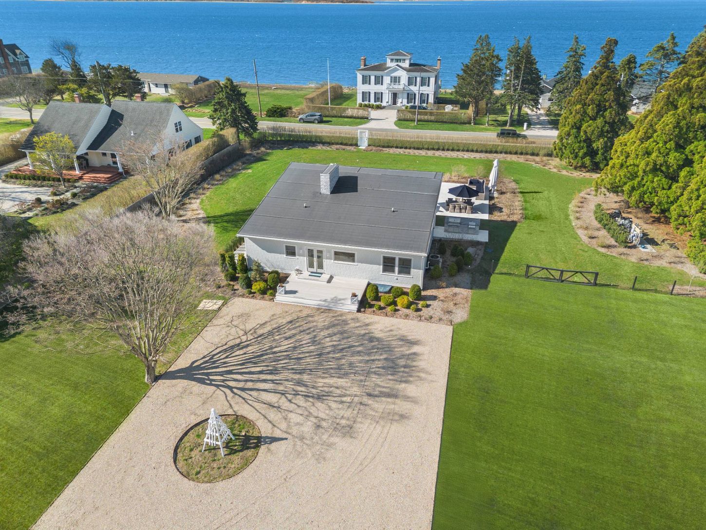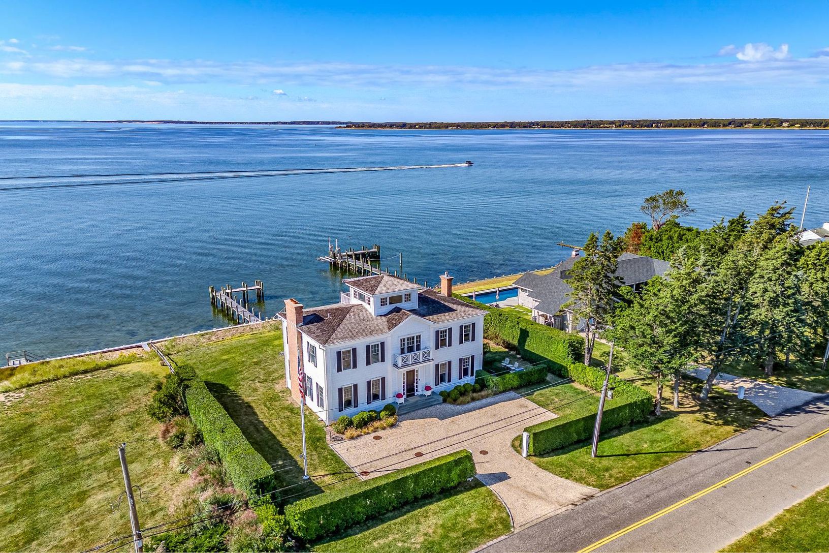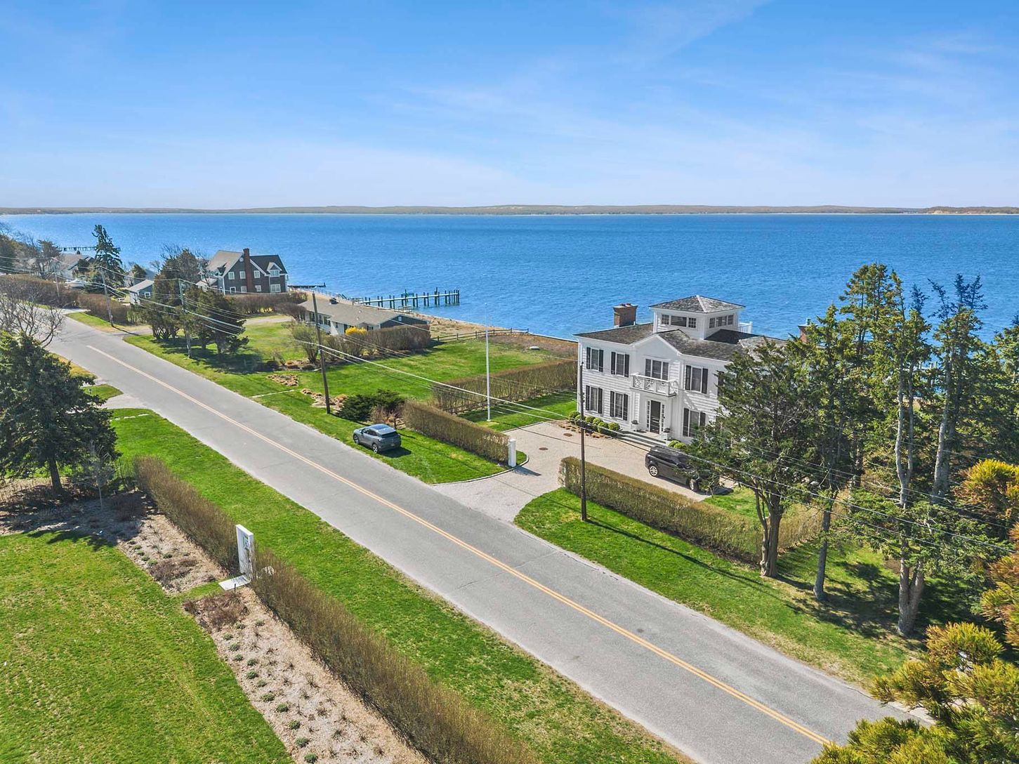 A rare offering on Shelter Island, this estate compound includes two distinct homes sold together: a traditional waterfront residence with dock located at 70 Peconic Avenue, and a recently built modern home with pool and water views at 55 Peconic Avenue, situated just across the street. The waterfront home at 70 Peconic Avenue features spectacular views from nearly every room and offers four levels of finished living space. The main floor incl