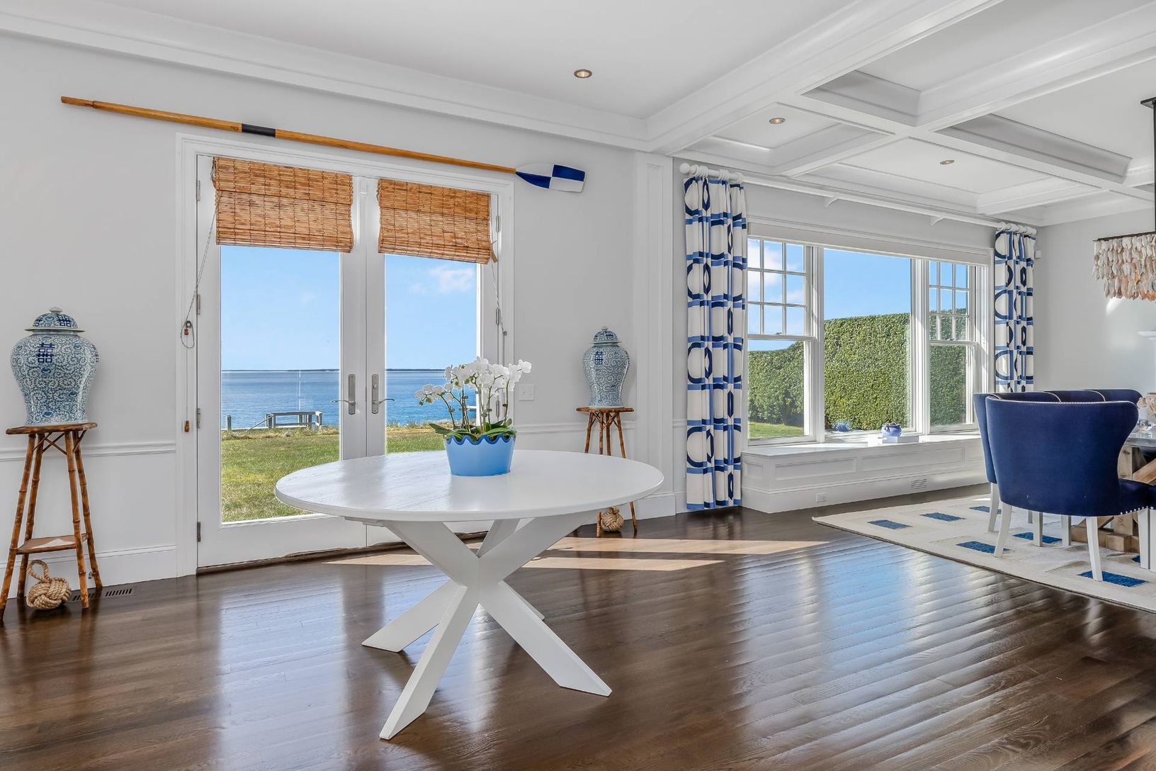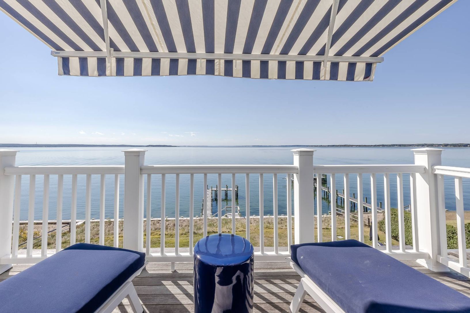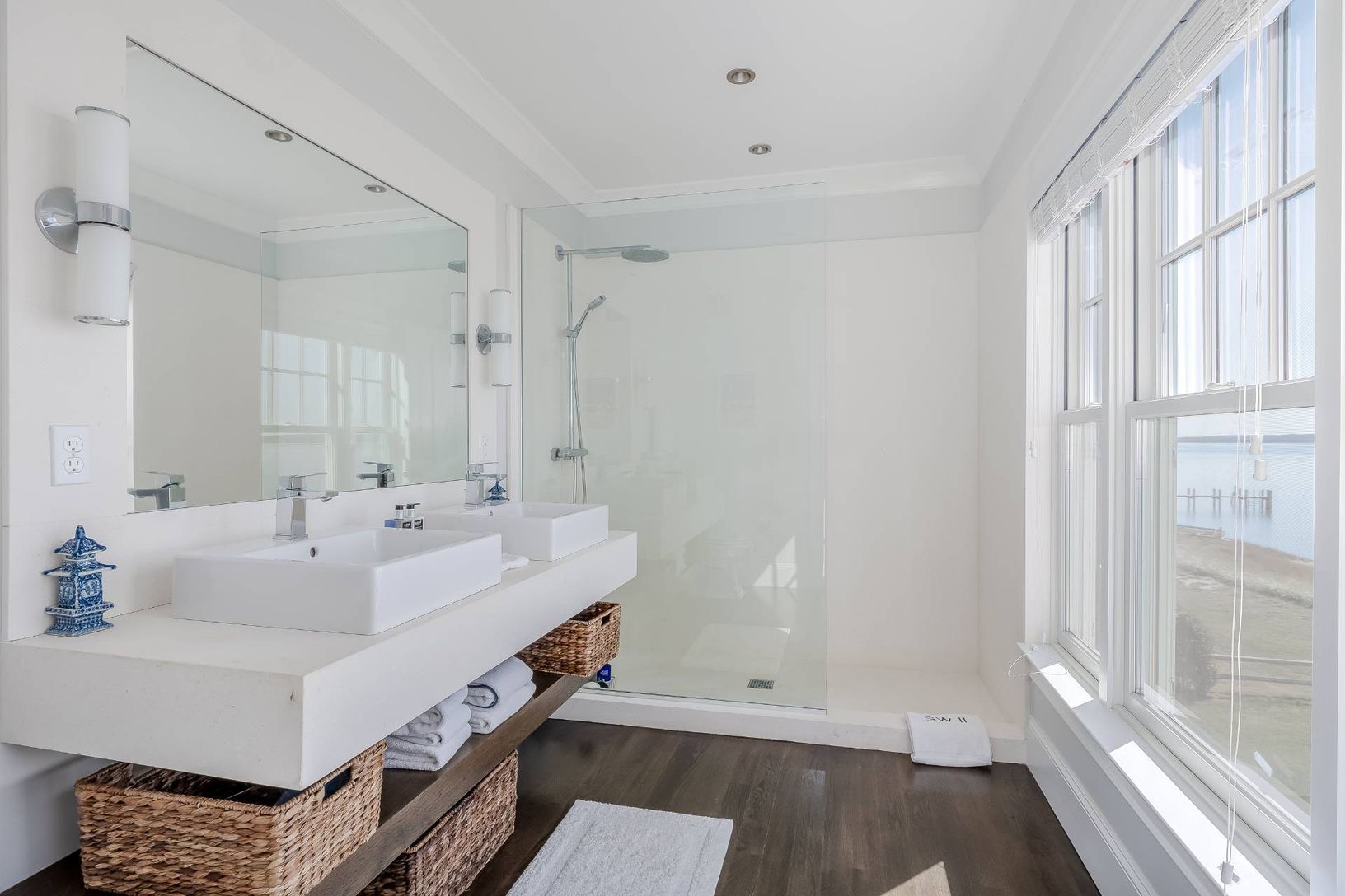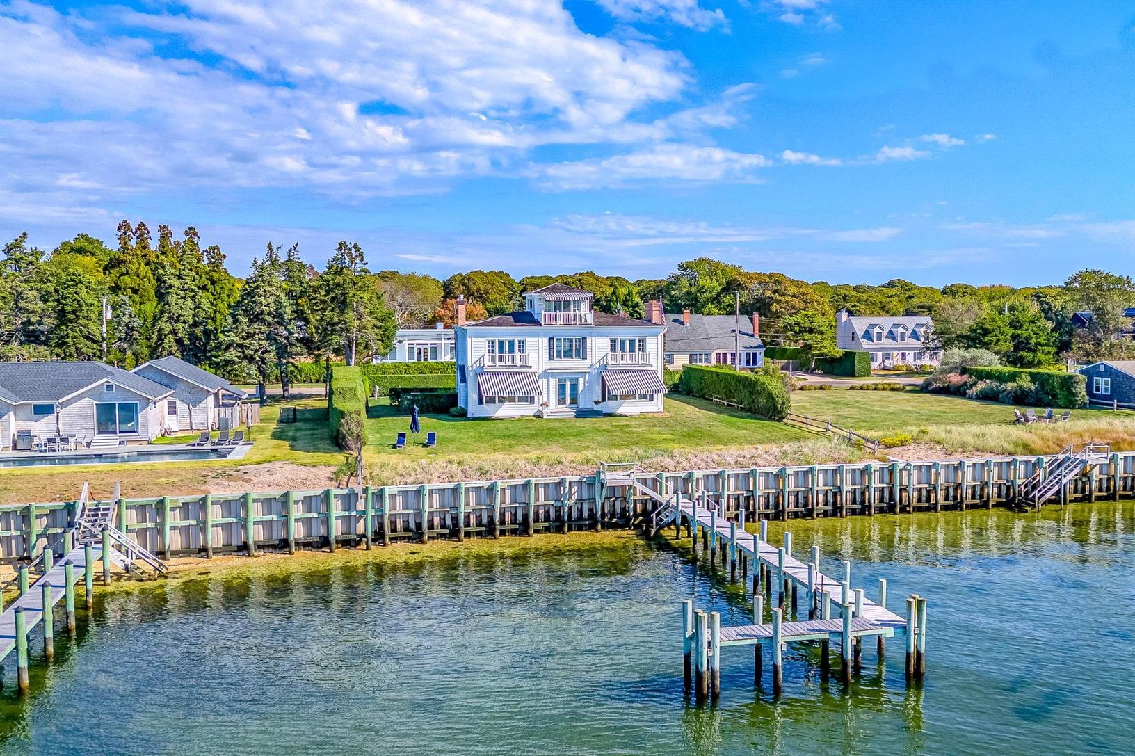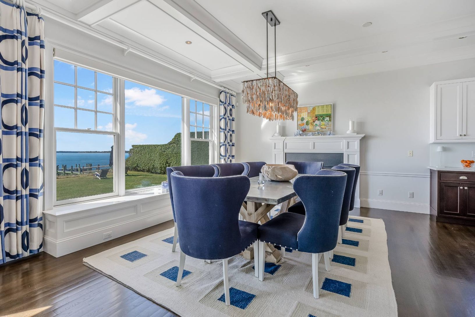 A rare offering on Shelter Island, this estate compound includes two distinct homes sold together: a traditional waterfront residence with dock located at 70 Peconic Avenue, and a recently built modern home with pool and water views at 55 Peconic Avenue, situated just across the street. The waterfront home at 70 Peconic Avenue features spectacular views from nearly every room and offers four levels of finished living space. The main floor incl