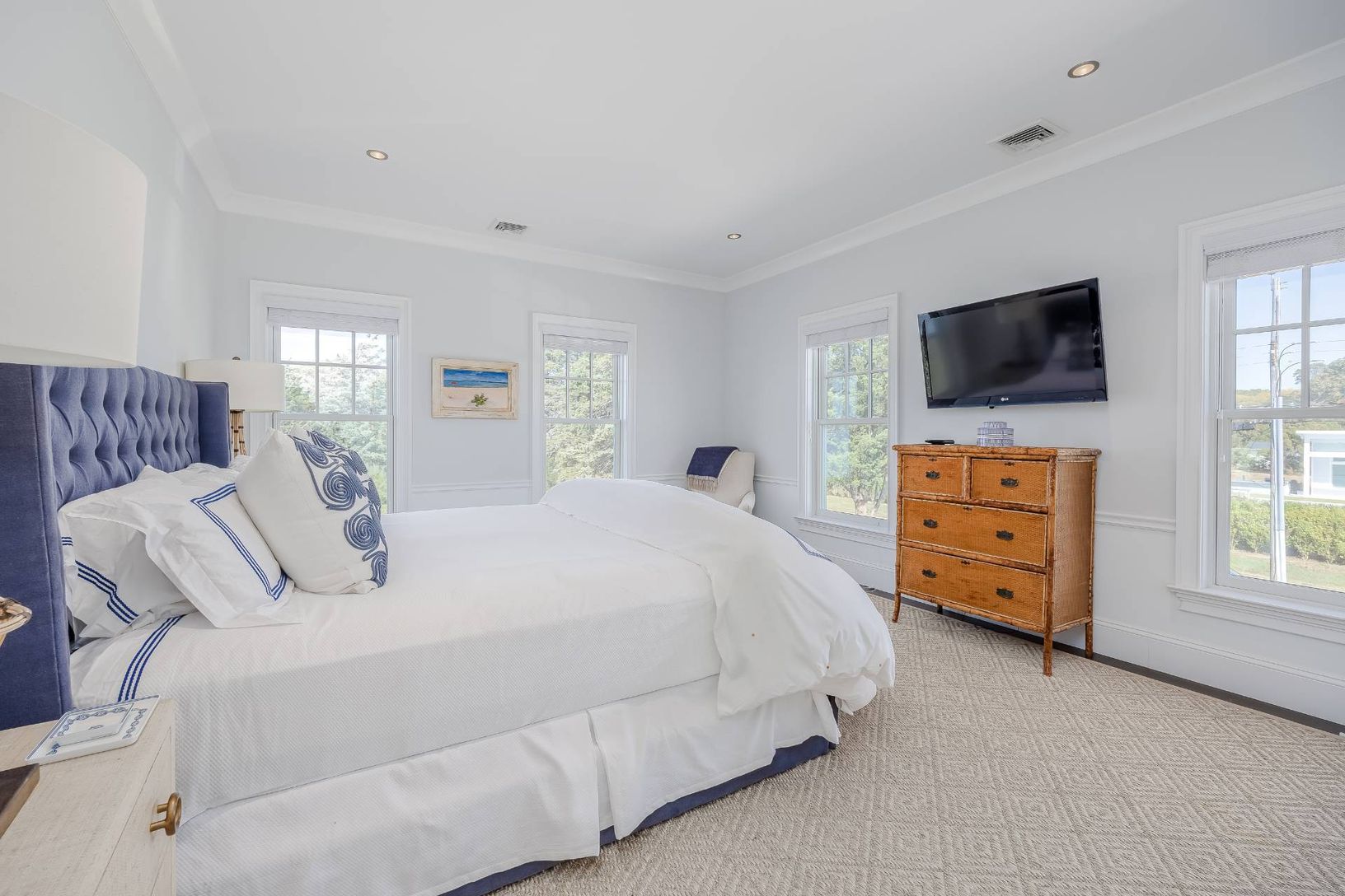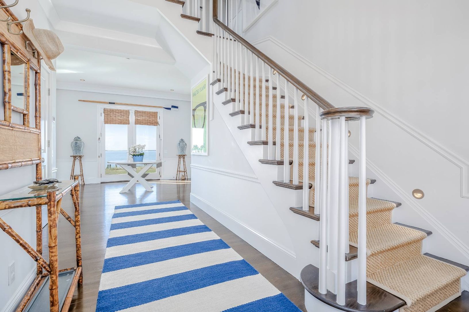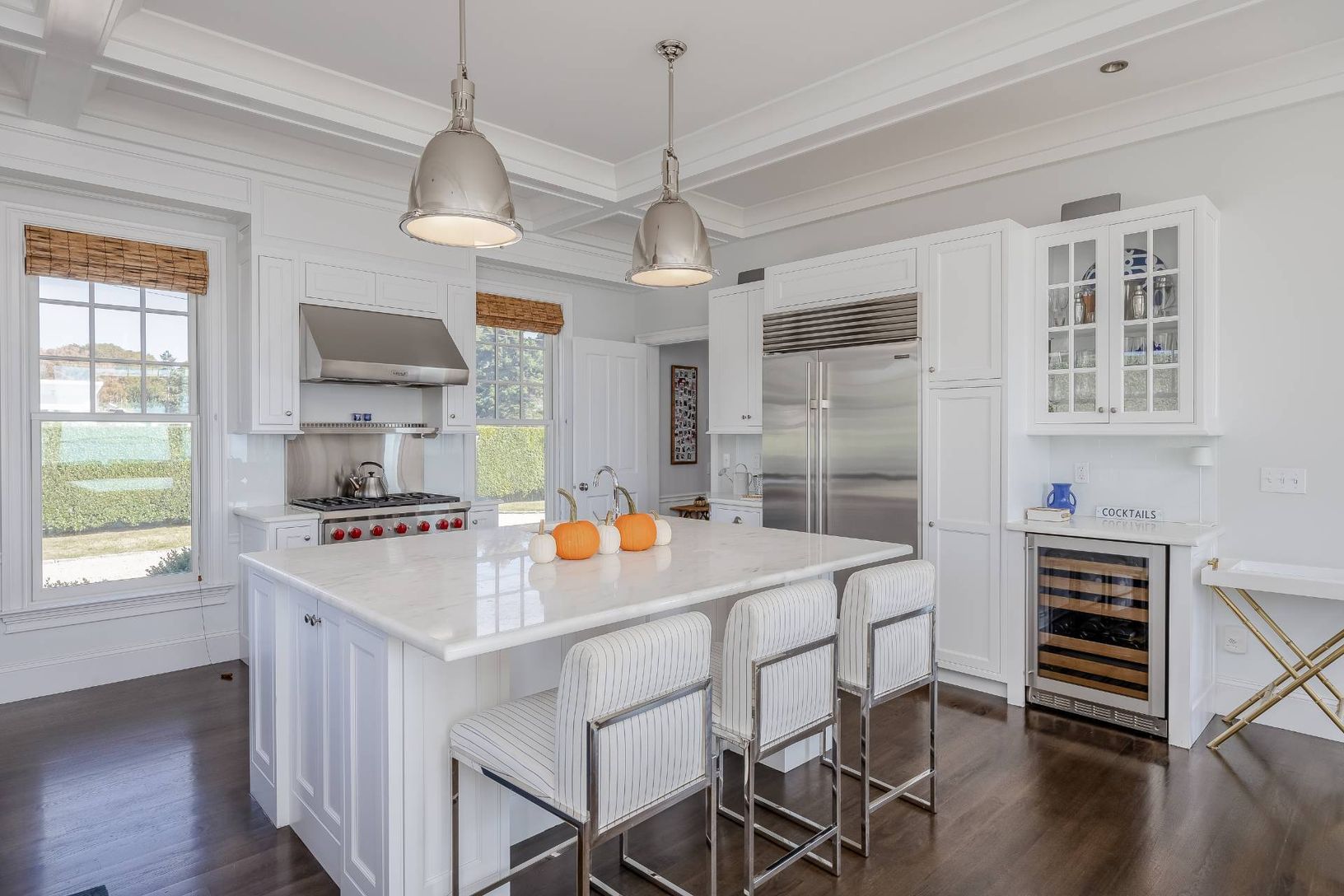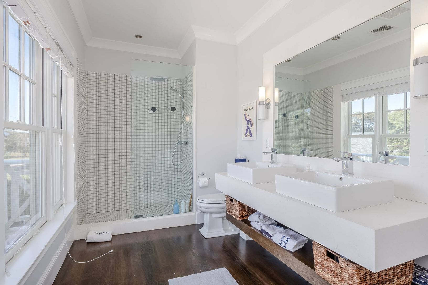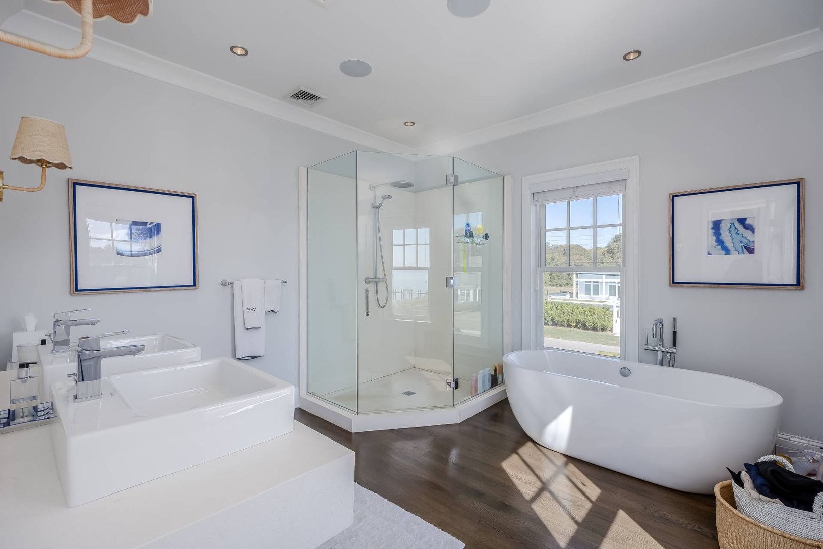 A rare offering on Shelter Island, this estate compound includes two distinct homes sold together: a traditional waterfront residence with dock located at 70 Peconic Avenue, and a recently built modern home with pool and water views at 55 Peconic Avenue, situated just across the street. The waterfront home at 70 Peconic Avenue features spectacular views from nearly every room and offers four levels of finished living space. The main floor incl