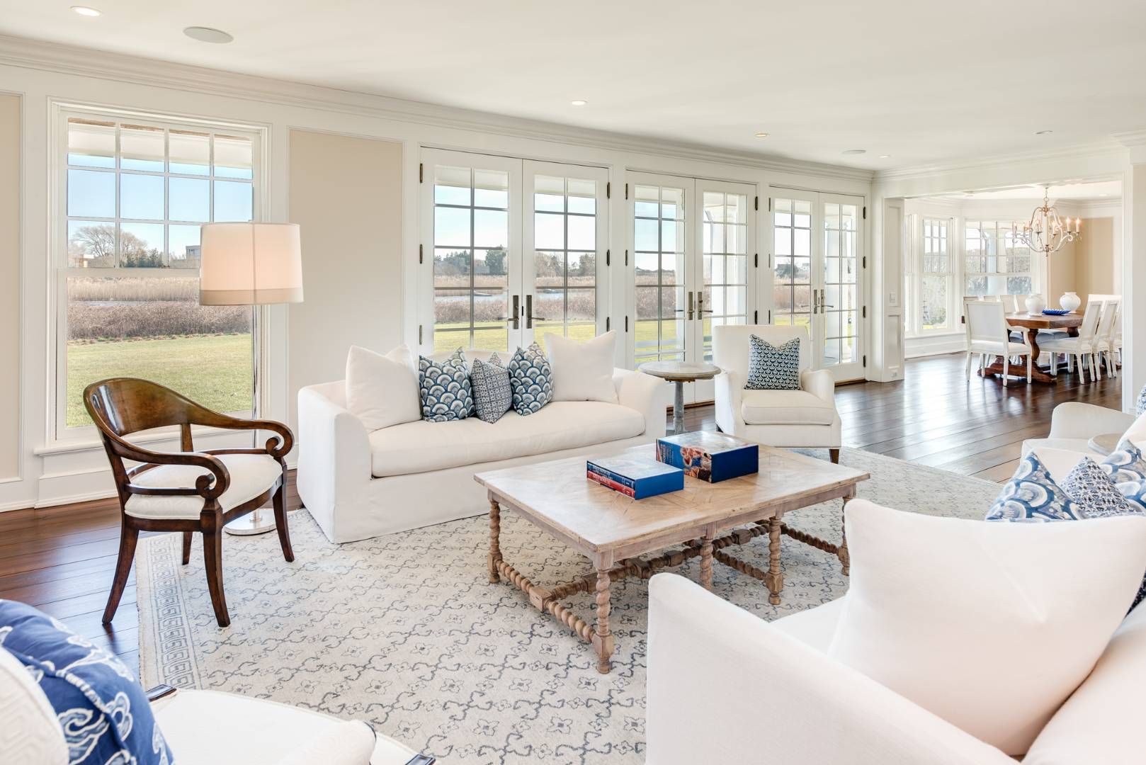 On a very desirable, quiet lane near the ocean in Bridgehampton, discover a gracious waterfront traditional with all the amenities - heated gunite pool, tennis and a private dock on Sam's Creek, with direct access to Mecox Bay and beaches. Enjoy bucolic water views from many rooms and the covered stone porch extending across the rear of the home. There are six bedrooms and five and a half baths in its 7,100+/- sq. ft. of living space. Open fir