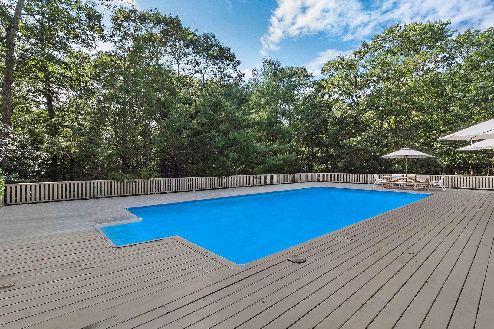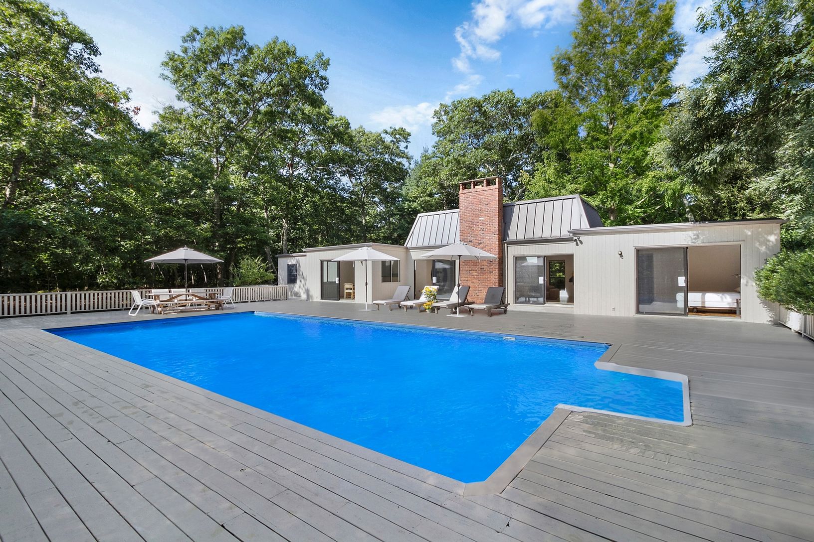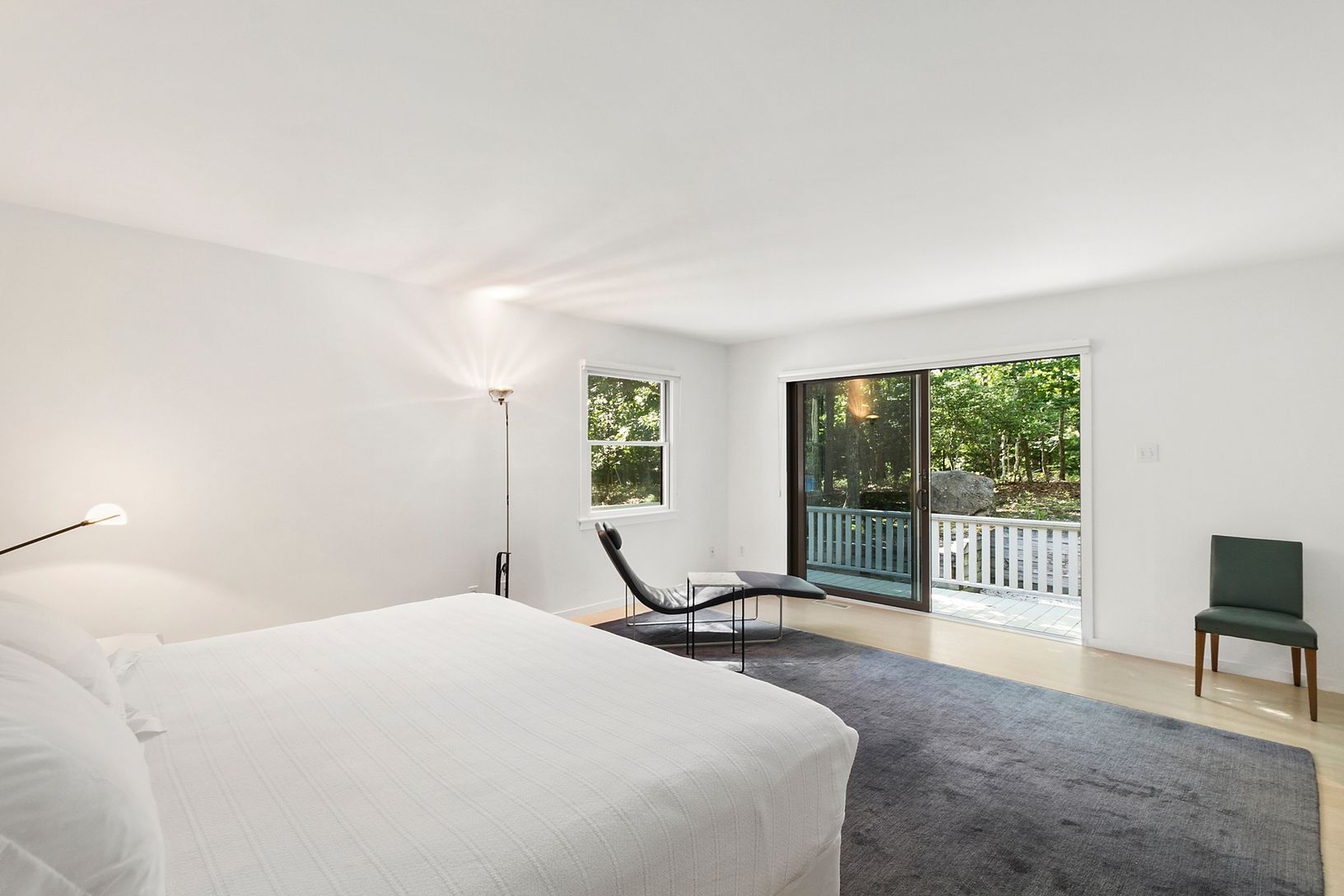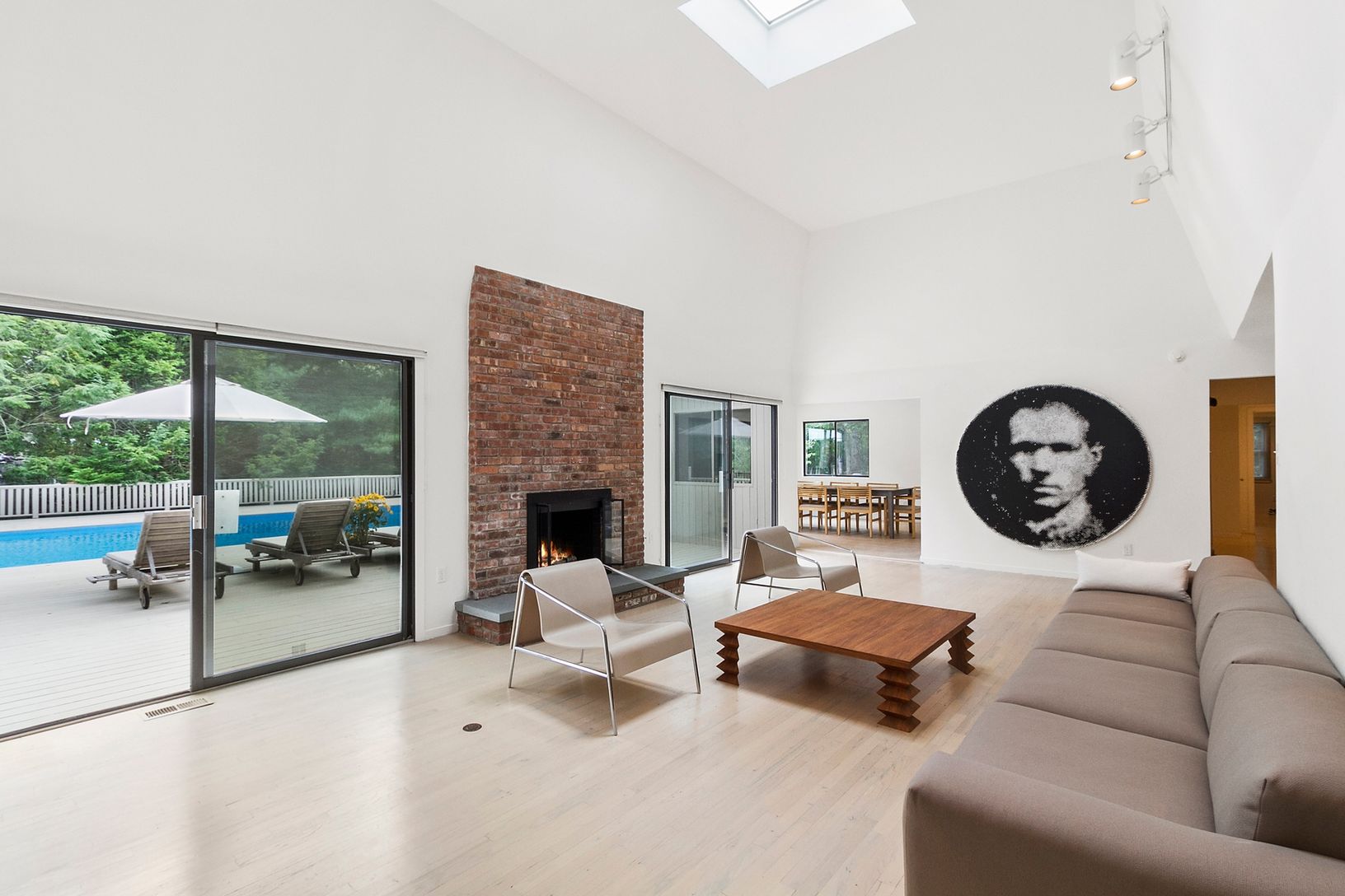 Located a short distance to East Hamptons Bays and Marina this modern, bright and open one level home on 1.4 acres is a must see. The picturesque entrance on a deep lot is eye catching as you walk up the bluestone and maturely landscaped walk way. The front door opens to a large double high living room with wood burning fireplace. This space allows perfect separation for this 4 bedroom, 3 bathroom home; with master suite that feels tucked