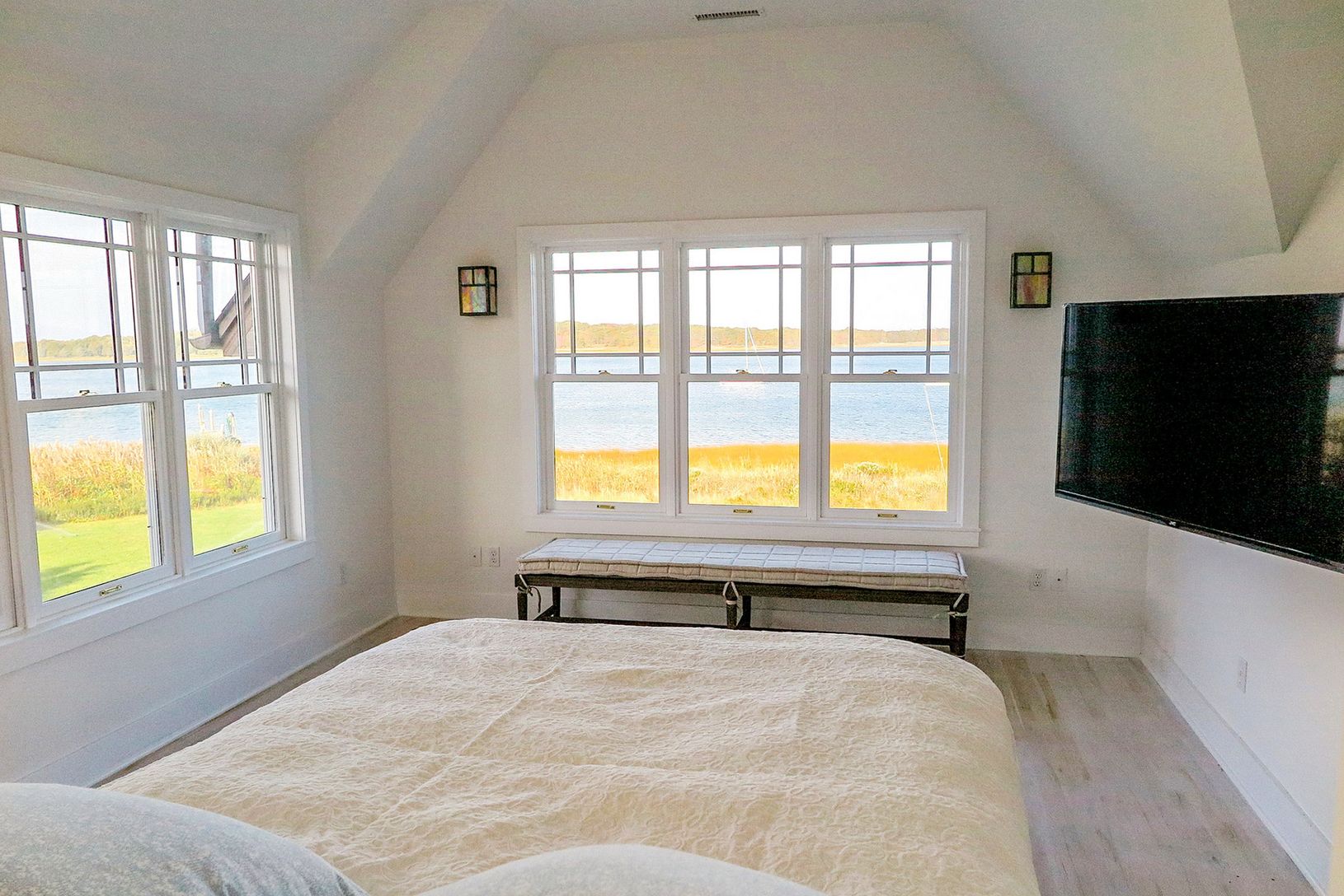 This four-bedroom, four-bath Beach House is fresh, newly decorated with a newly renovated kitchen with white marble counter tops. The floors are all new, stained white oak. There are water views from every room overlooking a waterside heated gunite pool. The house has spacious public rooms, with a gourmet kitchen and large family room. There is a new large media and entertainment room with all opening to the spacious deck on the waterside of t