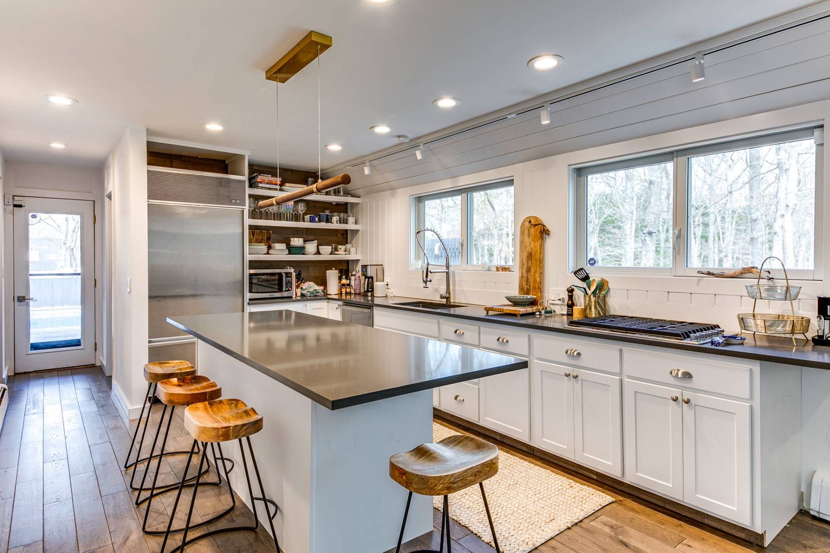 This gorgeous 3 bedroom, 3 bath modern home is centrally located near East Hampton Village and Three Mile Harbor. There is a wonderful, open living area with double height ceilings and fireplace and an open free flowing gourmet kitchen area. This incredible home has an abundance of entertaining space both inside and out. From the sliders opening up to the outdoor kitchen area to the covered porch overlooking the heated, salt water pool this ho