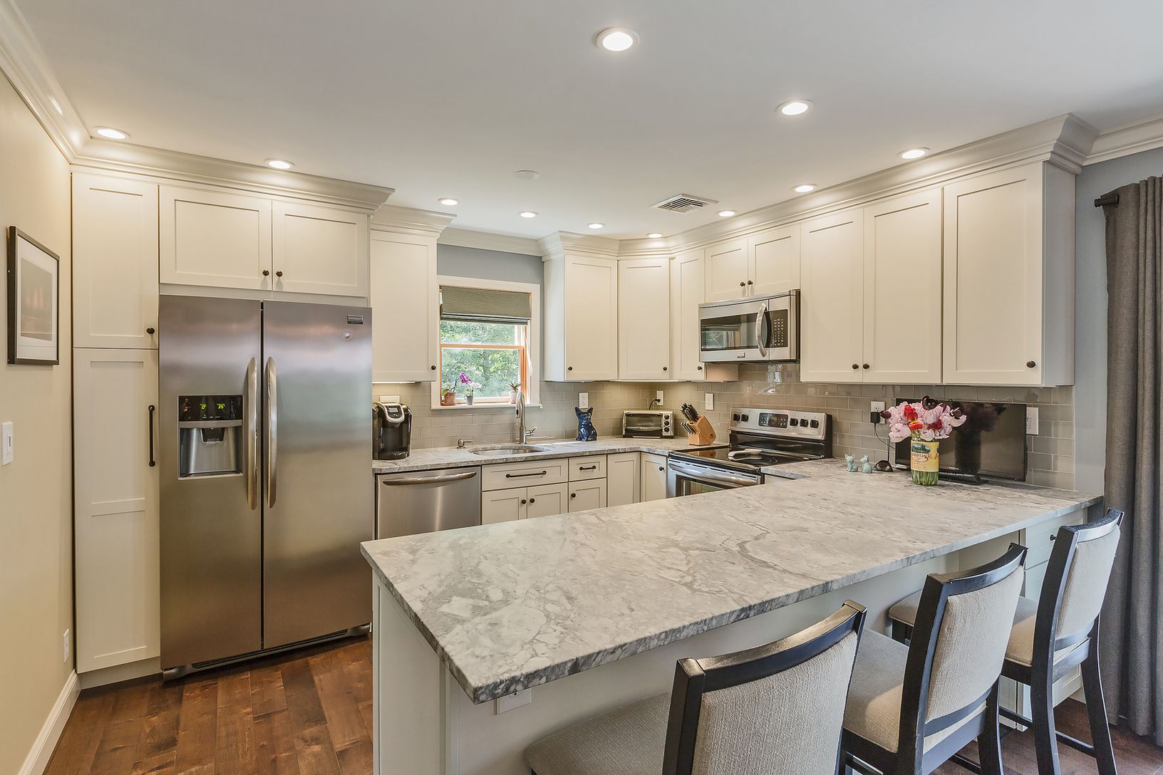 Exceptional Craftsmanship & Detail! Welcoming 3/4 Bedroom Cape, Brand New Stainless & Quartz Kitchen & Baths. Main Floor Master Suite & Laundry, 2 Guest Bedrooms, Plus Family Room/Bar or possible 4th Bedroom with Maple Floors. Formal Living Room and kichen with Fireplac