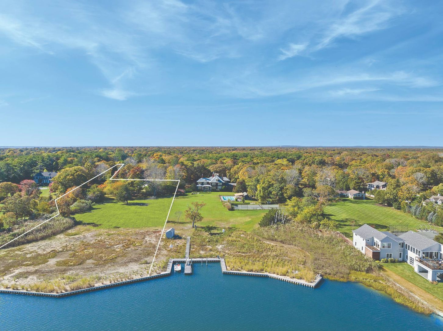 Field of Waterfront Dreams! Presenting 551 Main Street, a stunning three-acre parcel on Quantuck Bay in the coveted hamlet of Quiogue / Westhampton Beach. This rare purchase opportunity is simply beyond compare and immediately ready for a luxury build with all plans and permits in place. Down a long private driveway the property opens up to reveal the expansive and gorgeous waterfront parcel with modern bulkhead and views onto Quantuck Bay. A