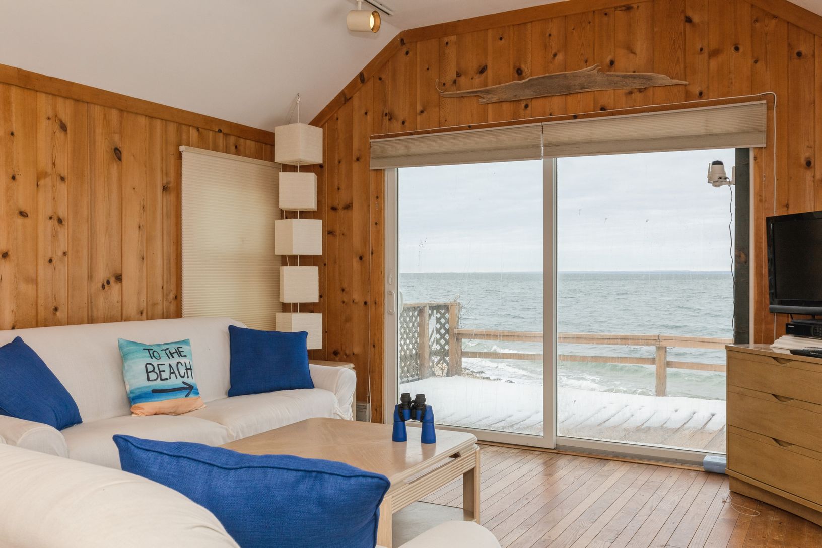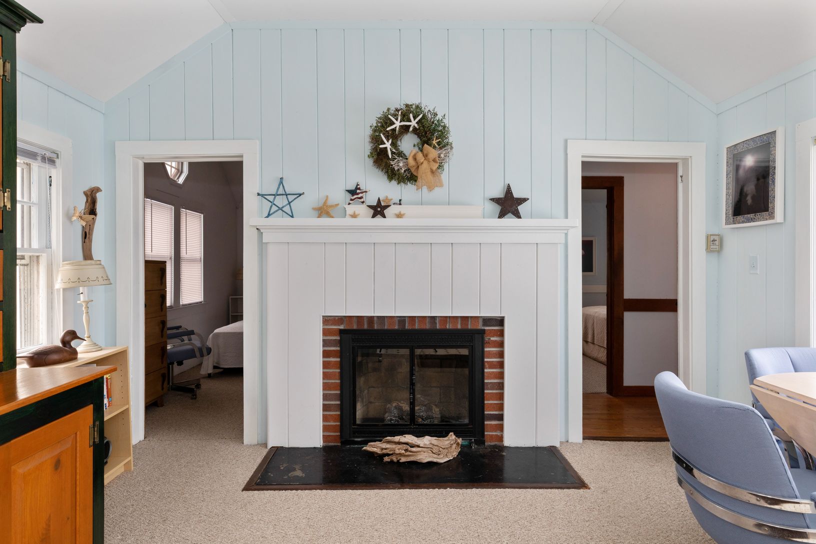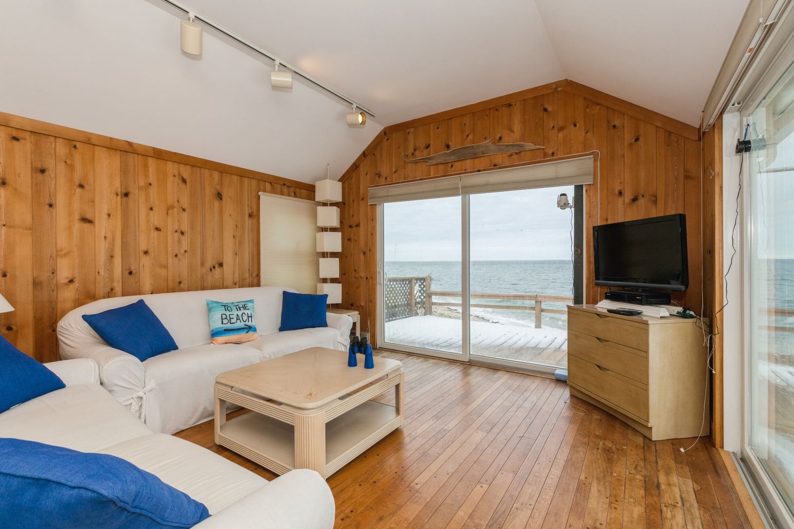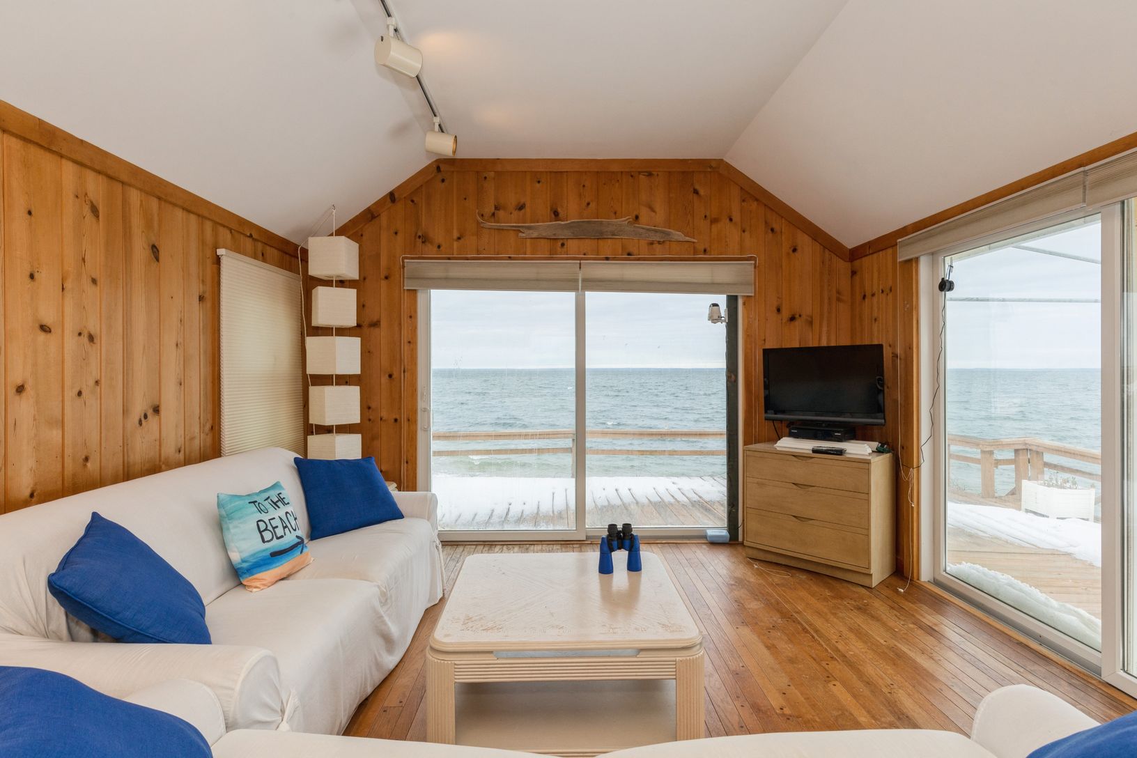 Beachfront Cottage 2B, 1BA, Living room with gas fireplace, spacious waterfront room with two set of sliders for unlimited sound view, large wrap deck with canopy, outside hot and cold shower
