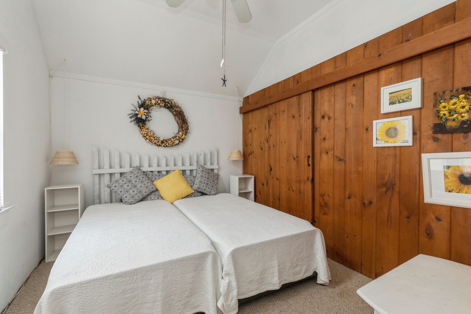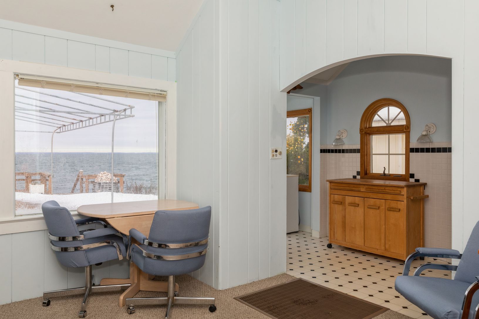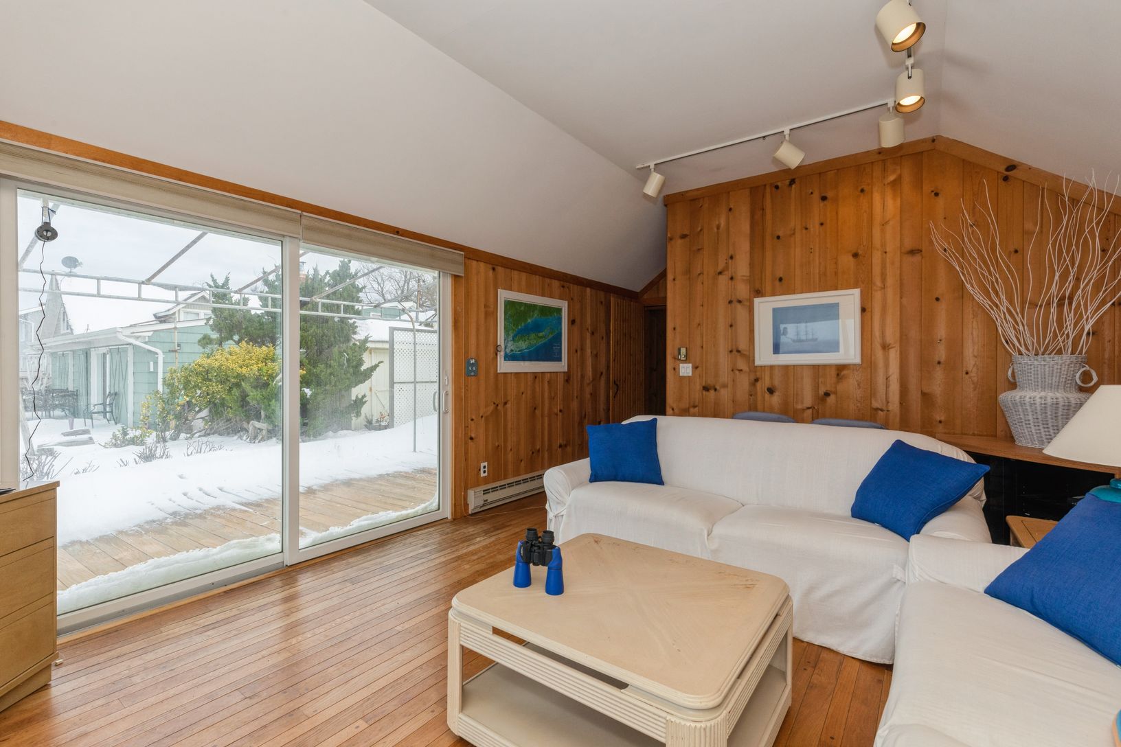 Beachfront Cottage 2B, 1BA, Living room with gas fireplace, spacious waterfront room with two set of sliders for unlimited sound view, large wrap deck with canopy, outside hot and cold shower