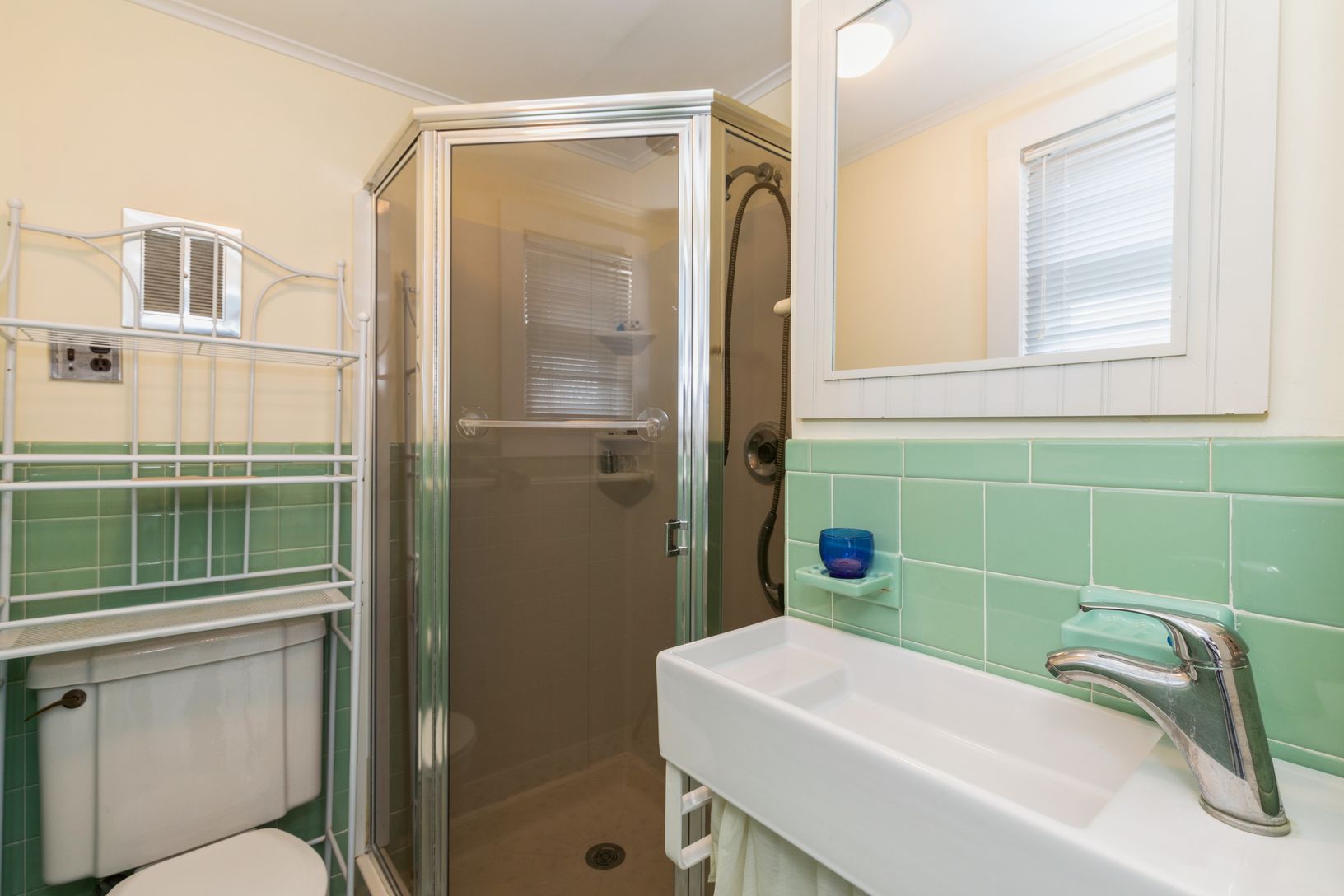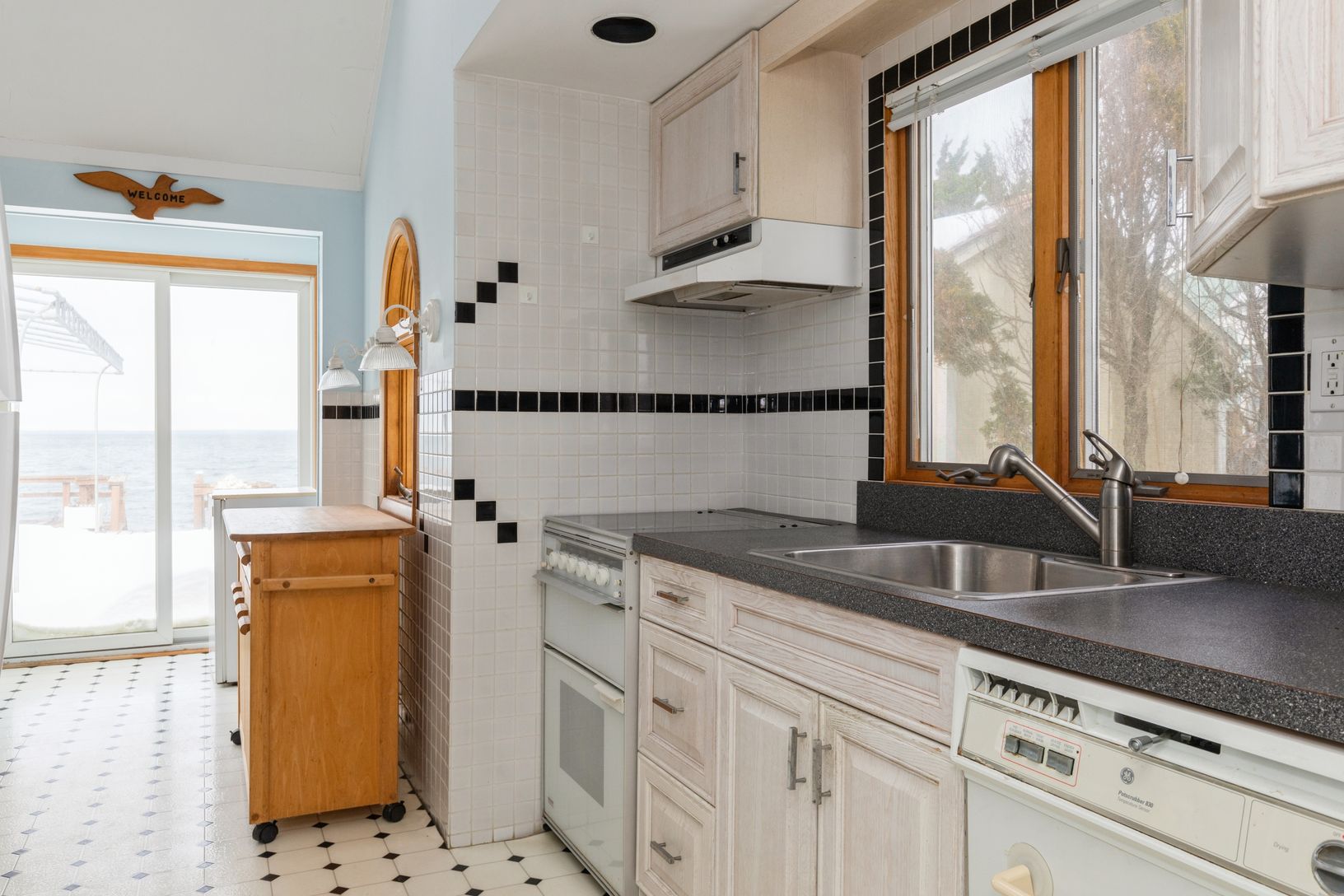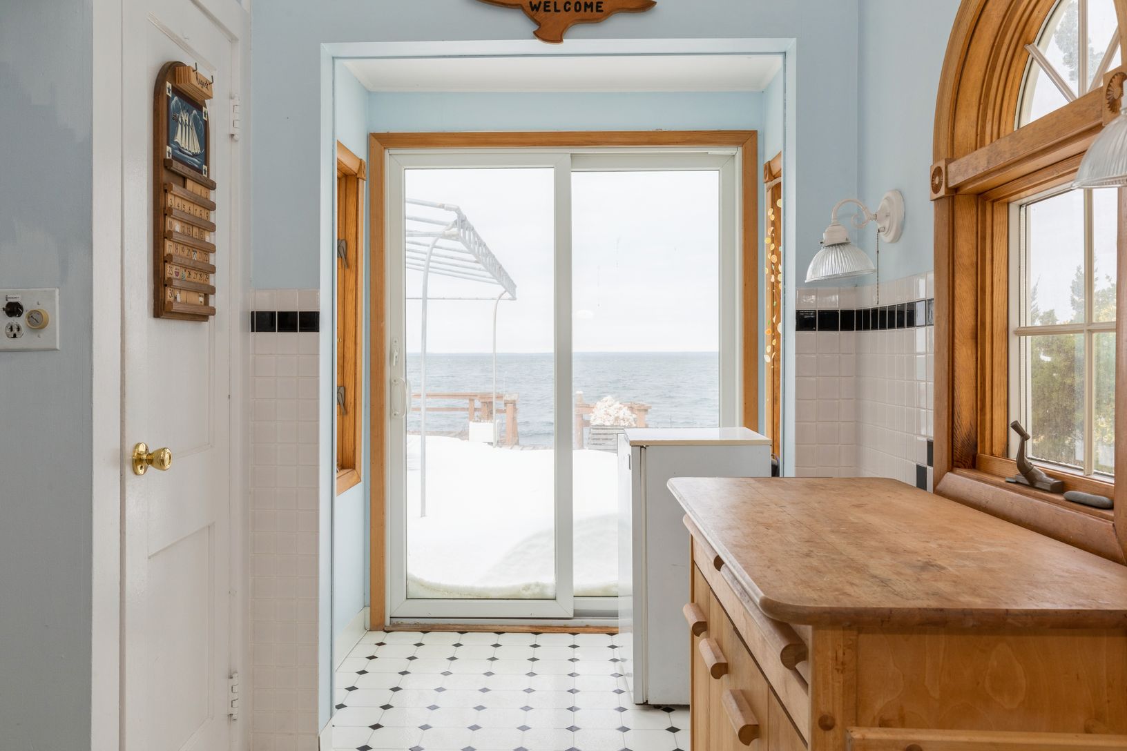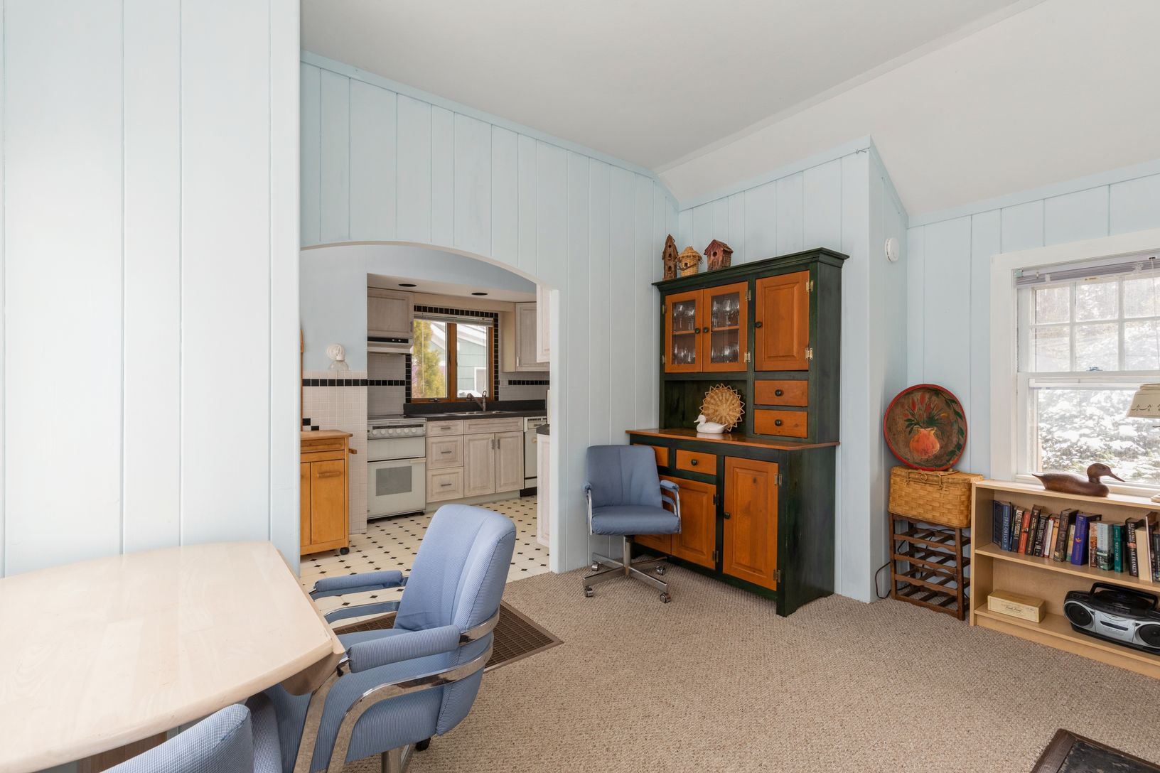 Beachfront Cottage 2B, 1BA, Living room with gas fireplace, spacious waterfront room with two set of sliders for unlimited sound view, large wrap deck with canopy, outside hot and cold shower