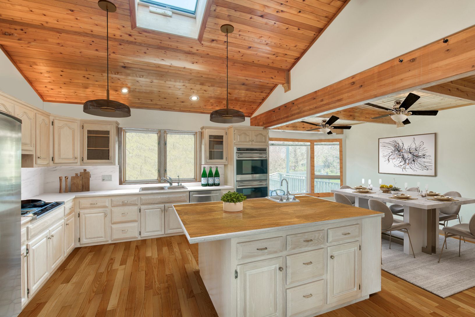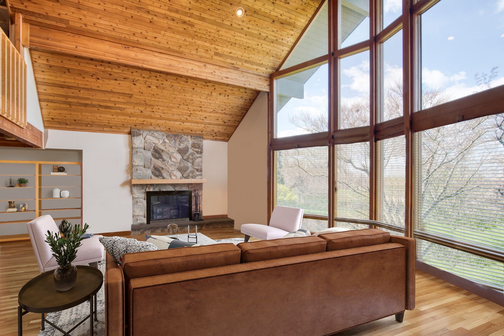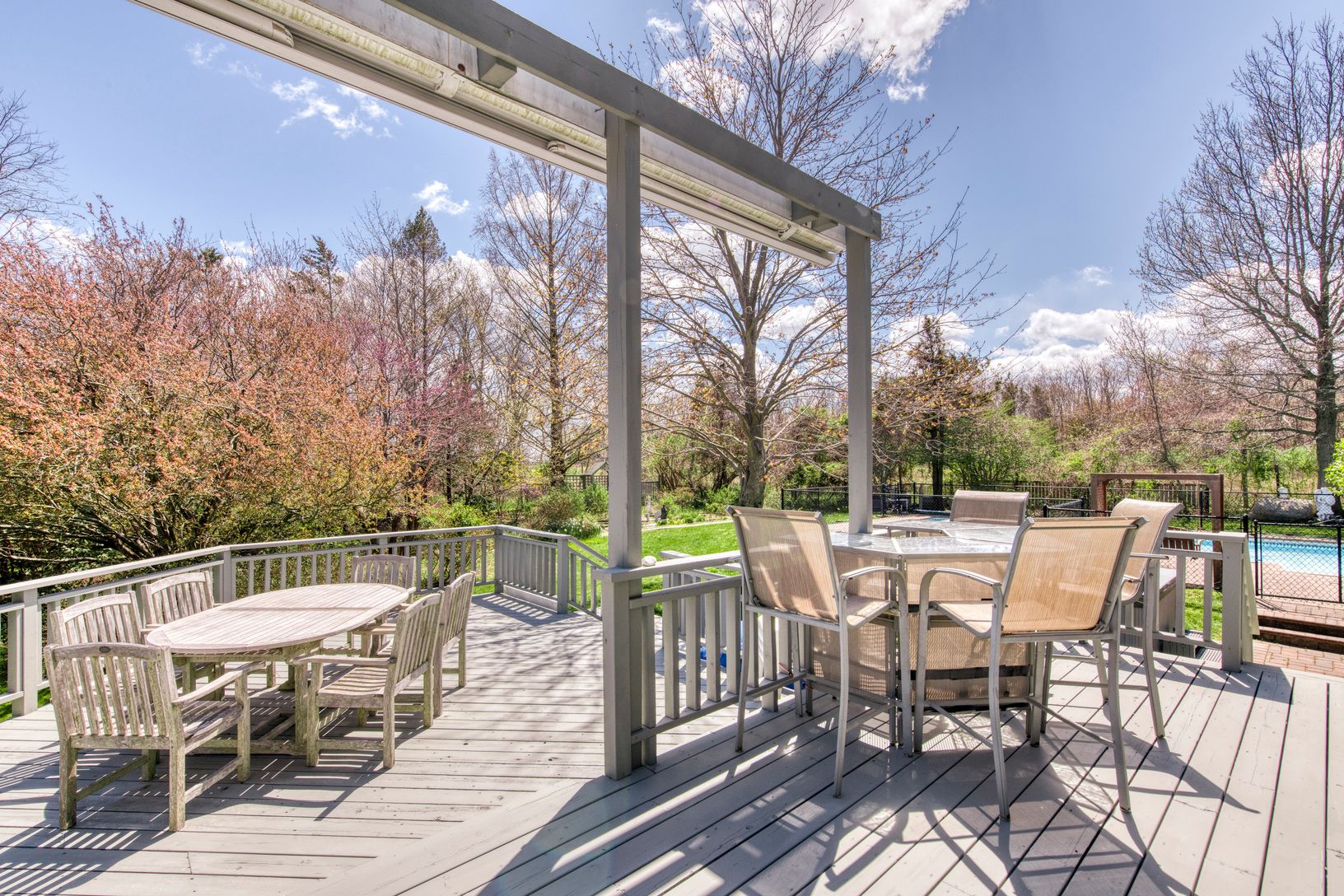 Post & Beam 3600sf home, views of LI Sound & meadows on 5+ lush acres feature pond & waterfall, flower beds, mature trees, putting green & sand trap, large heated pool & hot tub, outdoor shower, 2 multi-level decks w/ retractable awnings, 2 utility sheds, playground with swings & a patio. This 3 bedroom easily converts to 4 bedrooms, has natural light & flowing floorplan, a great room w/ soaring ceilings & windo