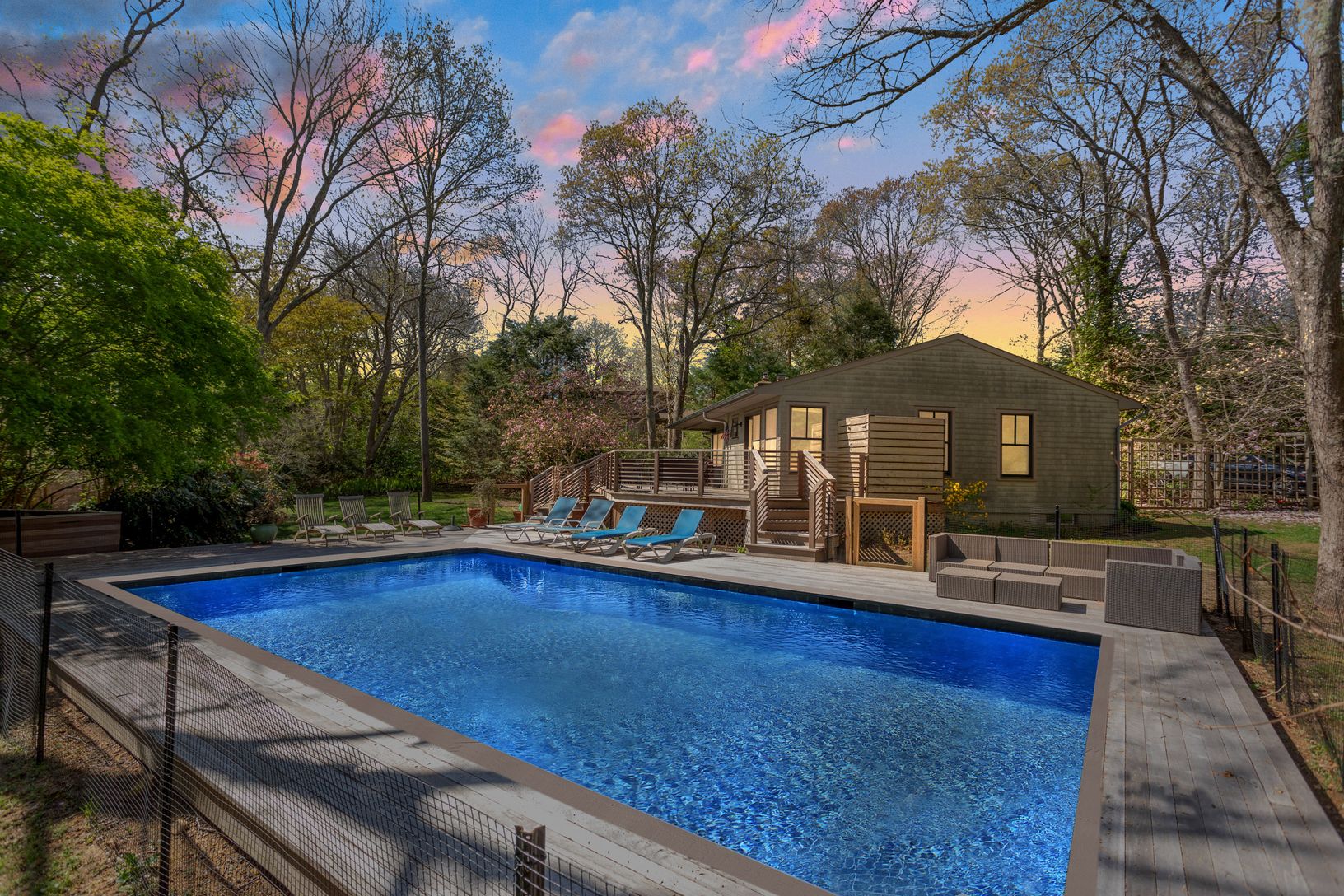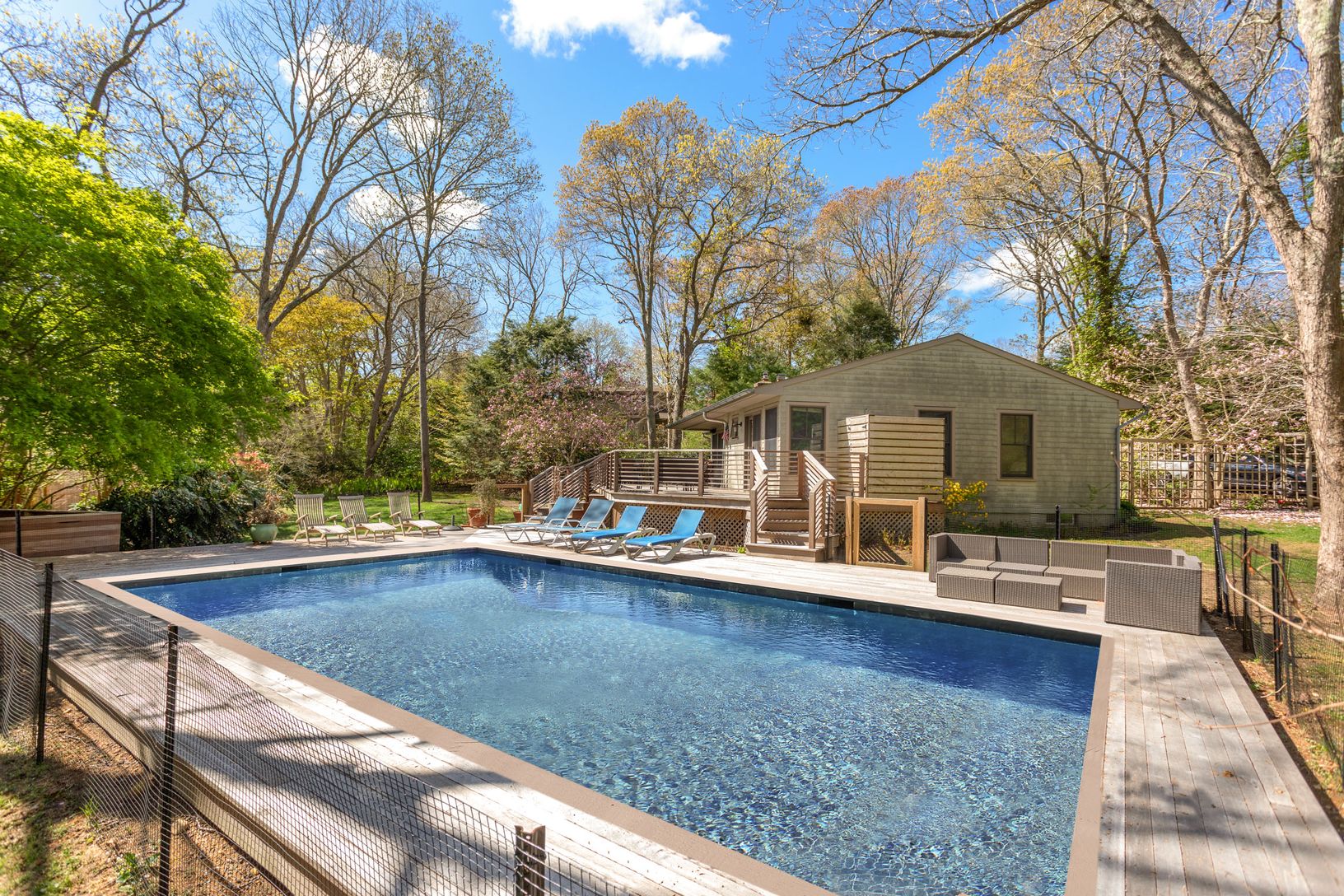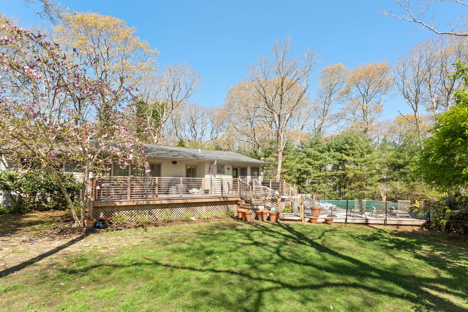 Renovated ranch with an open layout and high end appliances: SubZero, Miele, 1100 sqr ft with 900 sqr ft deck on .75 acres, new gunite pool & deck, outdoor shower, central AC, fireplace, basement, perennial garden, less