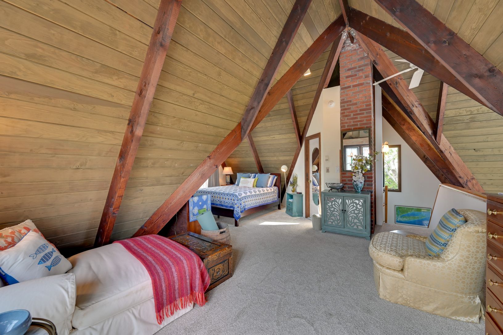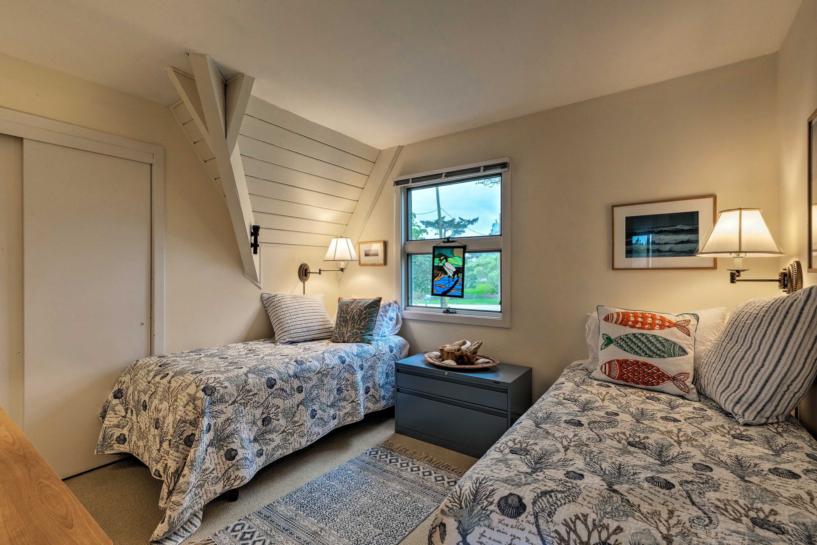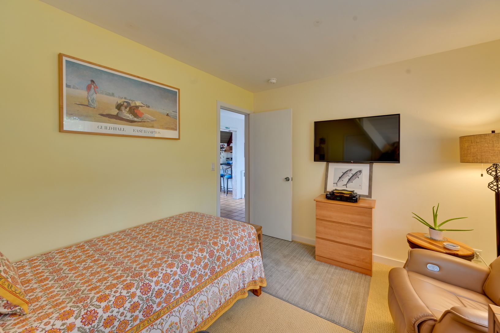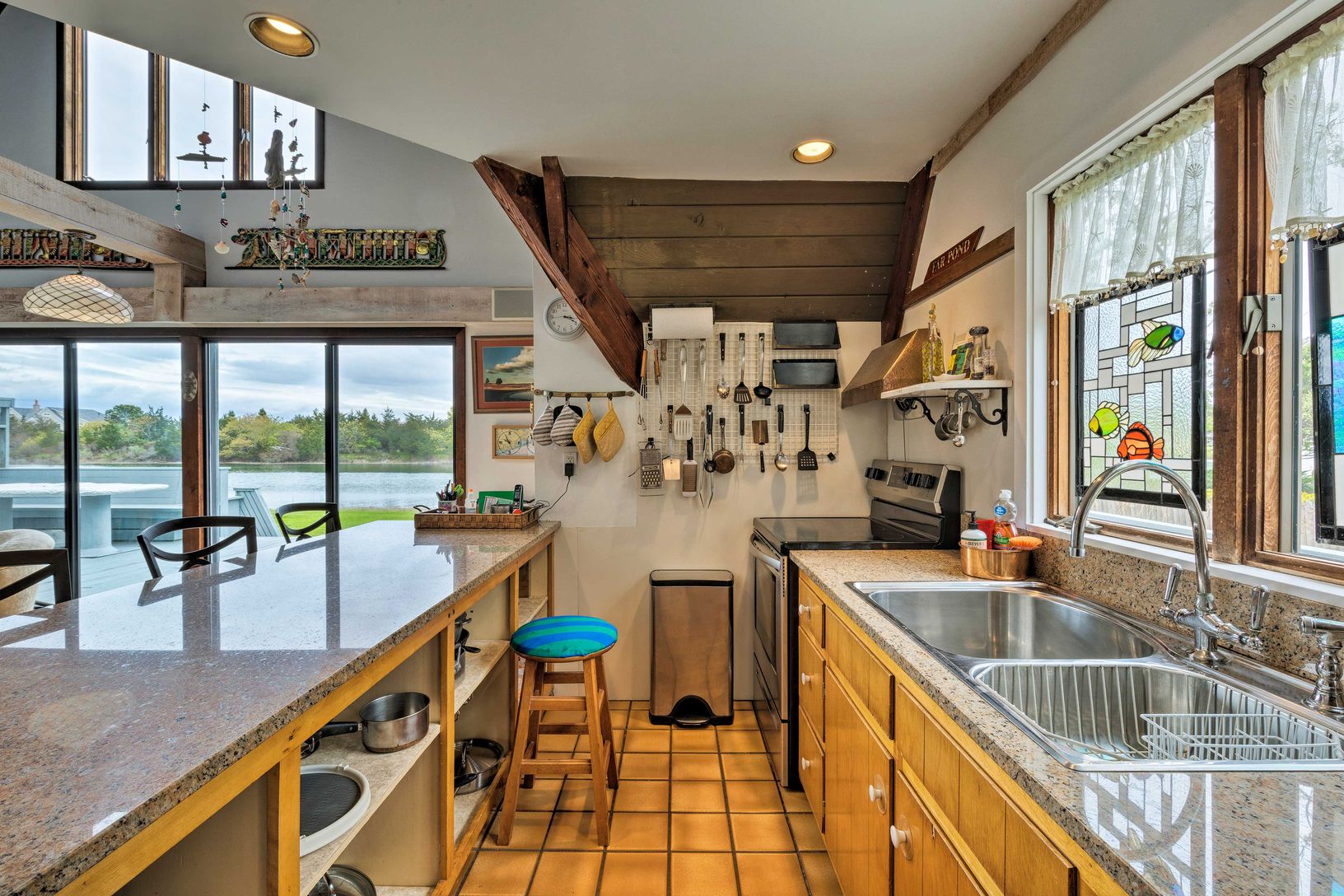 This charming mid-century modern A-frame is located one mile from the Shinnecock Hills Golf Course, steps from a serene pond, and offers views of Shinnecock Bay. Quiet neighborhood. The beach at the end of the road has nice walking, swimming, clamming, and spectacular sunsets. Enjoy casual dining on the deck overlooking nature and active bird life. Sleeps five.
