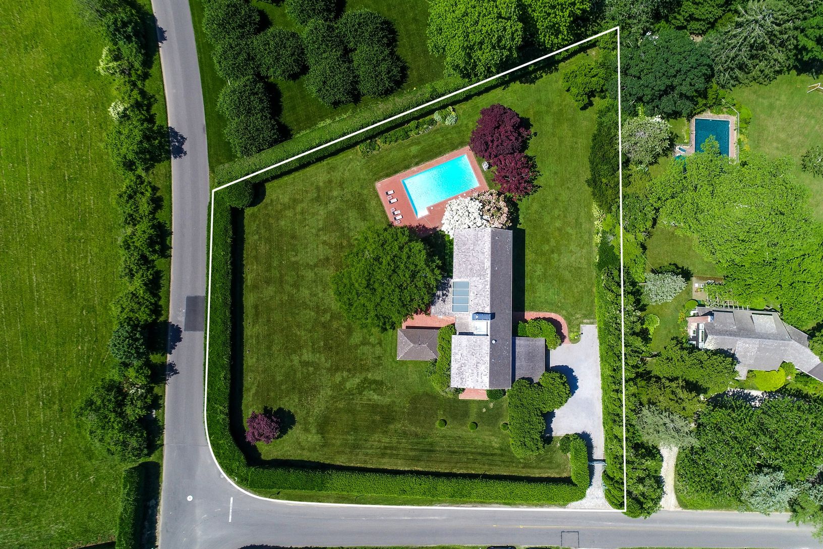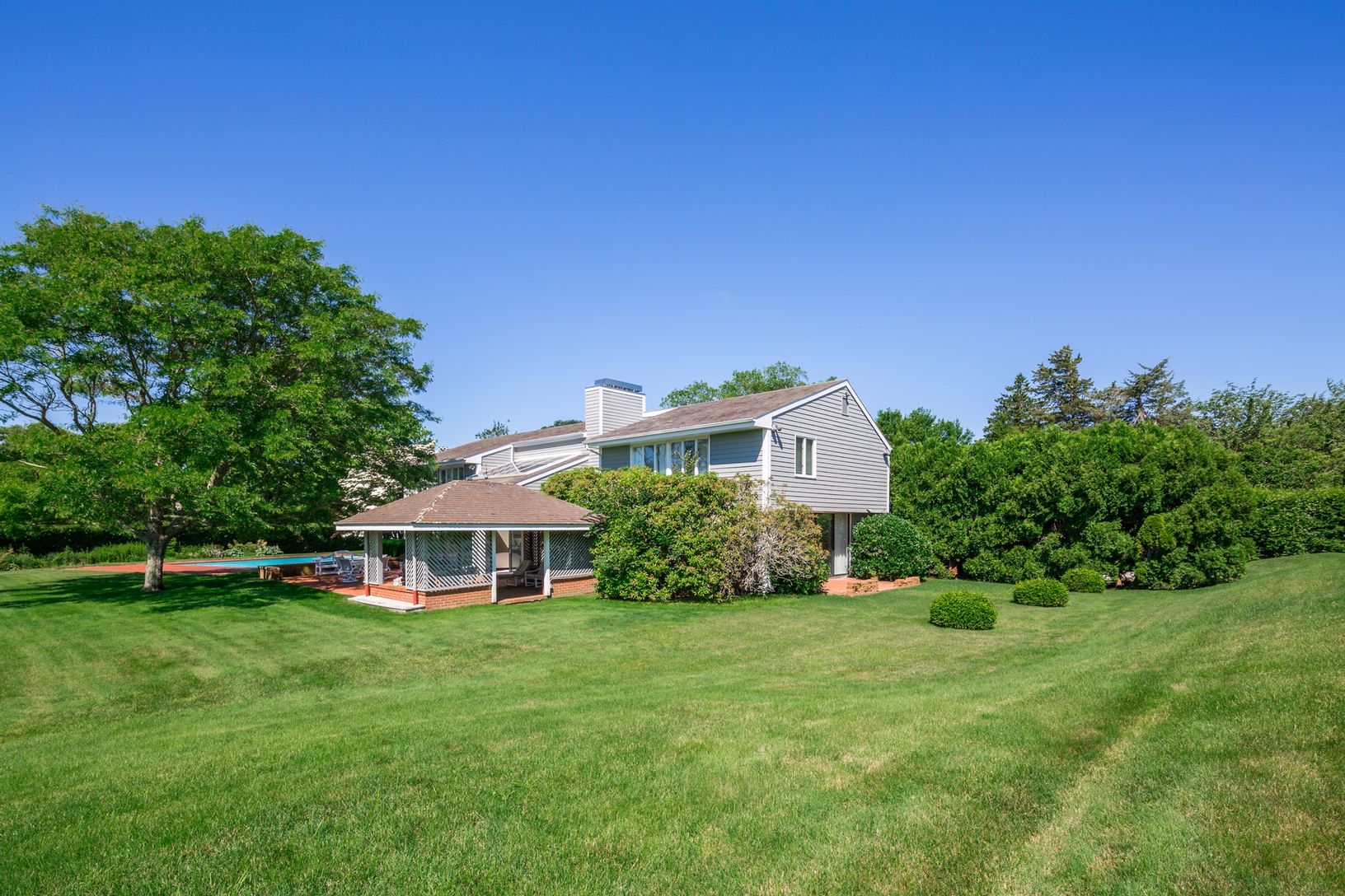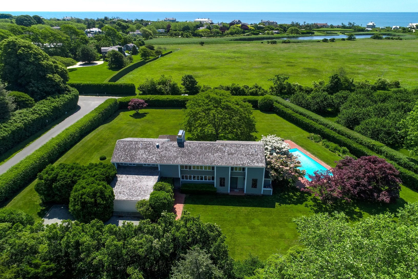 Outstanding redevelopment opportunity in prime estate location with distant oceanview and short stroll to Georgica beach. Gated 1.07 acre with light-filled contemporary featuring double-height skylit living room with fireplace, kitchen with breakfast area and gas grill, separate dining room, 5 bedrooms, 4 baths. Beautiful hedged grounds with rolling lawn, specimen trees and 40 ft heated pool. Zoning allows a 5461 sq ft residence plus finished