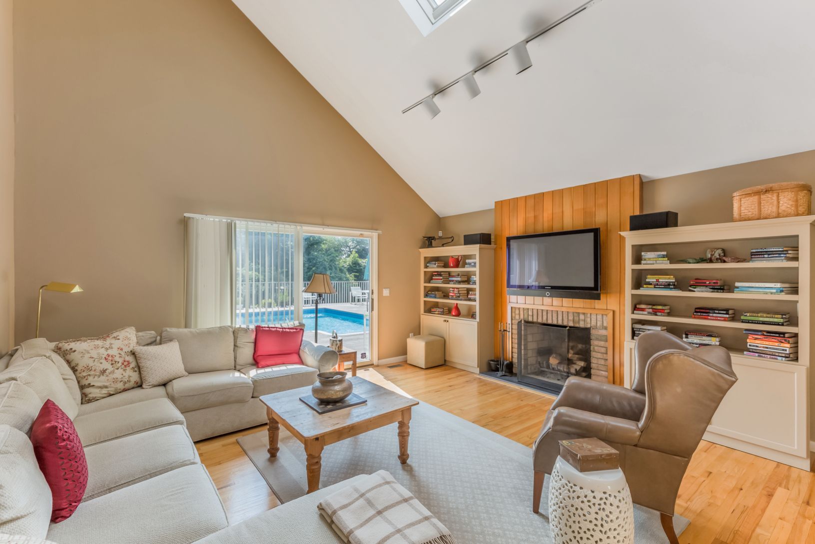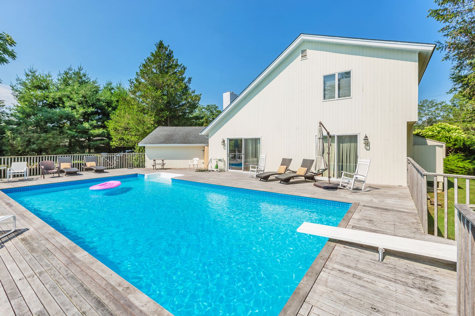 Mint two story contemporary. Very private 1/2 plus acre. Four bedrooms 2 1/2 baths with the master on the first floor. Vaulted ceiling in open living room with fireplace. Attached garage with outside entrance. Large pool with childproof fence surrounded by mahogany deck. Brand new central air. Low taxes and beach rights complete this offering. HURRY! Weekend showings only with 24 hr notice!