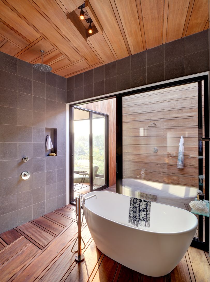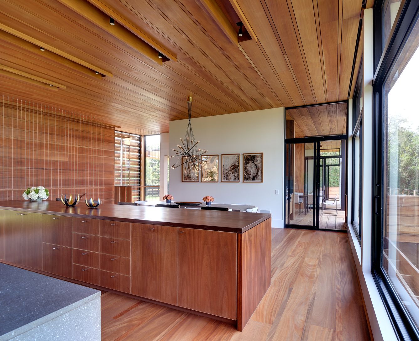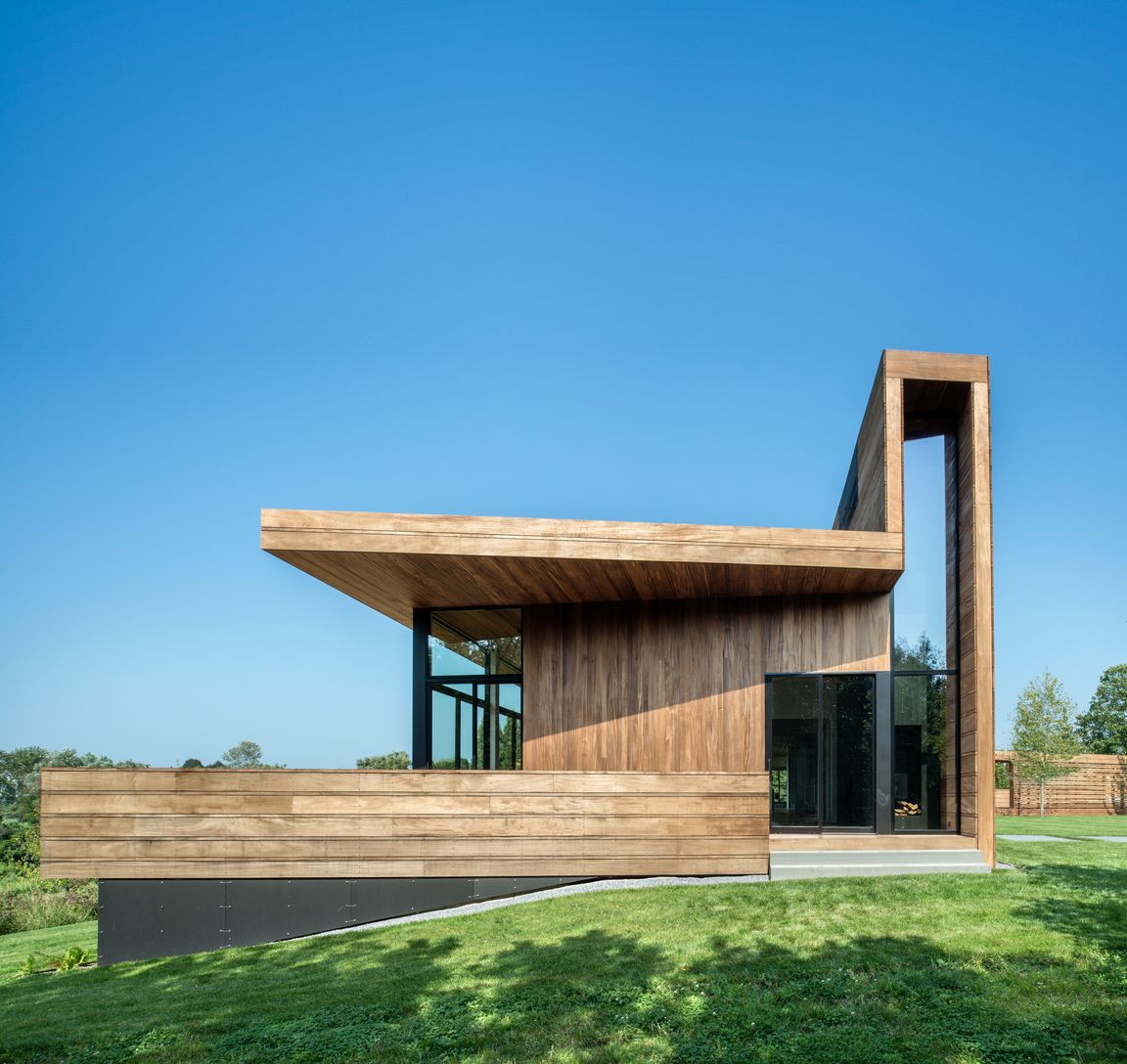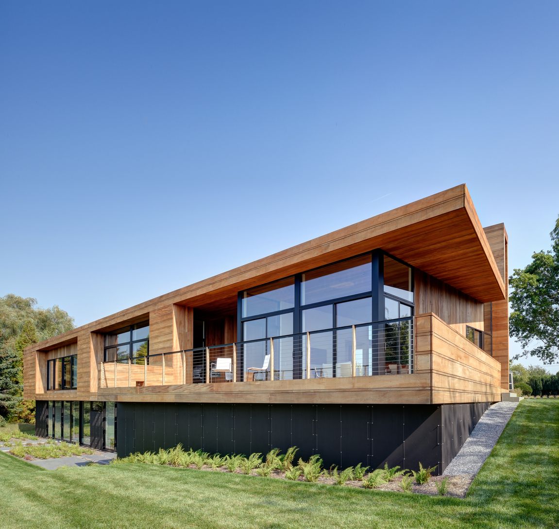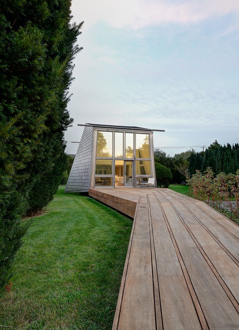 Located south of the highway on 2.3 very private acres, this modern retreat designed by Bates Masi Architect, and built by K.Romeo Builders features six ensuite bedrooms and two powder rooms. In addition, there is a guest house with a bedroom, full bath, a living room and a kitchen. The property features an infinity edge pool, a pool house with a full bath, and a tennis court. The light filled home has an open plan kitchen and dining area with
