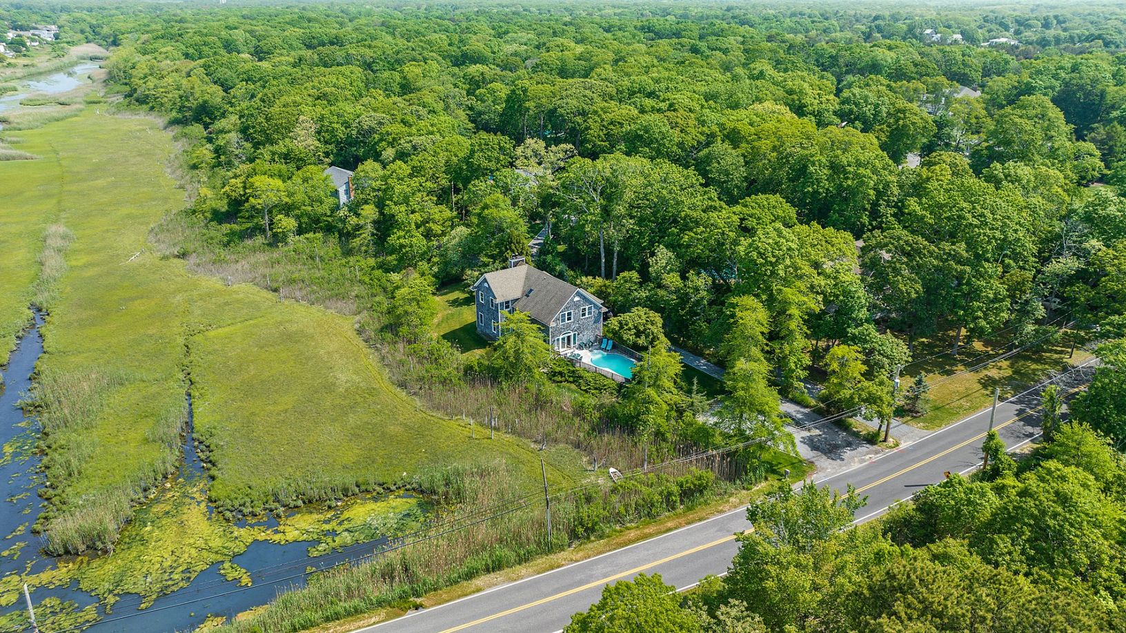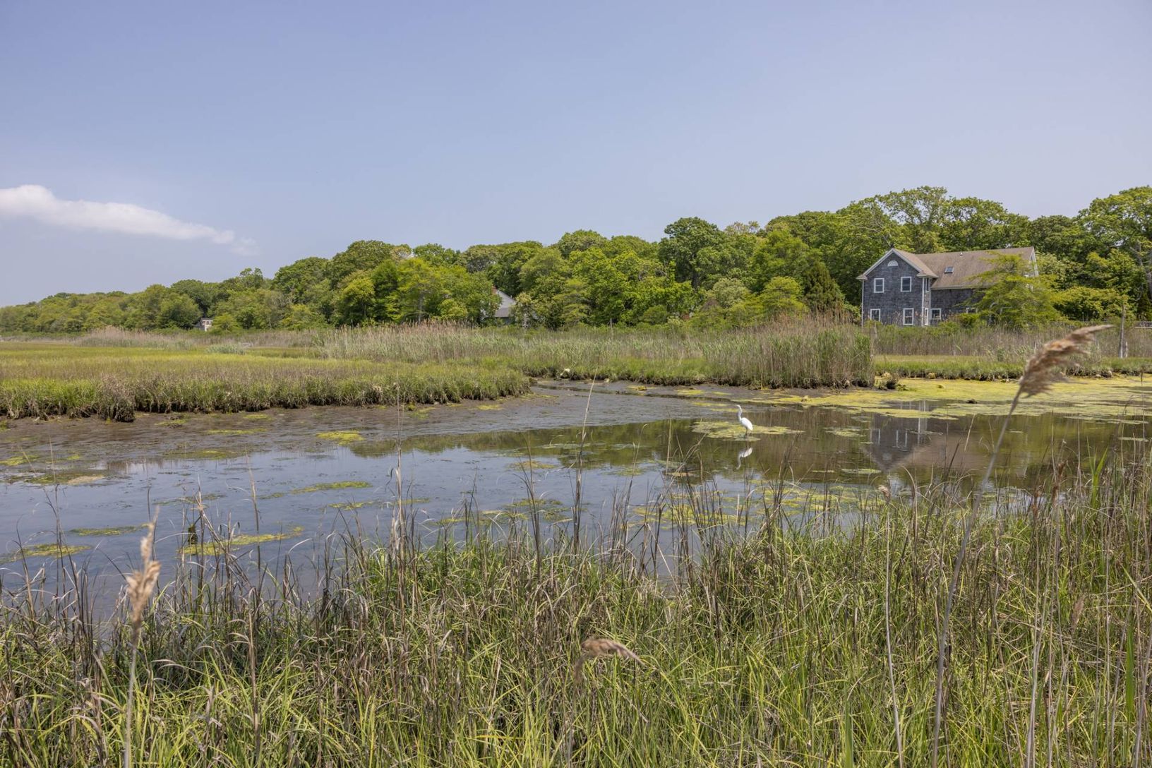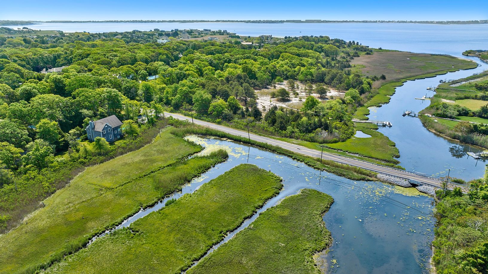 Spectacular west-facing retreat with glorious estuary views and bird watching for days! 56 South Country Road is an expansive and sun-filled beach house with multiple living and gathering spaces both indoors and out to enjoy nature and the best the Hamptons has to offer. The generously designed 2700 sf home features three large and sunny bedrooms and three additional bonus rooms to use as dens, guest spaces or for working from home. There are