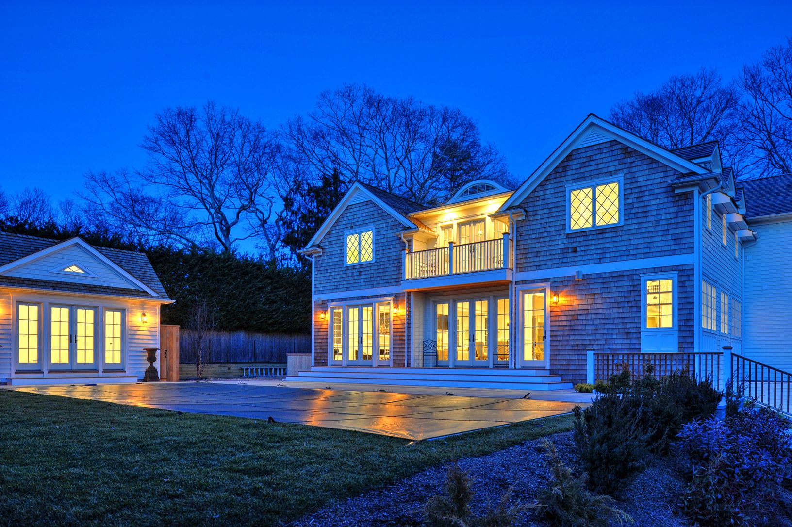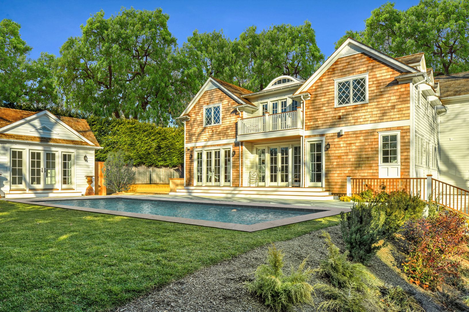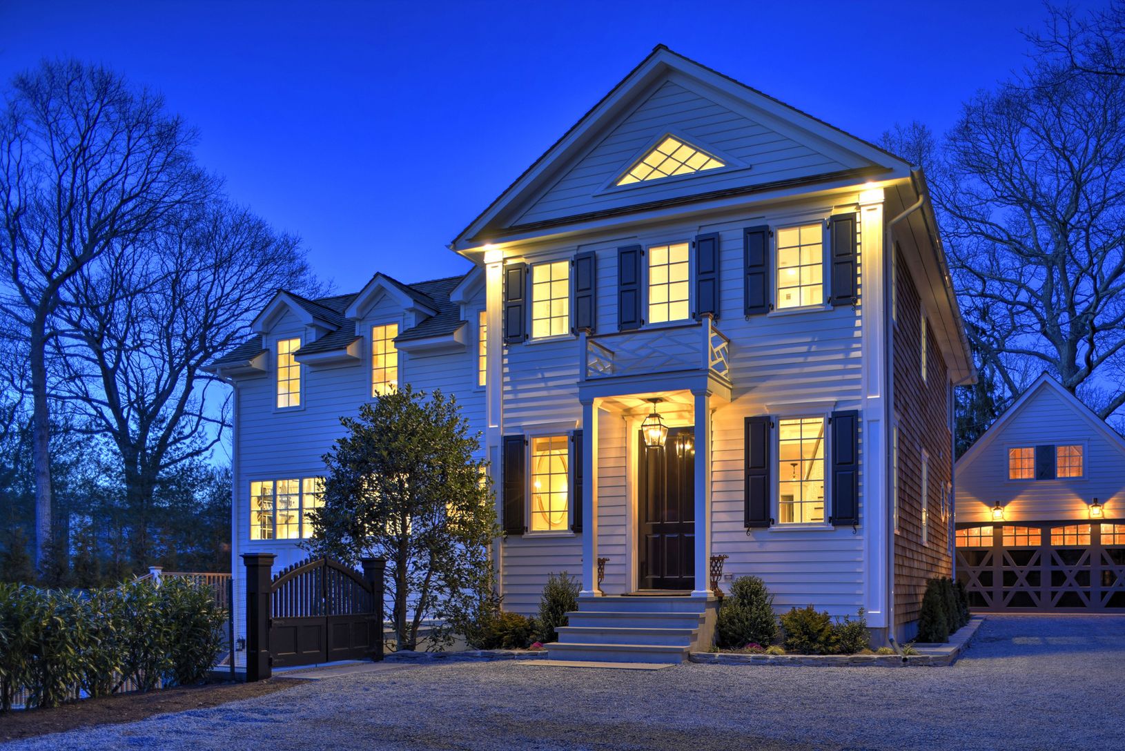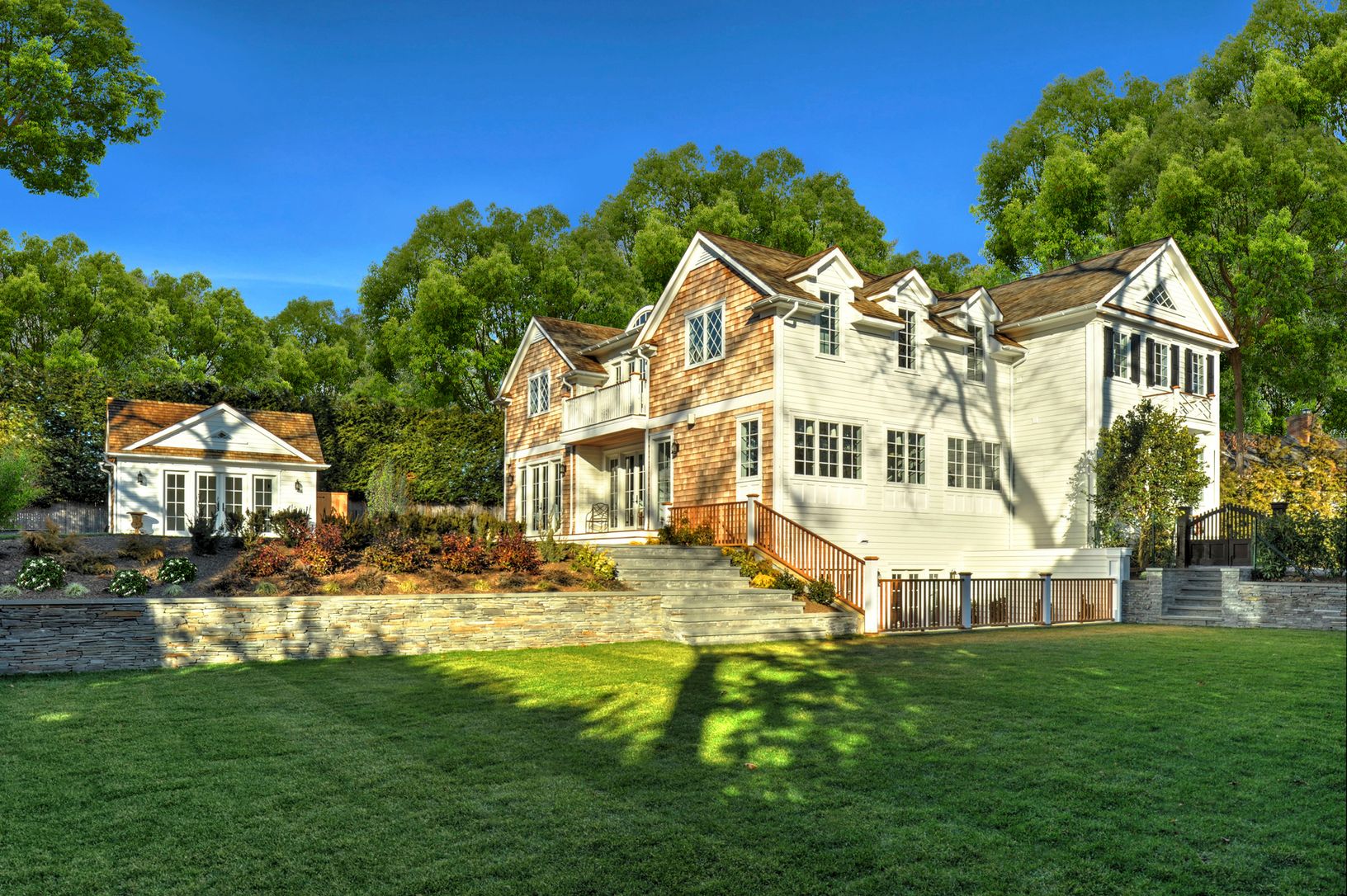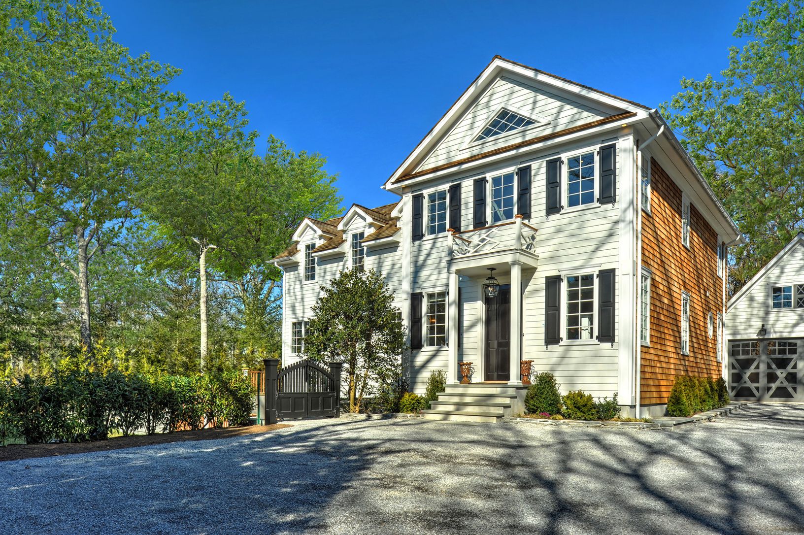Stately white gates swing open from a quiet village lane to introduce this lovely estate-like property. The newly constructed home, separate garage and pool house sit within lawns terraced by stacked stone walls and stairways leading to the gunite pool and patios. The house has a Greek Revival façade and three living levels, accessible by stairway or elevator. The front door opens into a 2 ½-story foyer leading through a gallery into the li