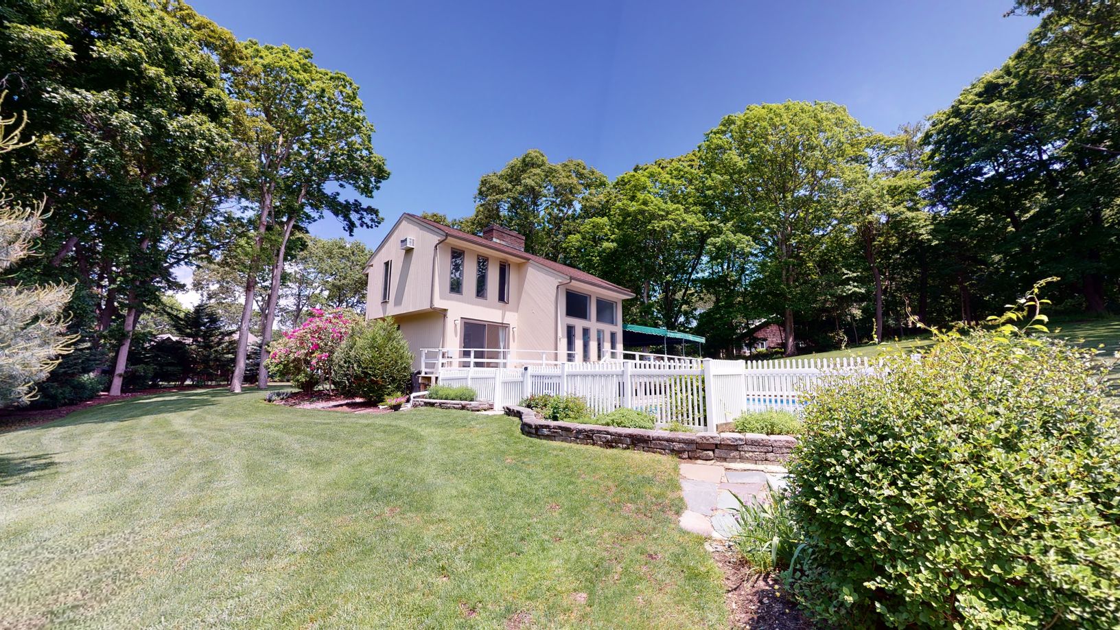 Beautiful park-like grounds surround this well-maintained home with three levels of living. 1,700 sq.ft. on the main and second floor plus additional 900 sq.ft. finished basement. Main floor with EIK, cathedral ceilings and fireplace in living room, first floor bedroom with sliders out to back deck/pool area. Second floor with two bedrooms and full bathroom. Finished lower level with separate walk-out entrance offering additional living room,