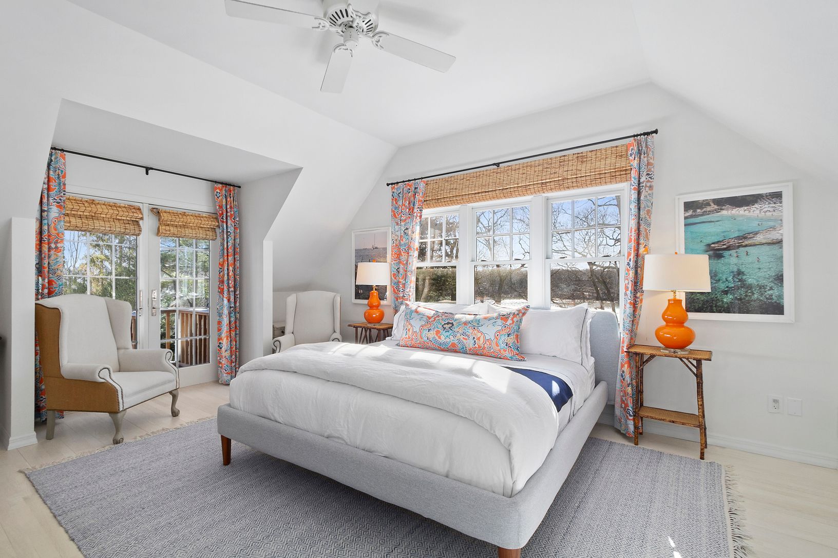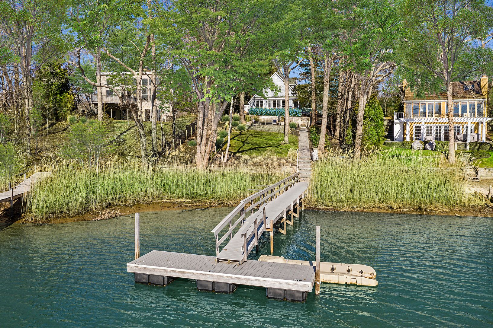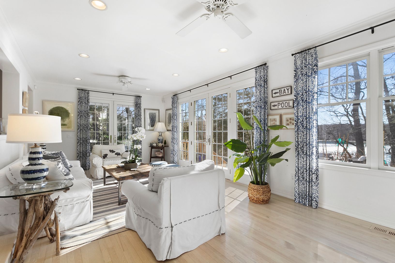 Perched facing west on an elevated waterfront property, sits this turn-key home surrounded by sunset views from most rooms. This two-story 4 bedrooms, 3.5 bath traditional home, graced by a covered entry, opens to a chic ‘beachy' interior executed with high end details and finishes and filled with an abundance of natural light. The main floor boasts an open living area combining a sophisticated kitchen with custom paneled refrigerator/freeze