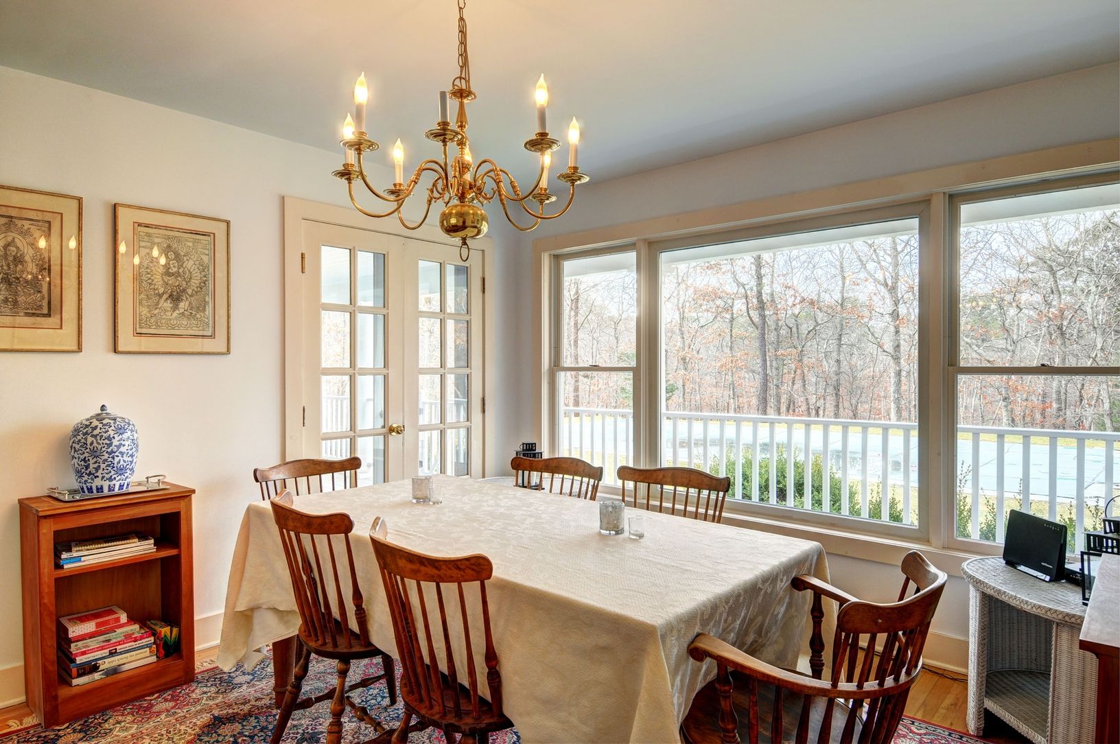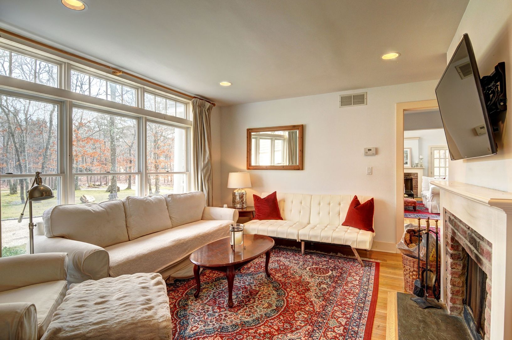 Rental Registration #: 17-109 Nestled on almost 5 acres this spacious post modern is located down a long gated drive situated between East Hampton and Sag Harbor. This charming home features 3 bedrooms, all with vaulted ceilings, 3 baths, living room with soaring light and fireplace, formal dining room with fireplace. In addition, there is a den, also with fireplace, that could serve as a fourth bedroom. The charming covered porch overlooks th