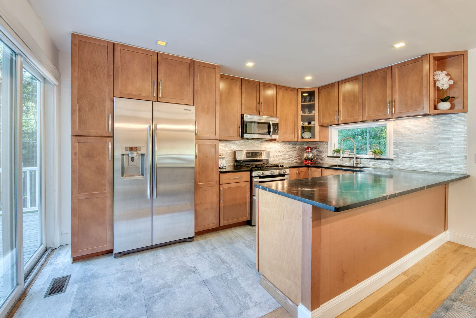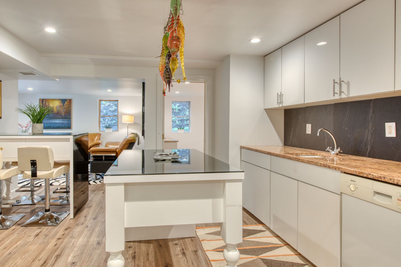 This nicely renovated contemporary house offers an open floor plan, fireplace, high end kitchen and lots of light. Three bedrooms, three beautiful baths on main level, with finished walkout below. Sunny decking off of the entire length of the house. Gym, wet bar, laundry, den and possible bedroom/office and two baths on the lower level. Private, set high, behind a gate, this lush, multi layered landscaped property surrounding a great yard has