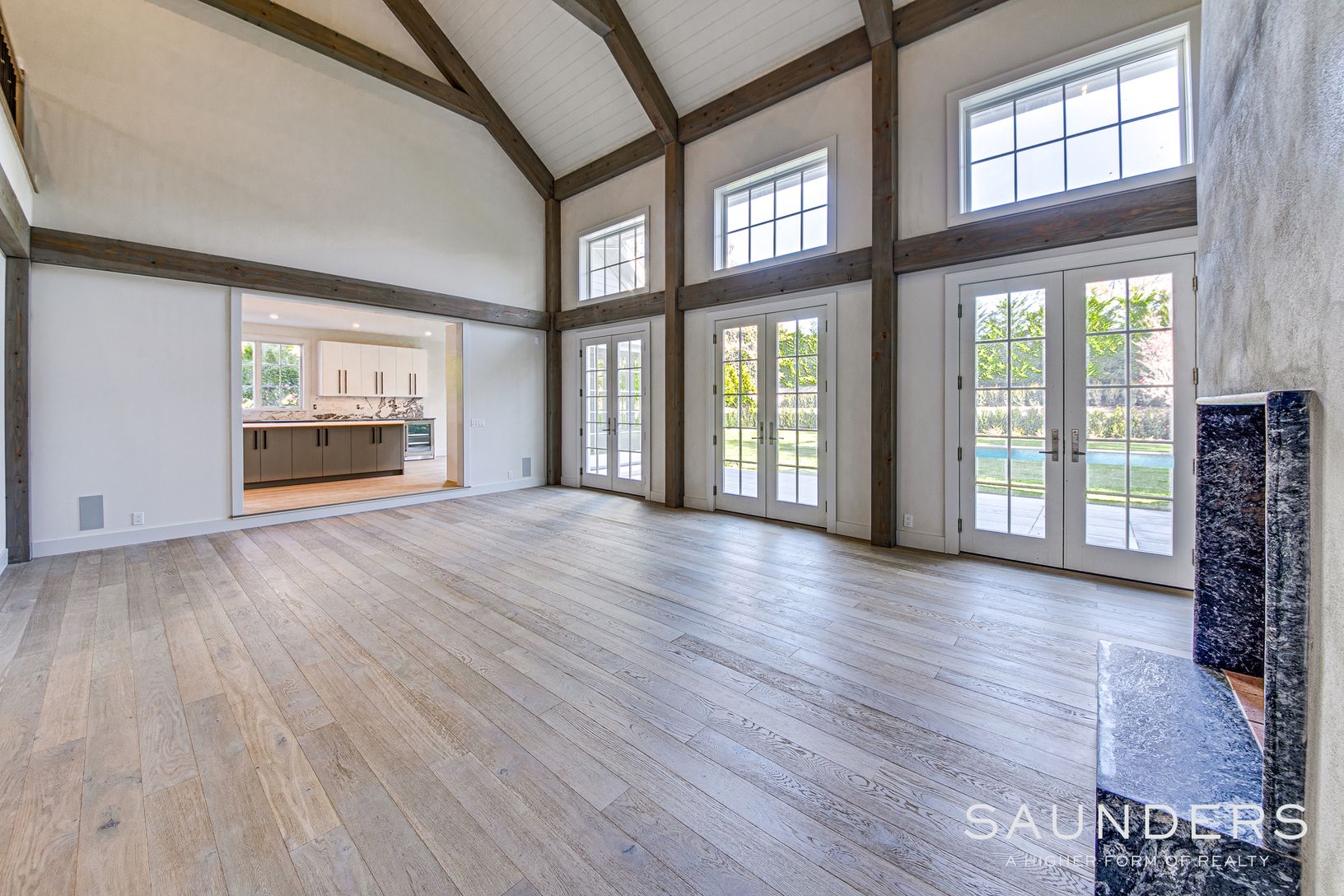 On East Hampton's Cove Hollow Road an exceptional home is now move in ready! This custom Yankee Barn post and beam home, the latest offering from award-winning architectural designer Jeffrey Rosen, and built by Gerard Mingino G.C., The home provides 6,421+/- sq. ft. of living space on 3 levels with 7 bedrooms, 6 full and 2 half baths. The home's centerpiece is an astonishing soaring 3-story great room where magnificent Douglas fir beams and a