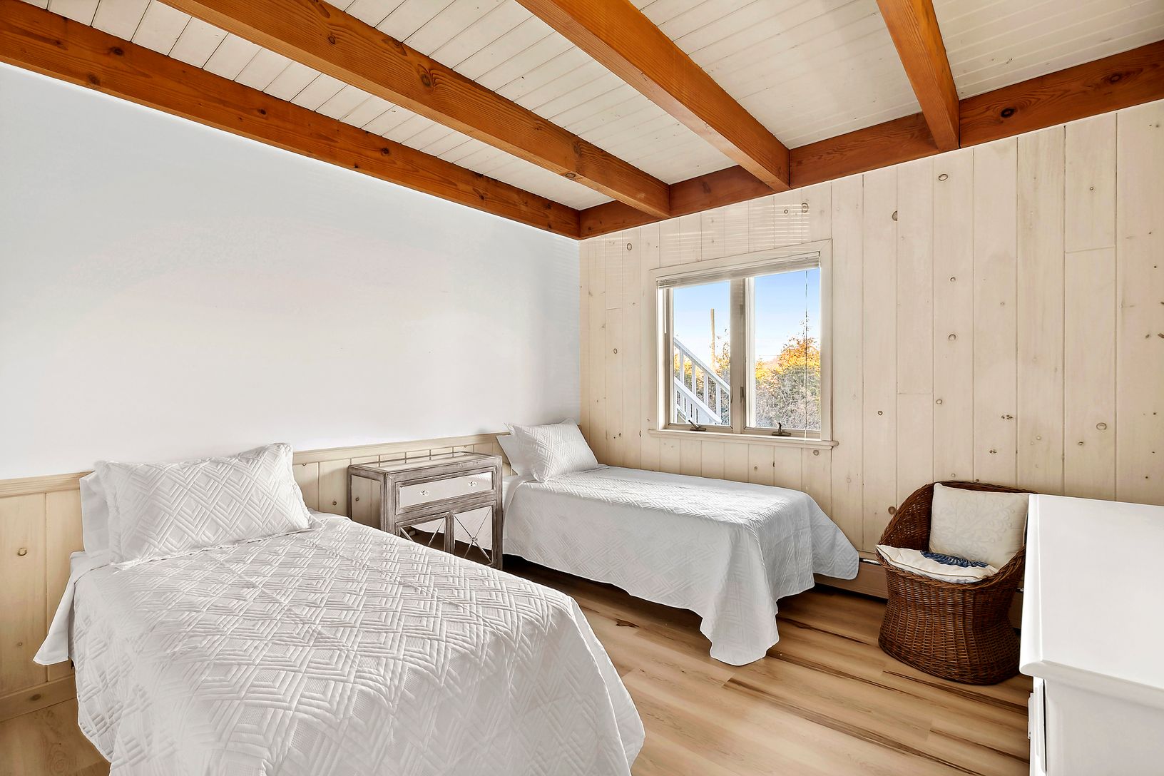 Tucked away on the shores of Fort Pond Bay, this well-kept 2,500 sq. ft. residence offers breathtaking water vistas and unforgettable sunsets. The first level features three bedrooms, two of which open directly onto a sheltered patio with panoramic bay views, along with a full bathroom. Upstairs, an expansive living room with a cozy wood-burning stove flows seamlessly into the dining area and fully equipped kitchen. Sliders open onto a generou