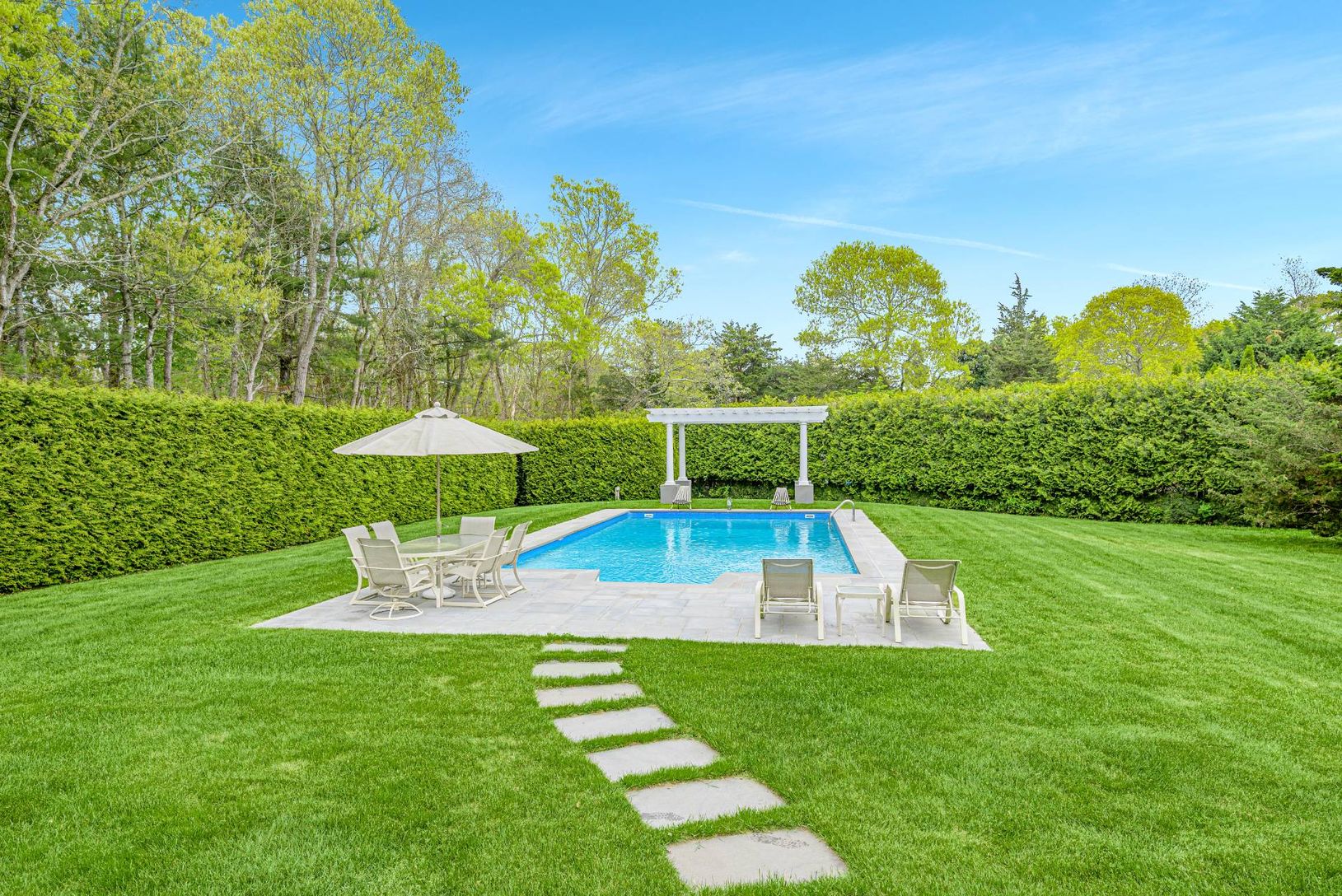 Experience gracious summer living in the beautiful hamlet of Quiogue. Tucked away and incredibly private, this home exudes elegance and comfort, providing ample space for gatherings, entertaining, and simply unwinding to enjoy the best of the Hamptons. Thoughtfully designed and tastefully decorated, it offers an easy and sophisticated lifestyle. Shielded by tall hedgerows for ultimate privacy, the entrance is impressive and dignified. The main