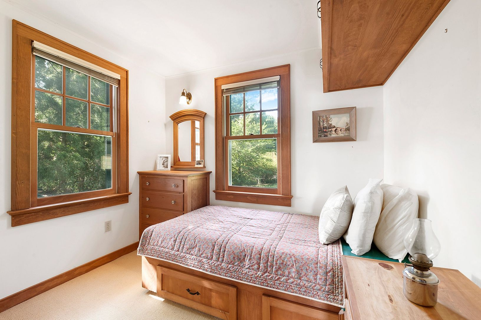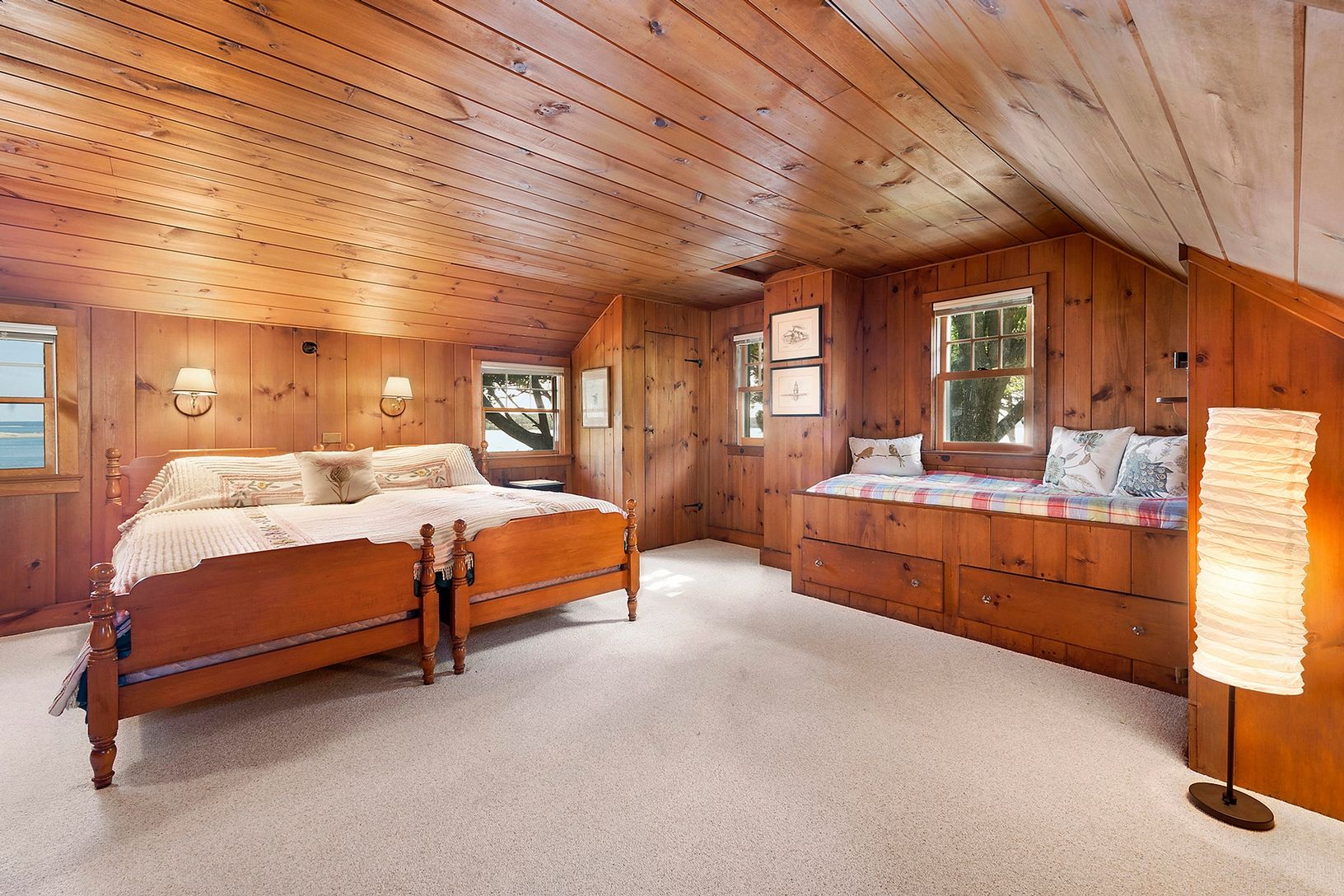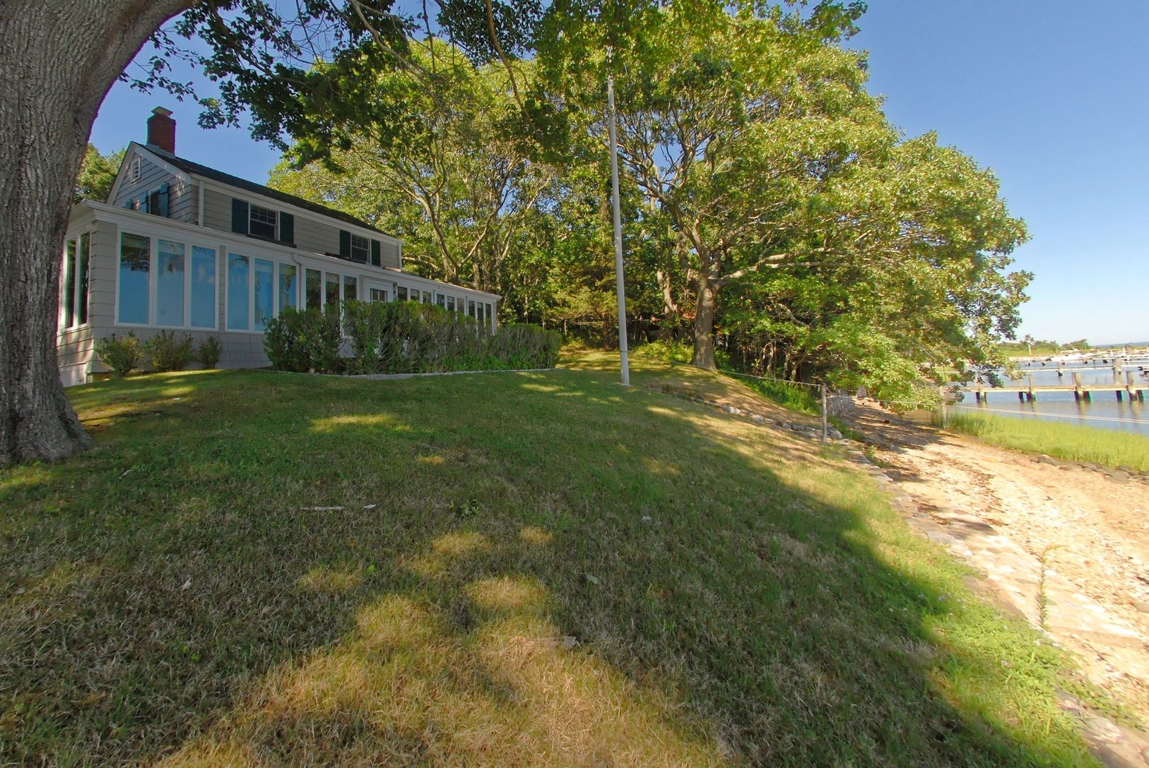 Located on desirable Ram Island along a private road facing Mashomack Preserve, this iconic 1934 cape is being offered as a package with three additional lots, one with guest cottage and garage and two vacant lots each approximately .27+/- acres. From a gentle elevation with stone patio and steps leading to the shoreline with fieldstone bulkhead and floating dock, the perspective from this well cared for 1,222+/- sq. ft. cottage is serene and