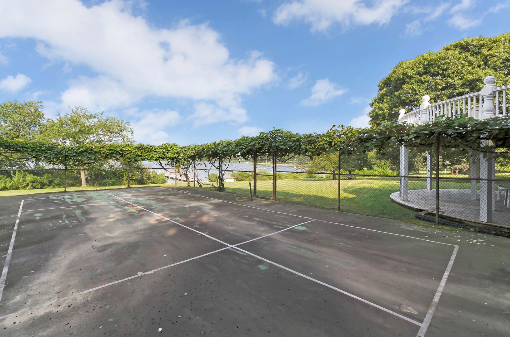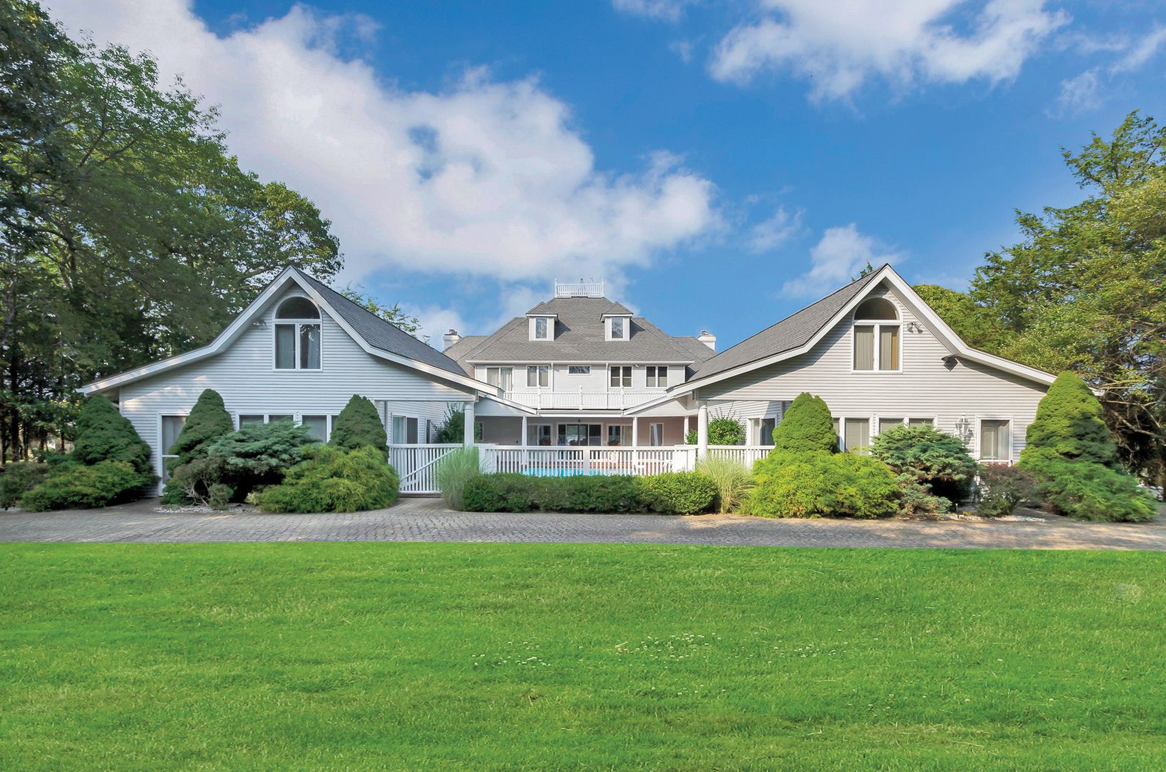 Located on historic Westmoreland Farms peninsula on West Neck Bay, this glorious traditional boasts four levels of living space and is ready for its next owner. Sited on one acre, the cobblestone circular driveway leads to a sunny courtyard with gardens and pool with mahogany entertainment decks and shaded lounge area, which are flanked by two guest suites, one with kitchenette. The main entry opens to a welcoming foyer with water views to the