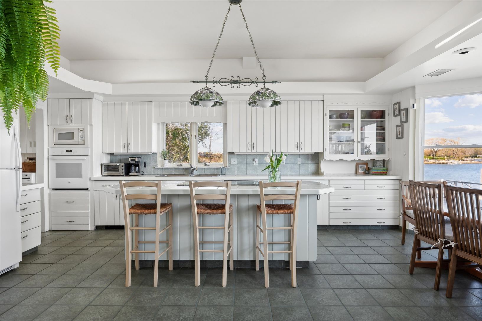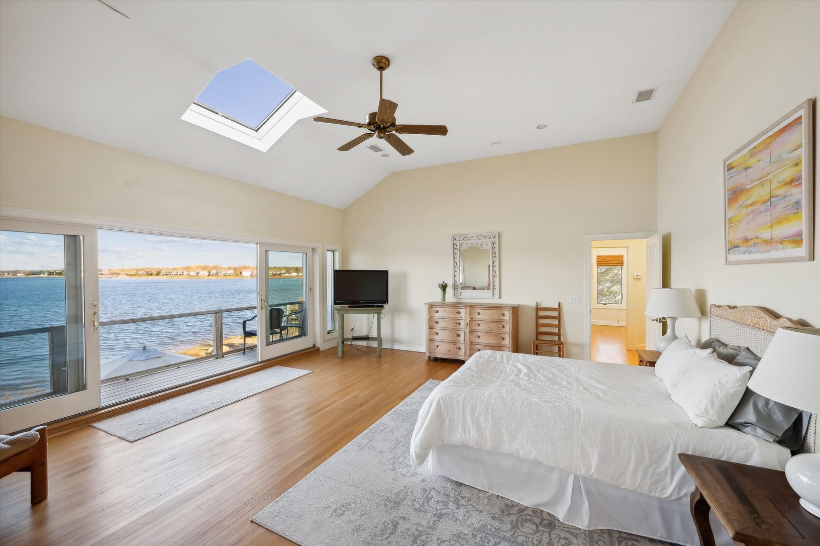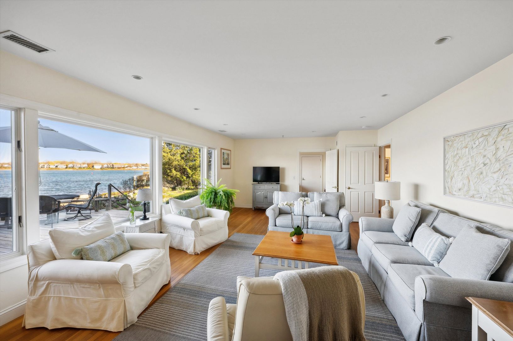 Welcome to waterfront living at its finest in prestigious Bay Point! This stunning 4-bedroom home offers panoramic views of Sag Harbor village and with its dock, it's a true boater's paradise. As you enter, you're greeted by a charming entryway with a sitting area, setting the tone for the relaxed elegance that awaits. The spacious living room features a cozy fireplace - the perfect setting for gathering with loved ones, and the adjacent kitch